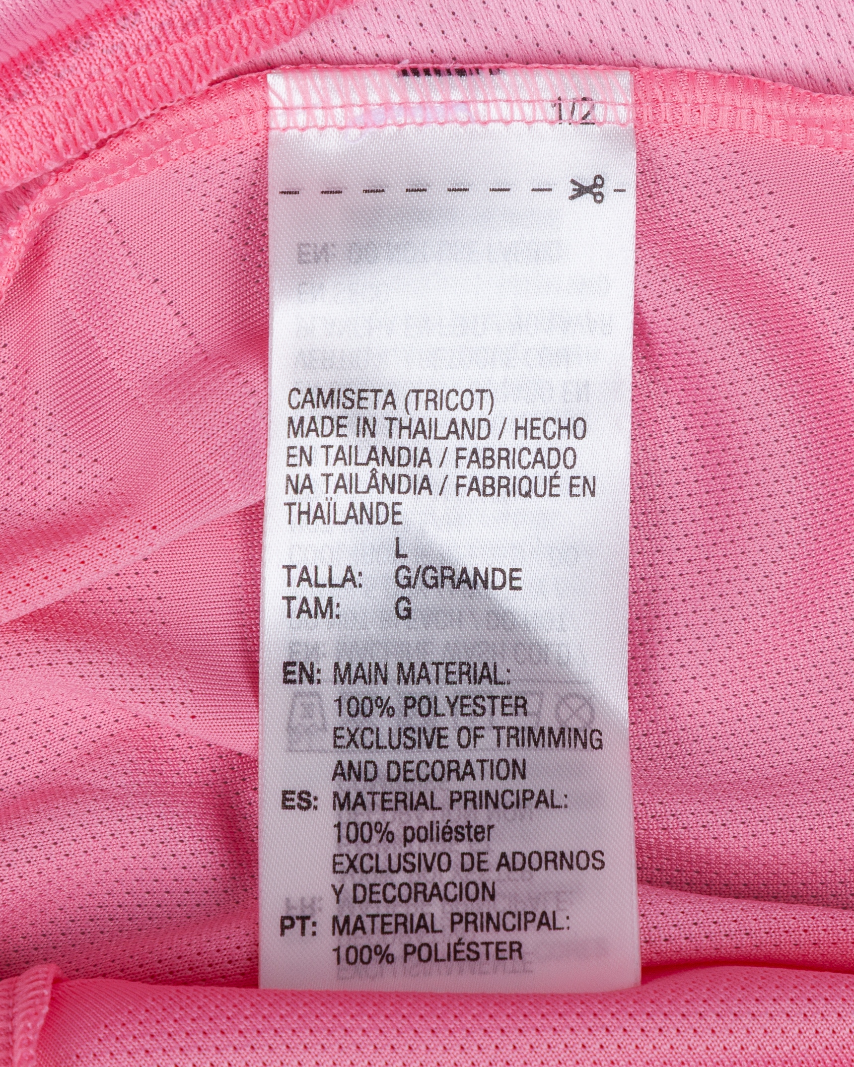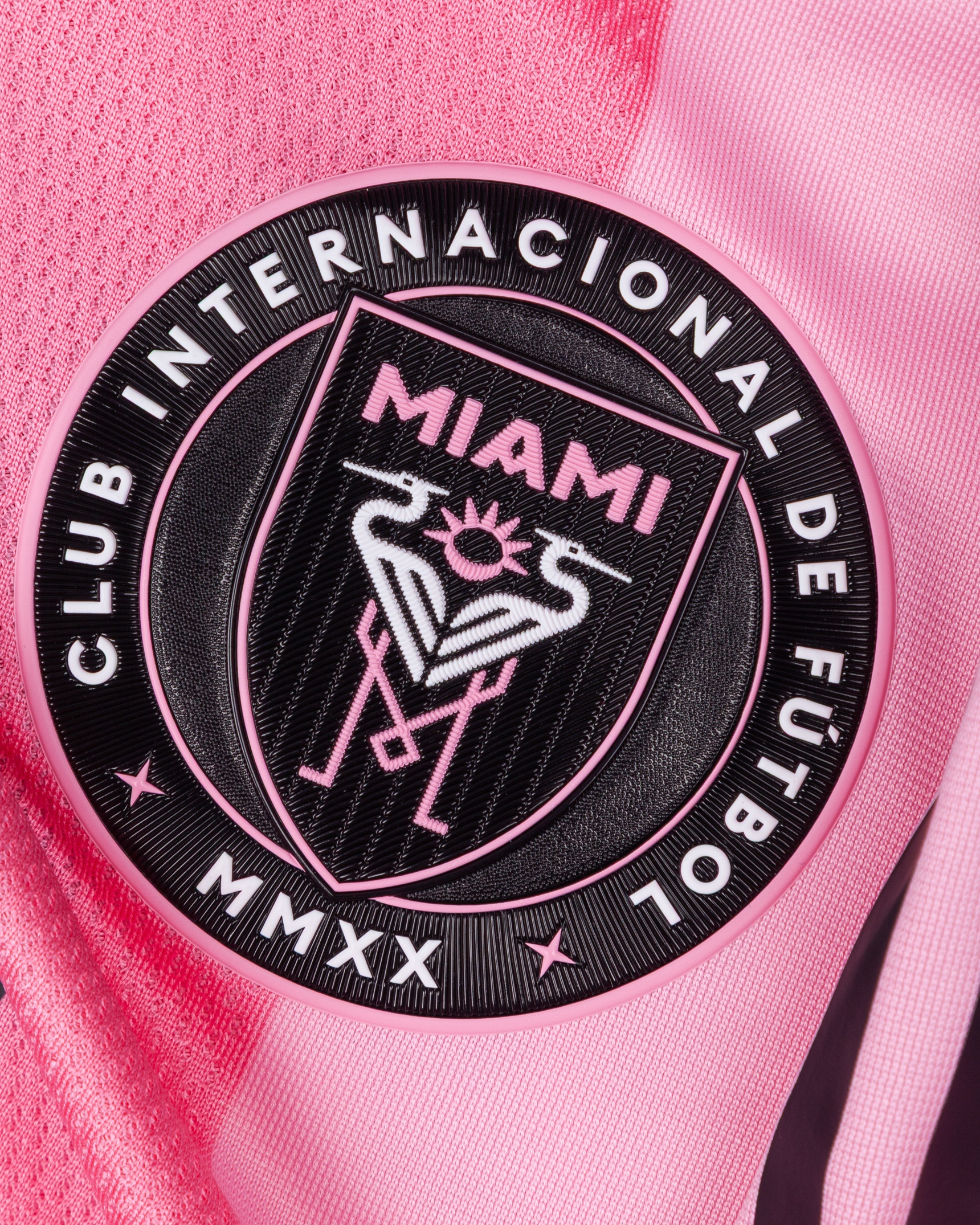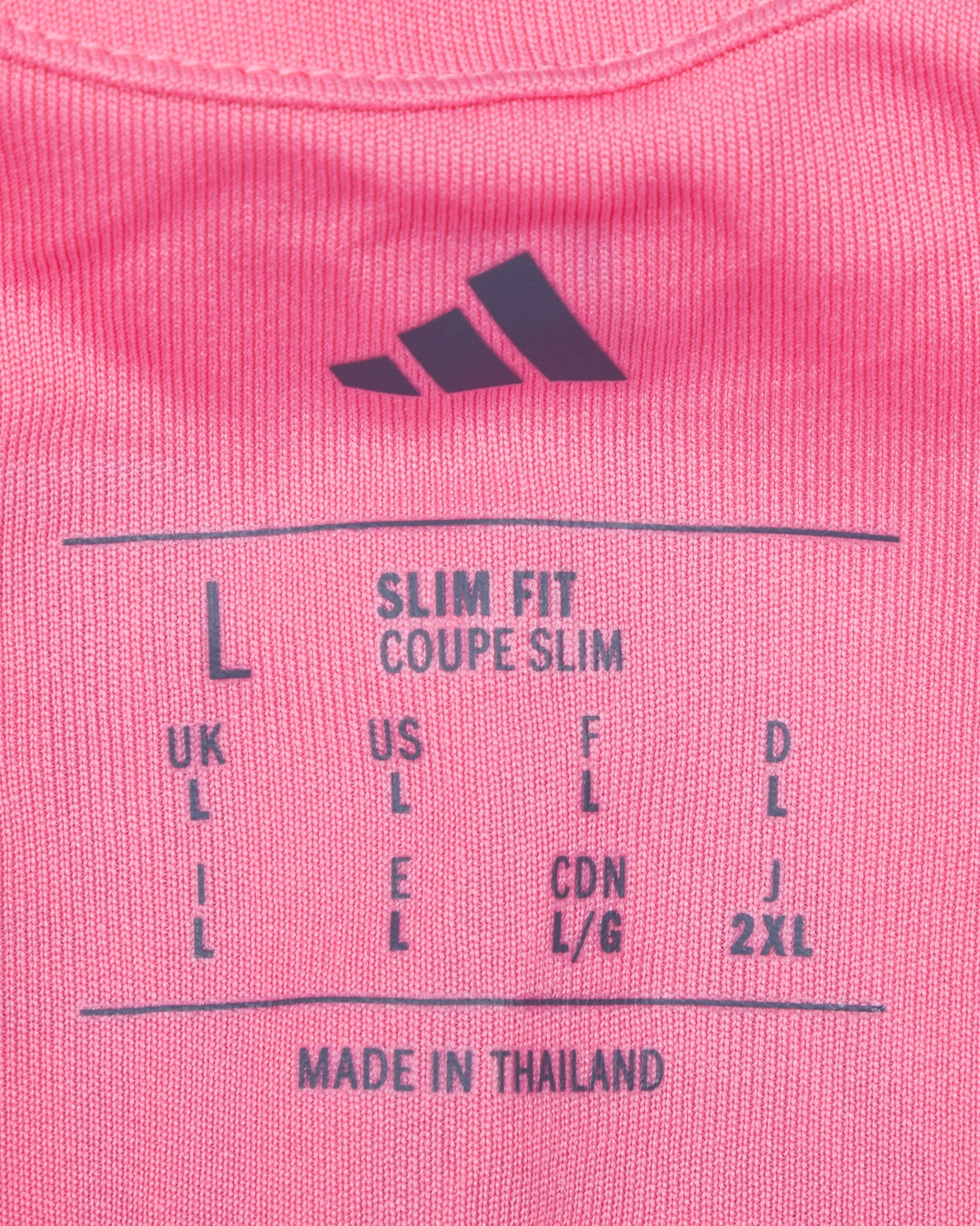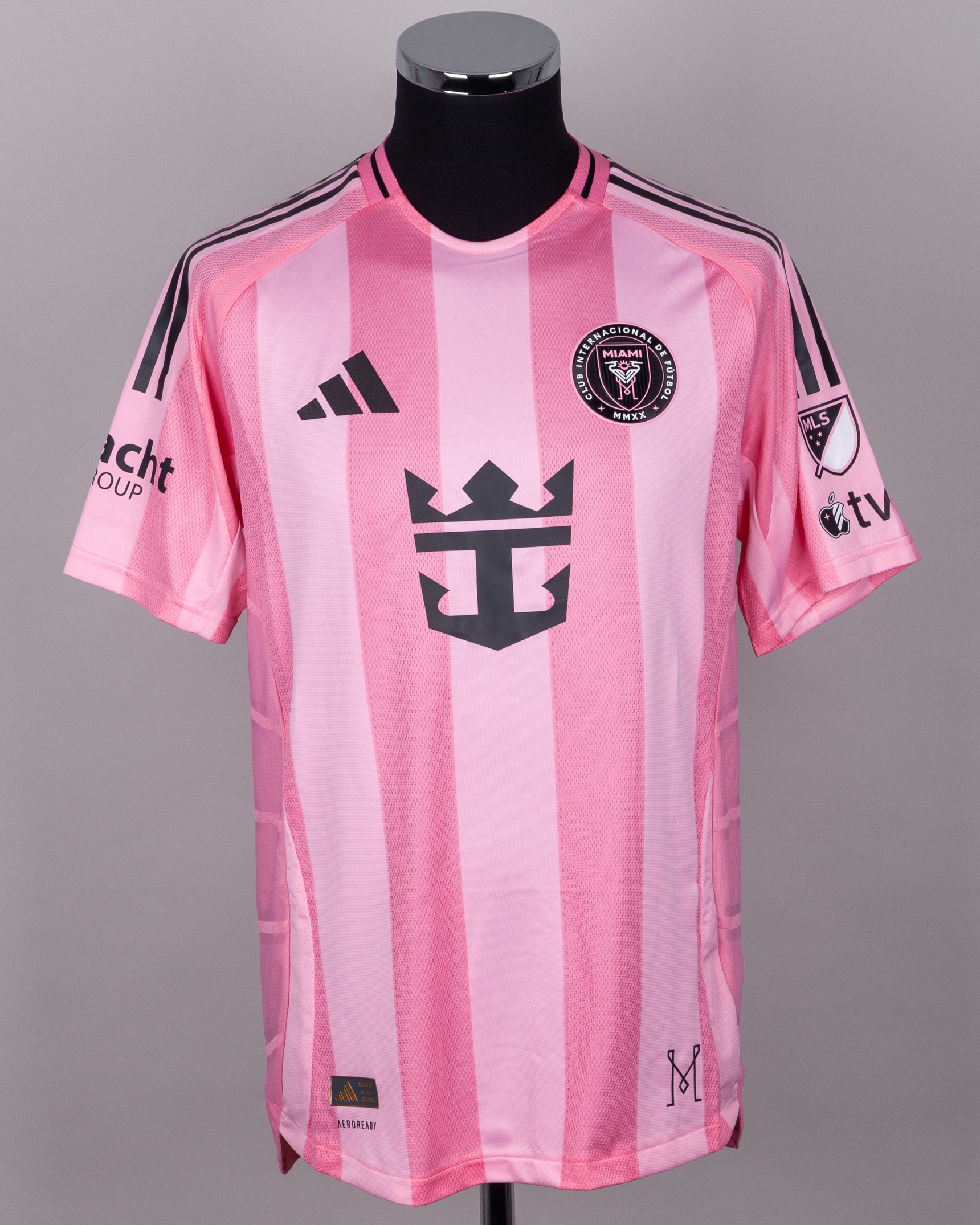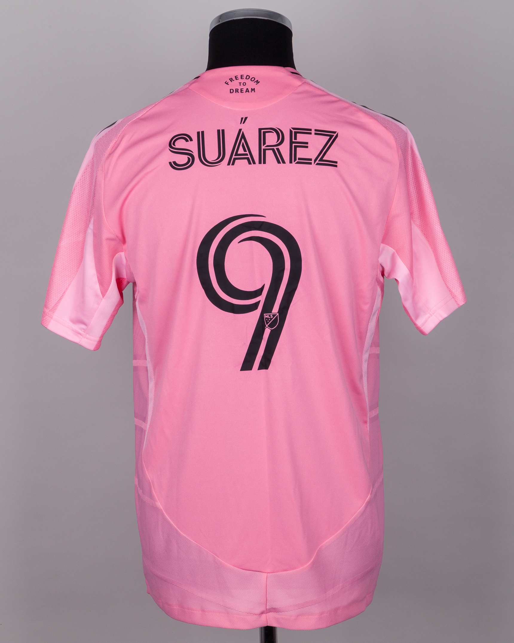 Luis Suarez pink No.9 Inter Miami short-sleeved shirt, 2025, Adidas, L, with crew-neck collar and printed badge, the reverse lettered SUAREZ, the left sleeve with MLS flash