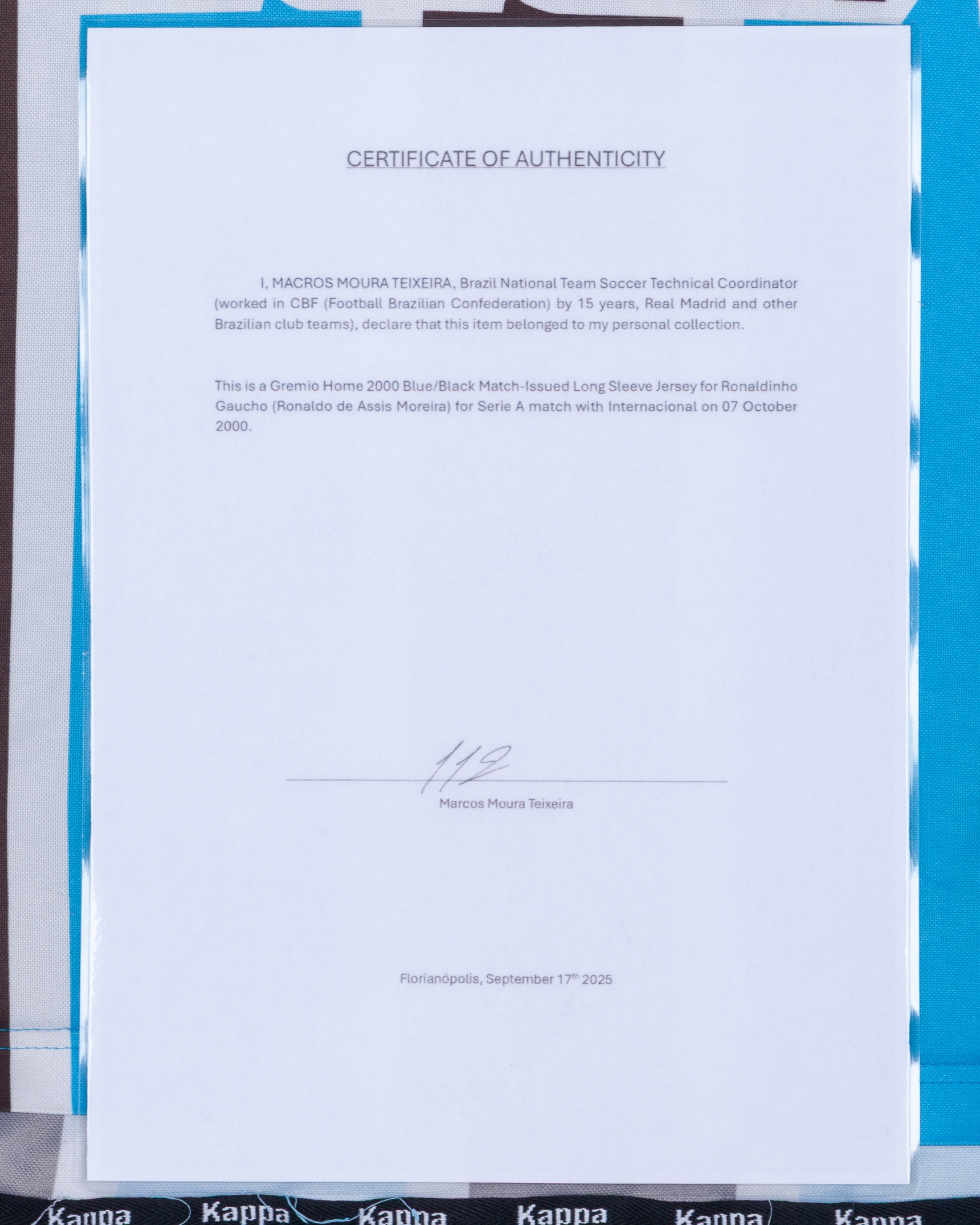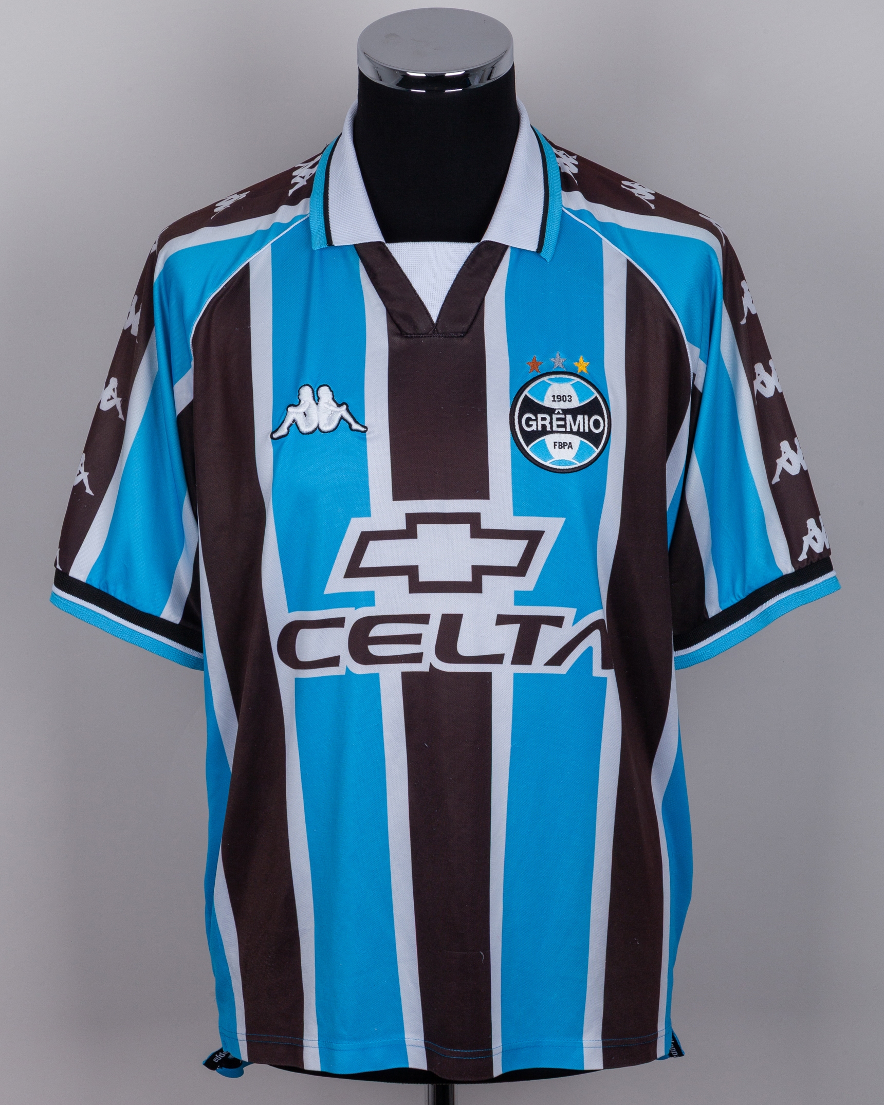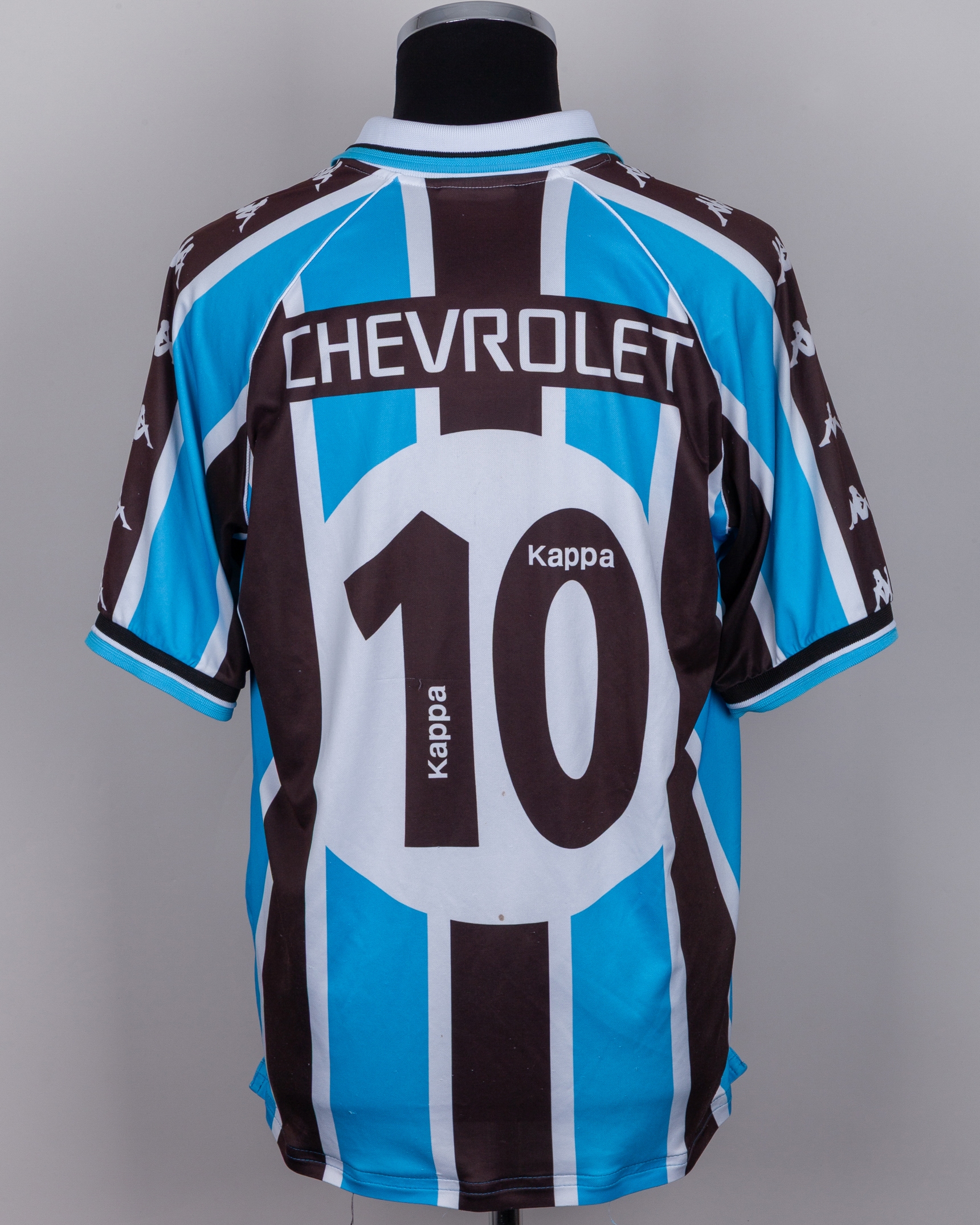 Ronaldinho blue and black No.10 Gremio short-sleeved shirt, 2000, Kappa, G, with v-neck style collar and embroidered cloth badge inscribed GREMIO 1903 FBPA, with COA, with some staining and pulls