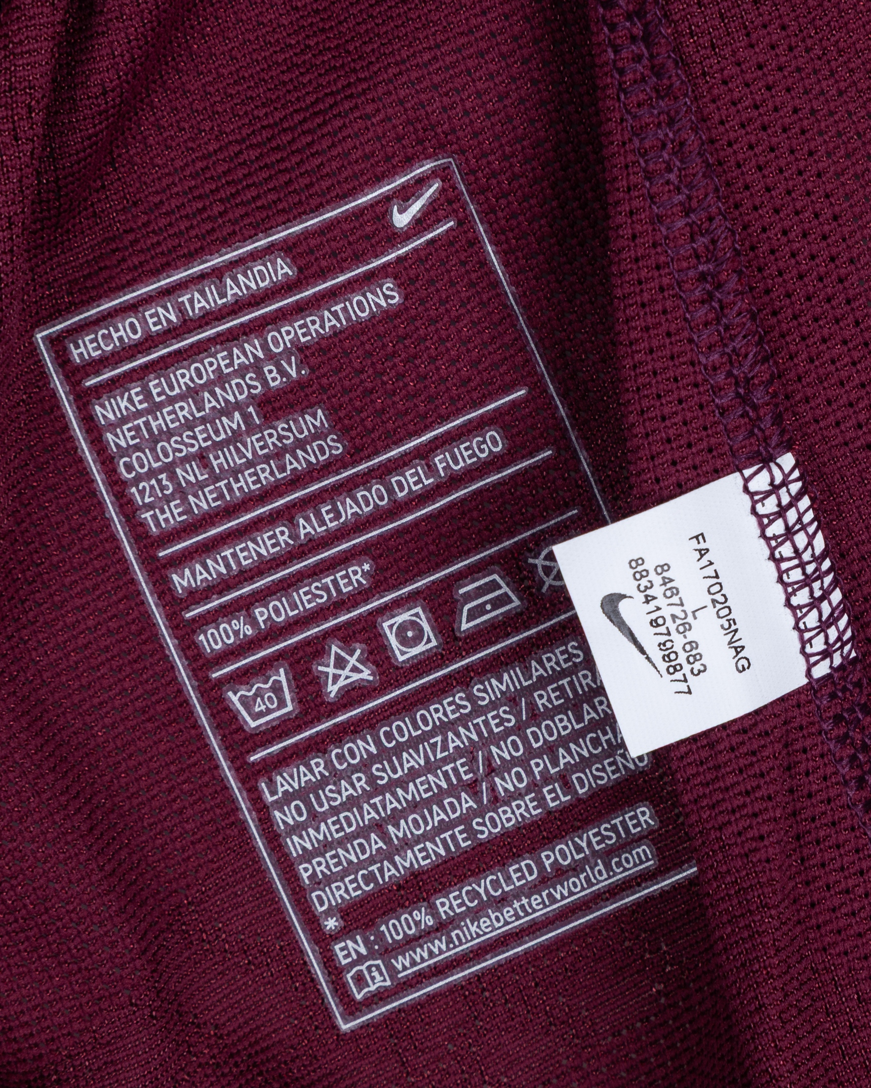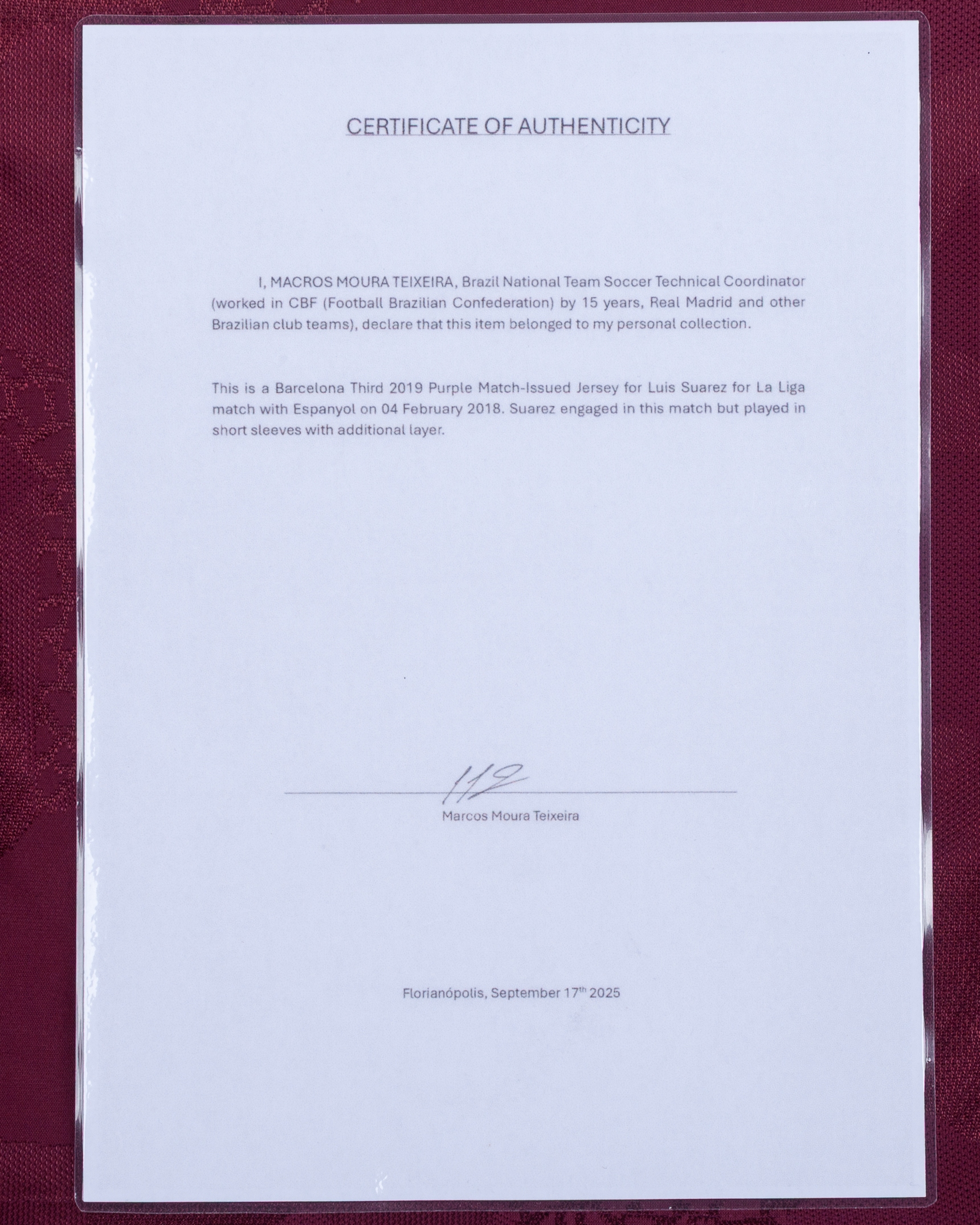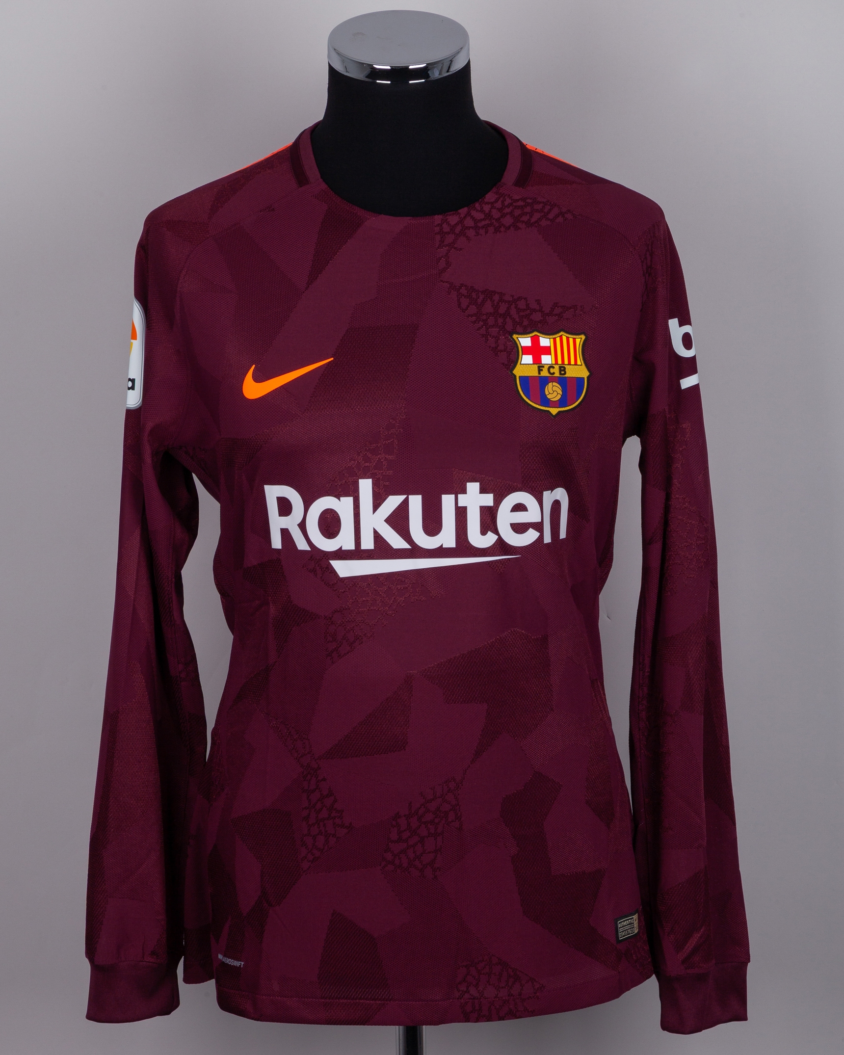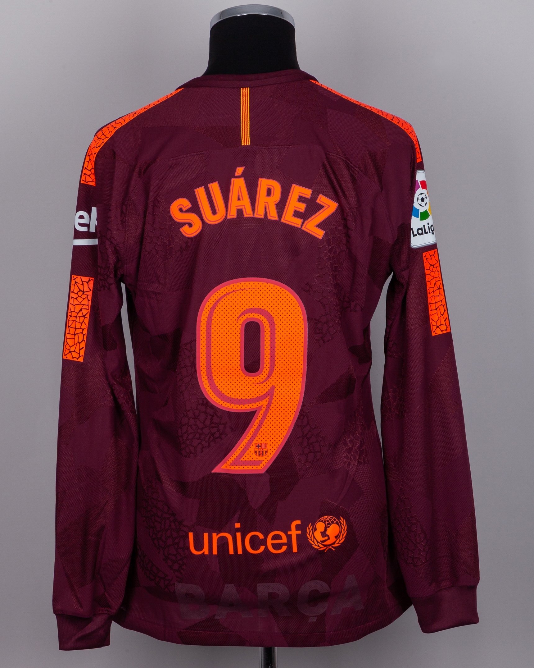 Luis Suarez maroon No.9 Barcelona v. Espanyol long-sleeved shirt, 2018, Nike, L, with crew-neck collar and printed badge, the reverse lettered SUAREZ, the right sleeve with La Liga flash, with COA