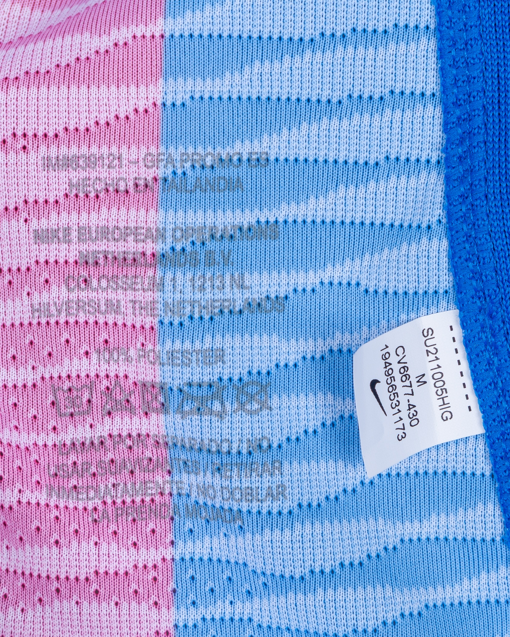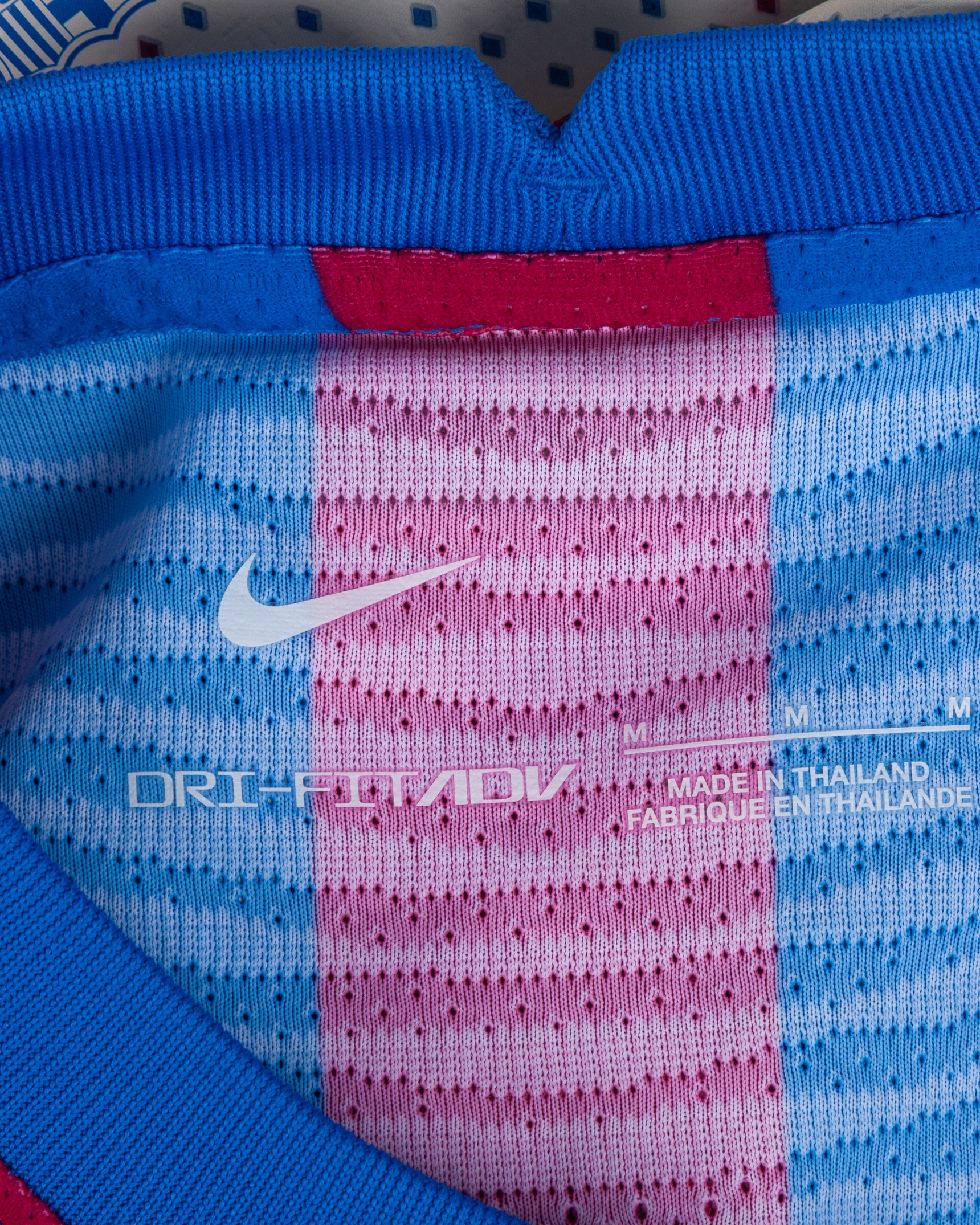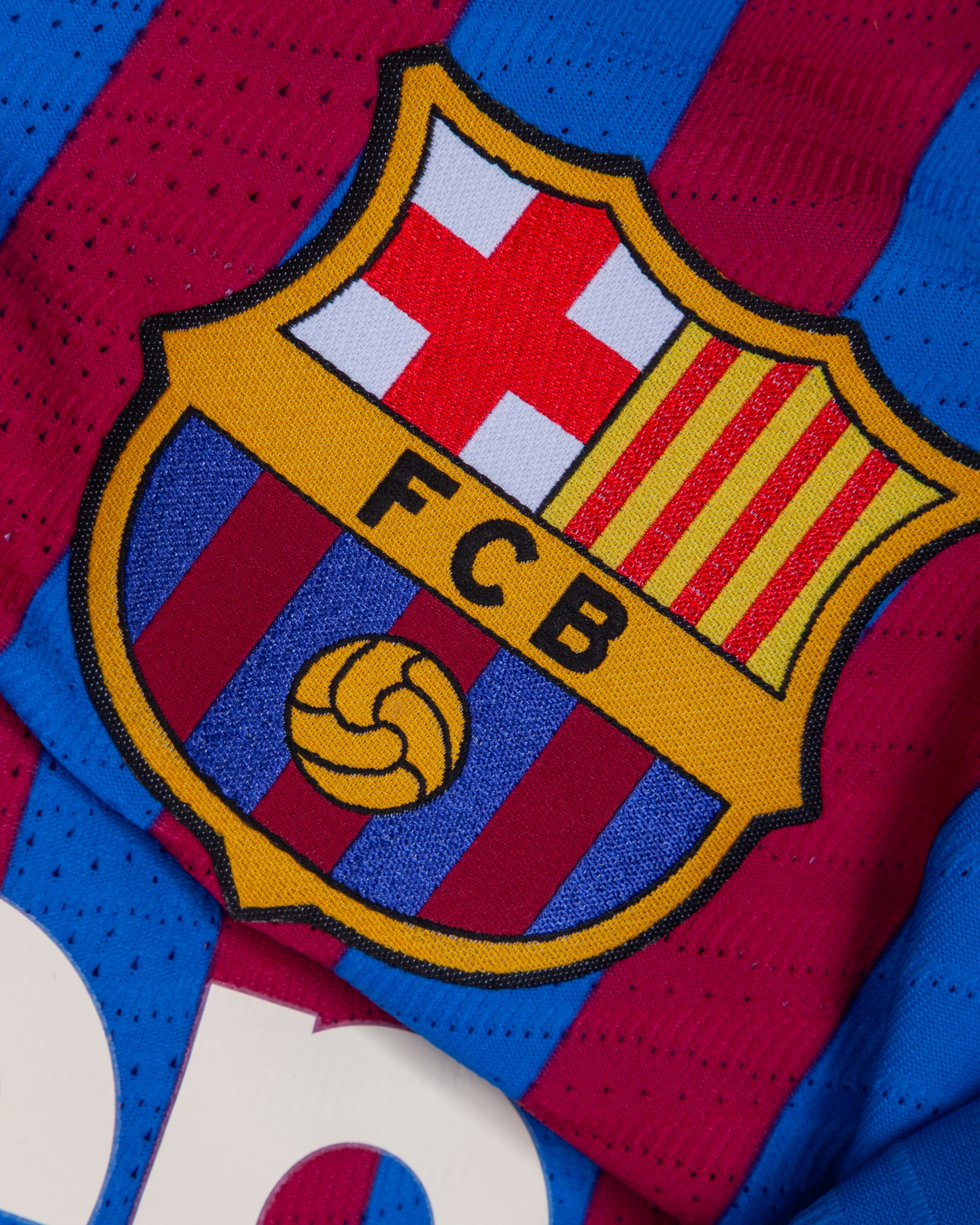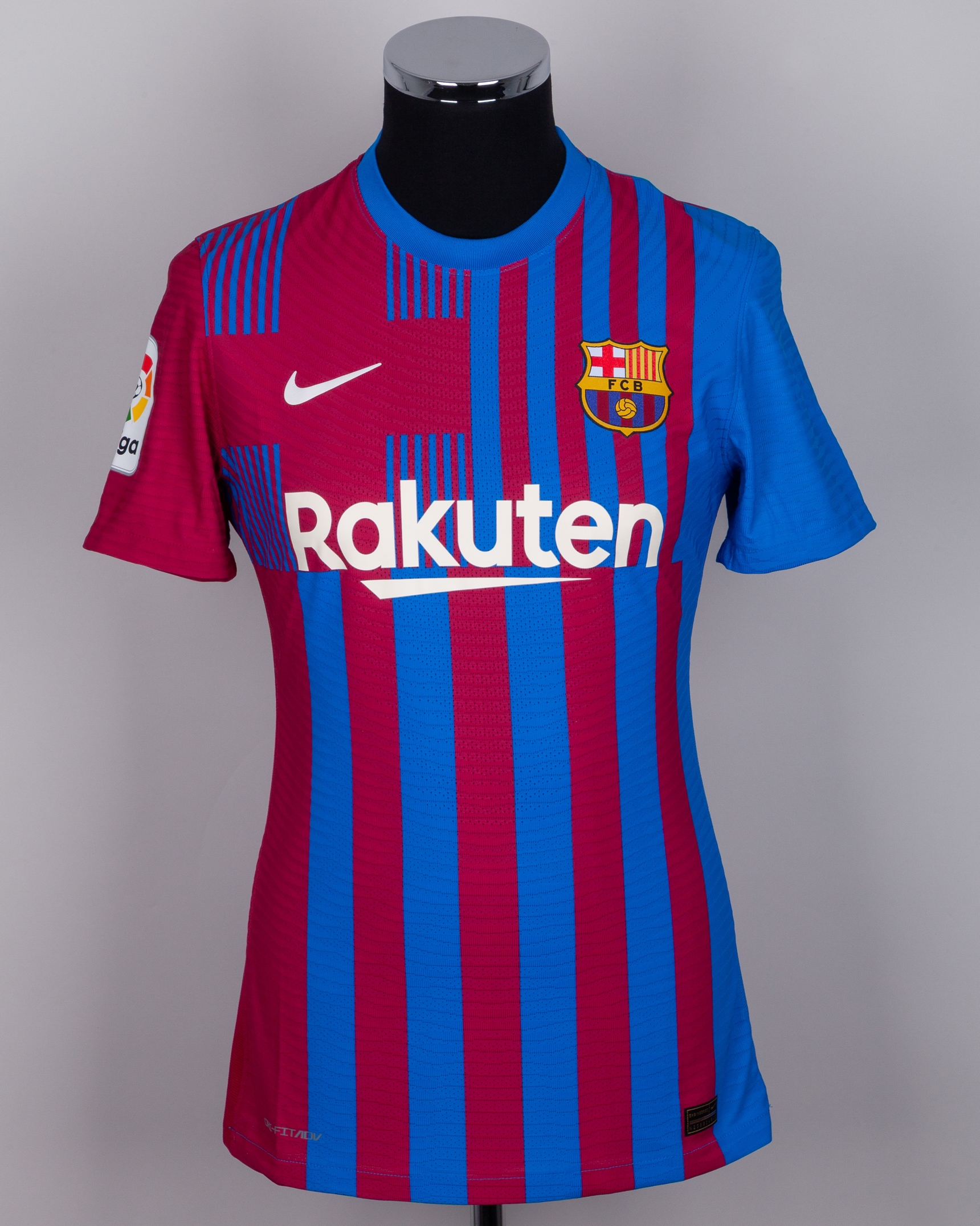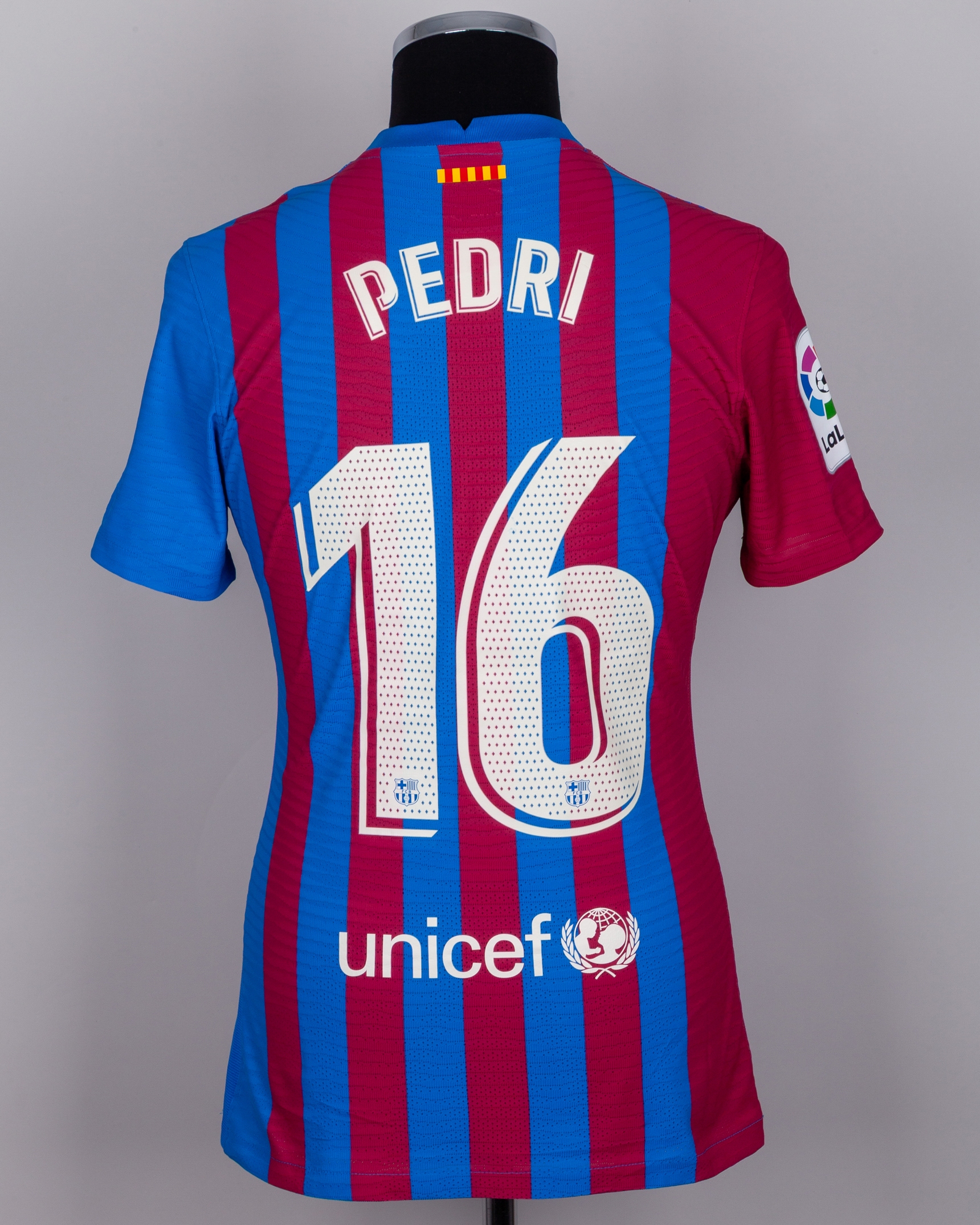 Pedri garnet and blue No.16 Barcelona short-sleeved shirt, 2021-22, Nike, M, with crew-neck collar and printed badge, the reverse lettered PEDRI, the right sleeve with La Liga flash