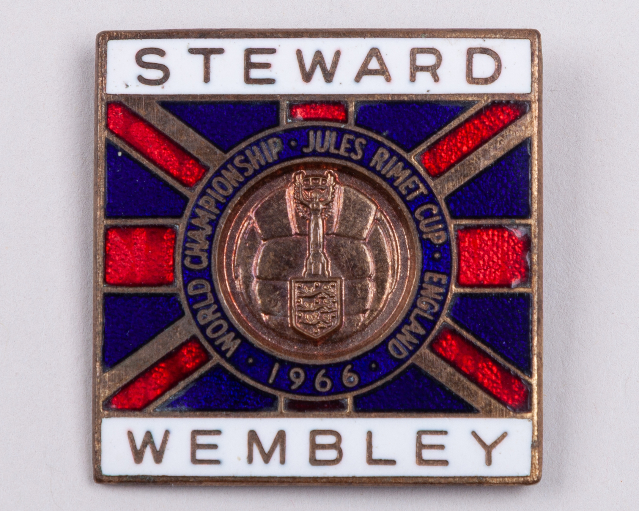 1966 World Cup Wembley steward's badge, gilt-metal & enamel incorporating Union Jack and World Cup insignia design, inscribed STEWARD, WEMBLEY, brooch fitting