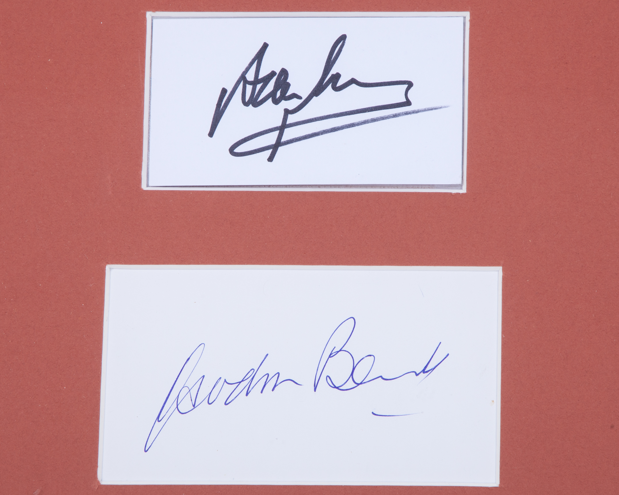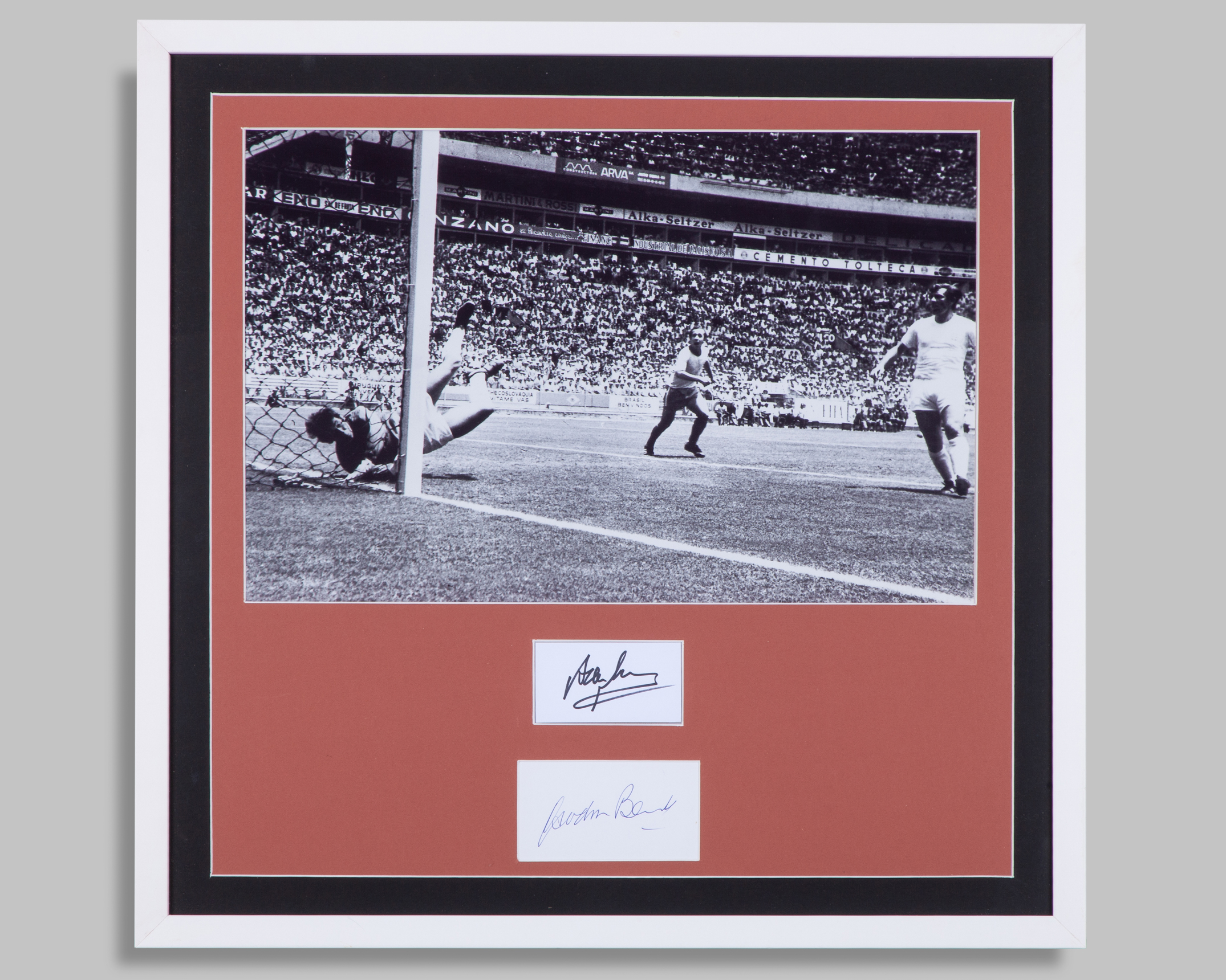 12 by 18in. b&w photograph of the Gordon Banks ‘wonder save’, mounted above the signatures of the two England players in the shot, framed & glazed, 59cm. square
