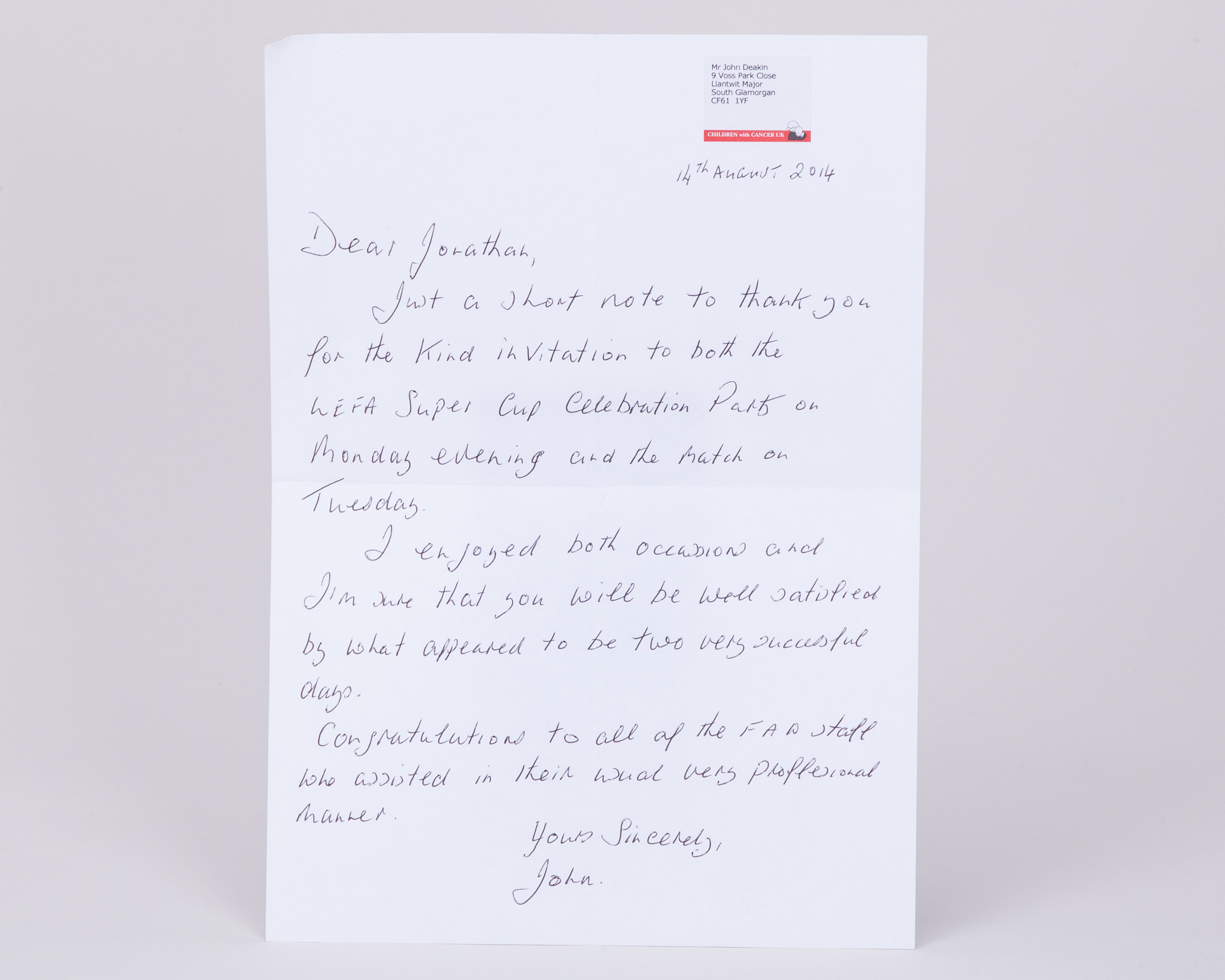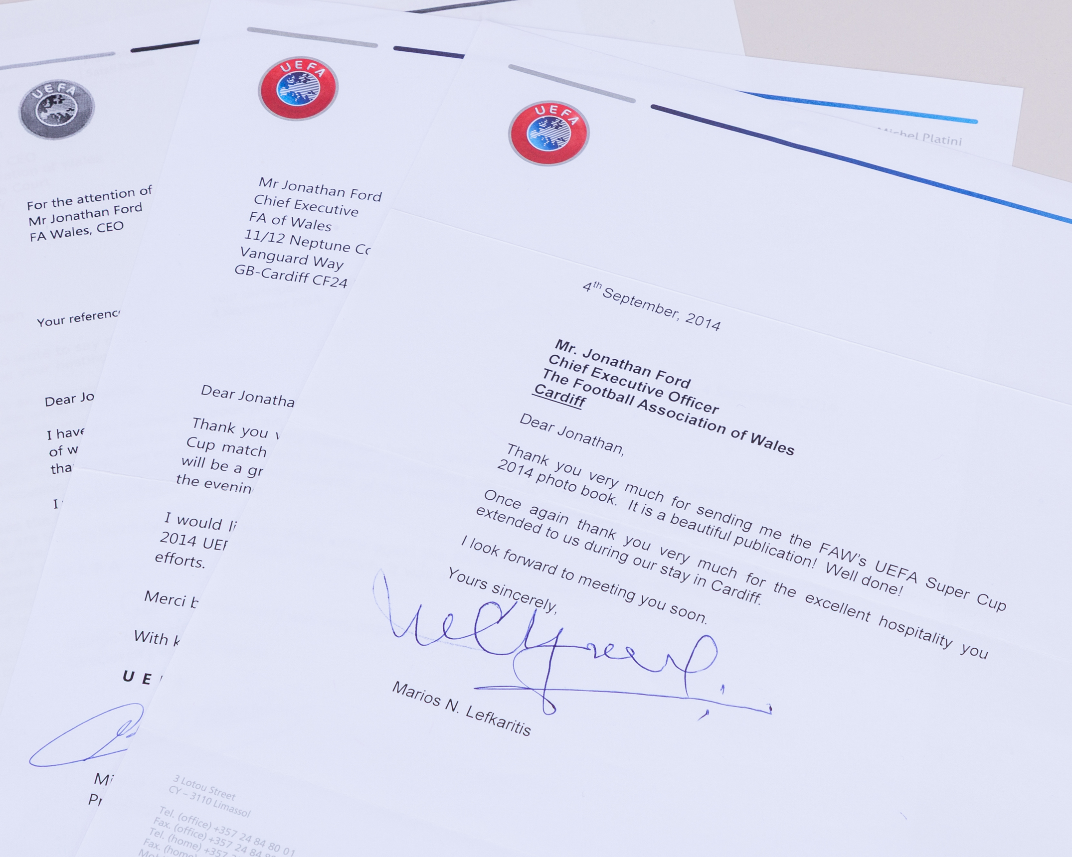 Two Real Madrid v. Sevilla Road to the UEFA Super Cup commemorative books, with letters of thanks to the FA of Wales Chief Executive including one signed in blue ink from UEFA President Michel Platini, three match programmes, team sheets, boxed guest ticket display