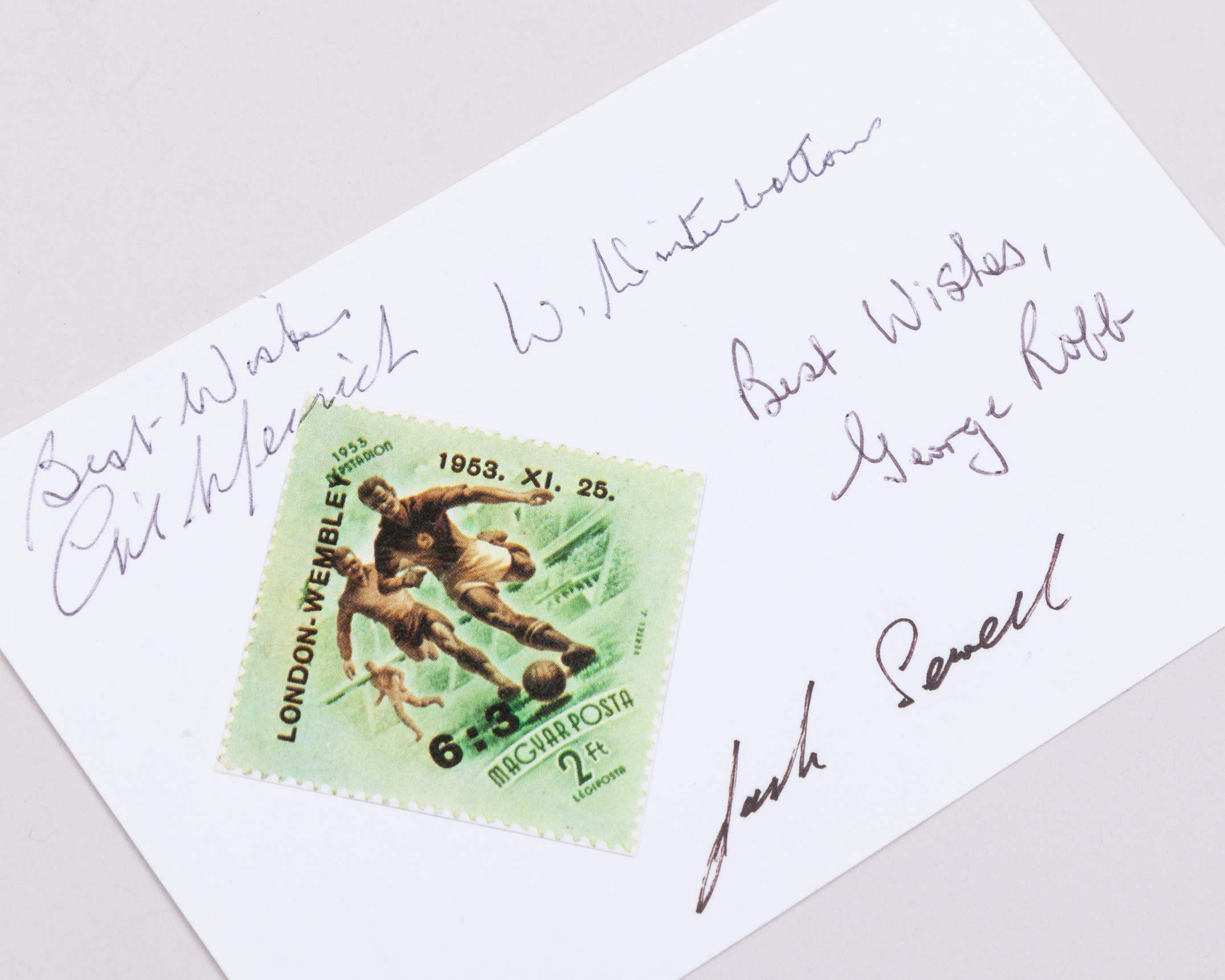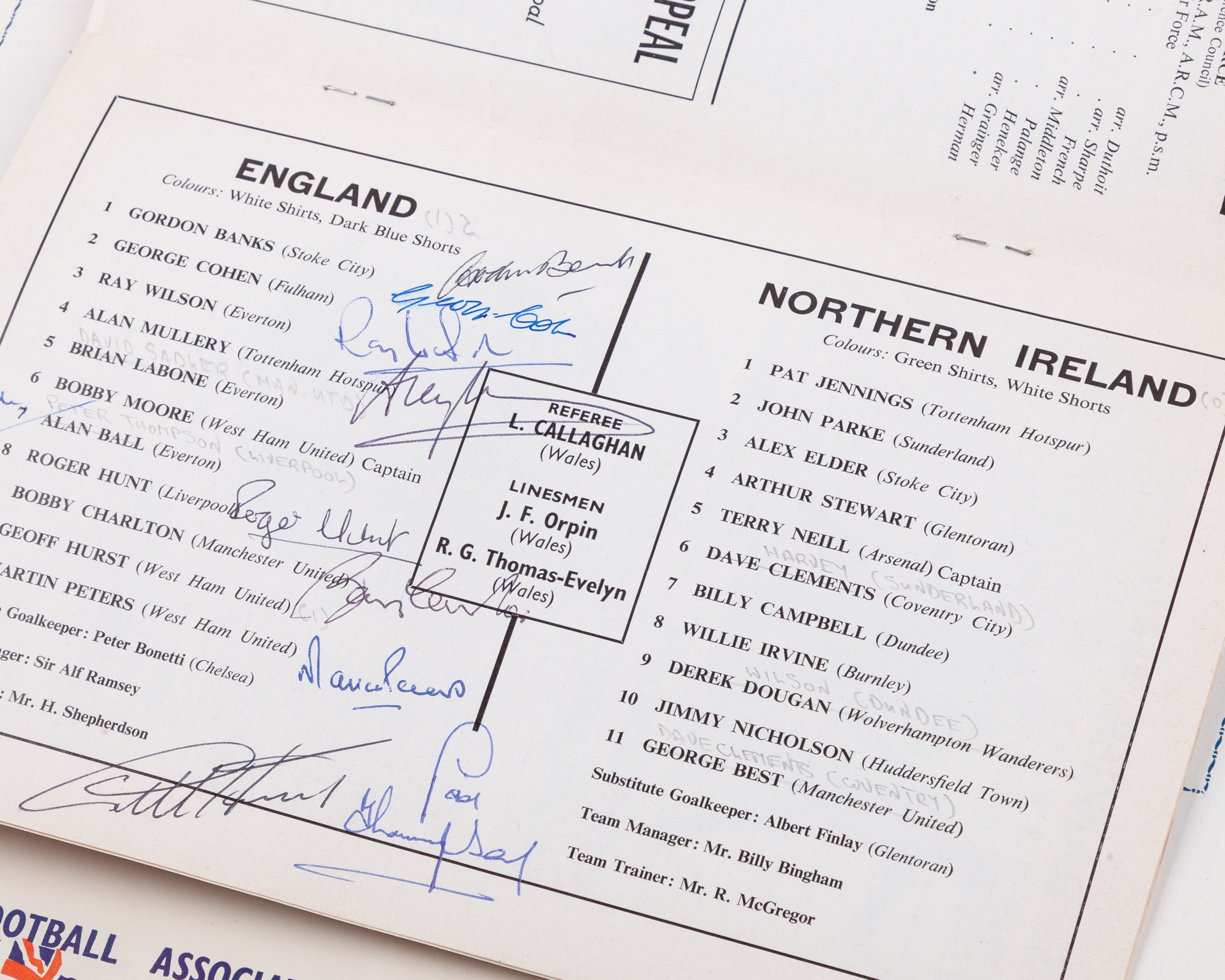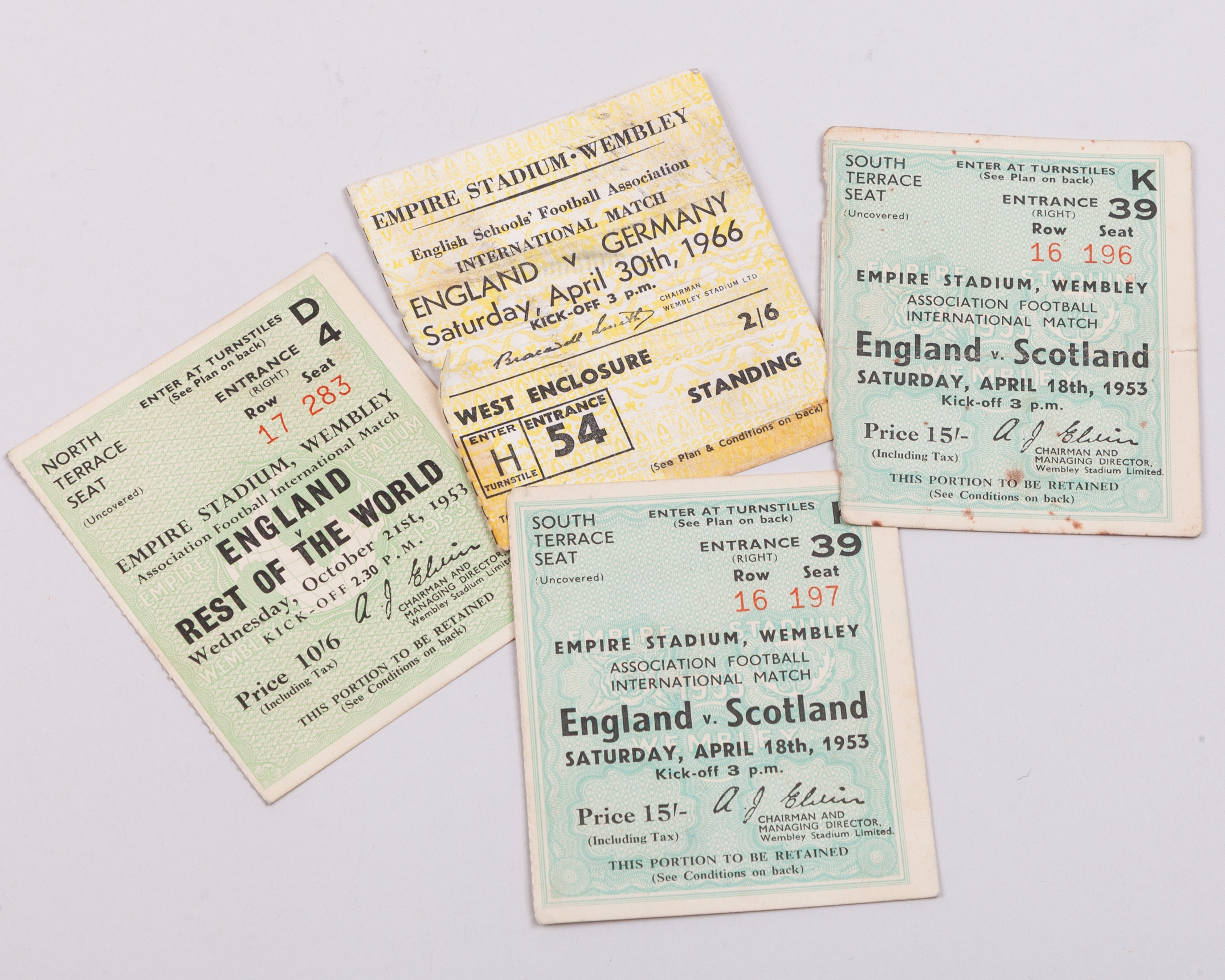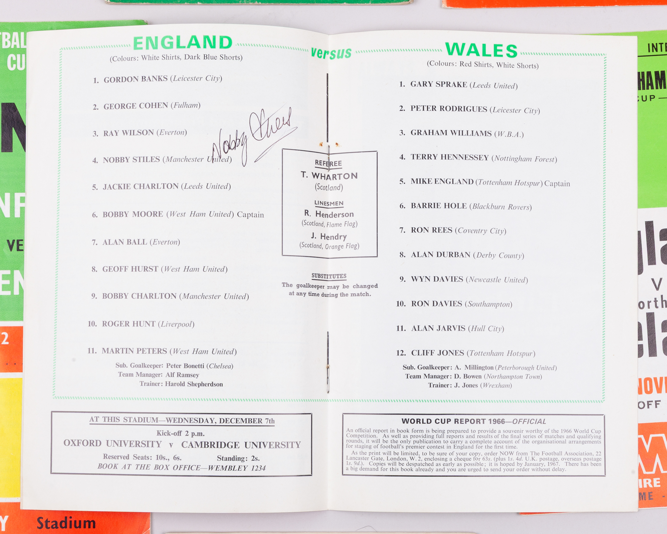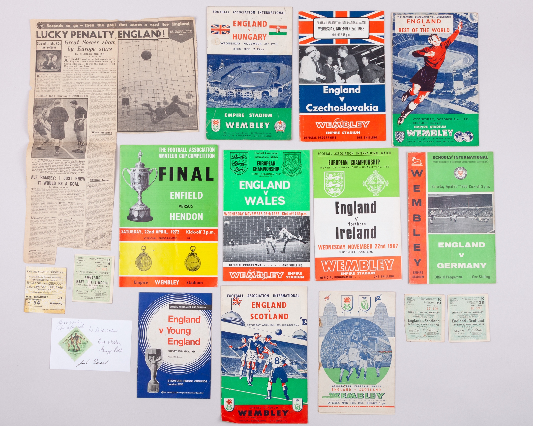 Selection of England International programmes at Wembley, including autographed England v. Scotland 14th April 1951, autographed England v. Czechoslovakia 2nd November 1966, England v. Rest of the World 21st October 1953 with ticket stub etc., three other programmes of matches played at Wembley with two relating to youth football and one amateur, some with annotations
