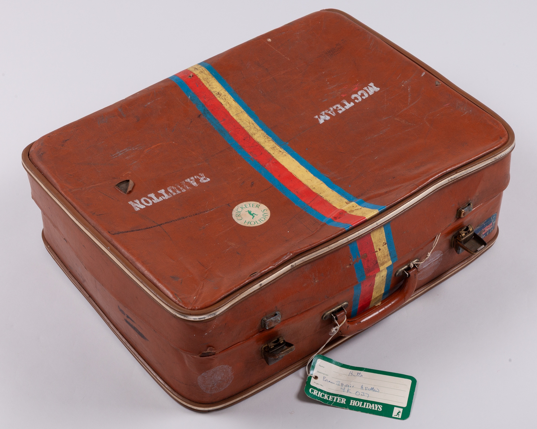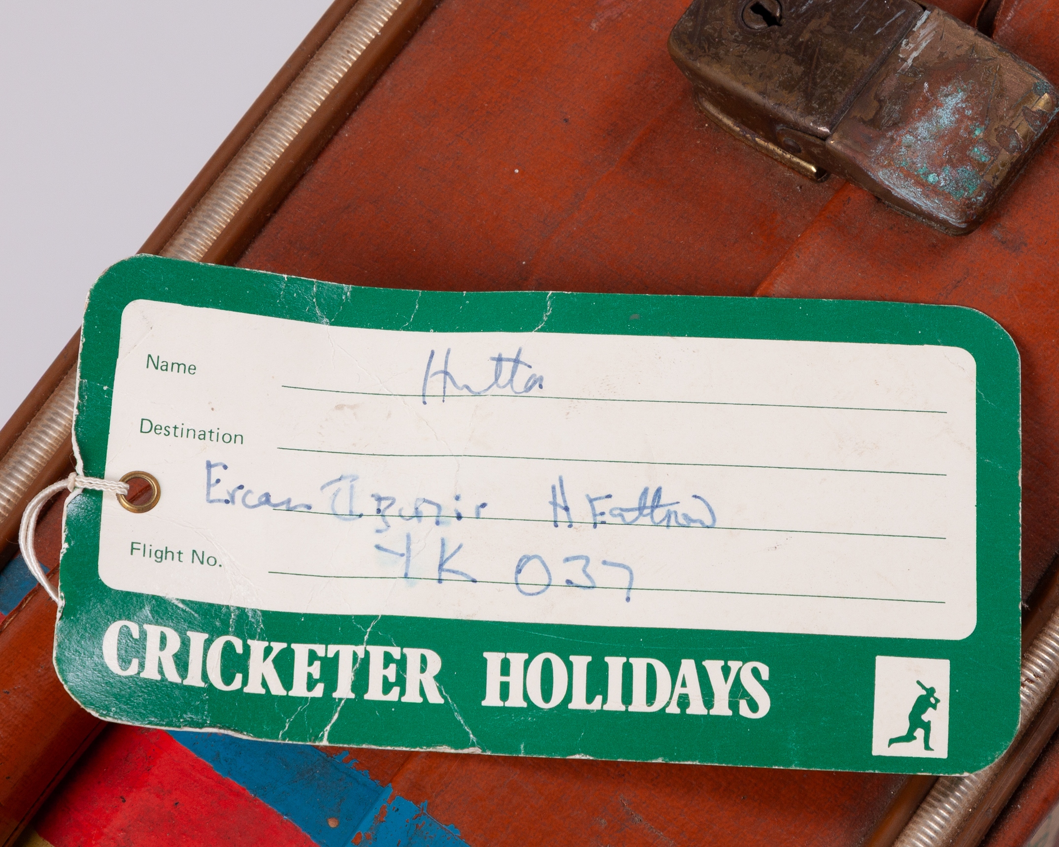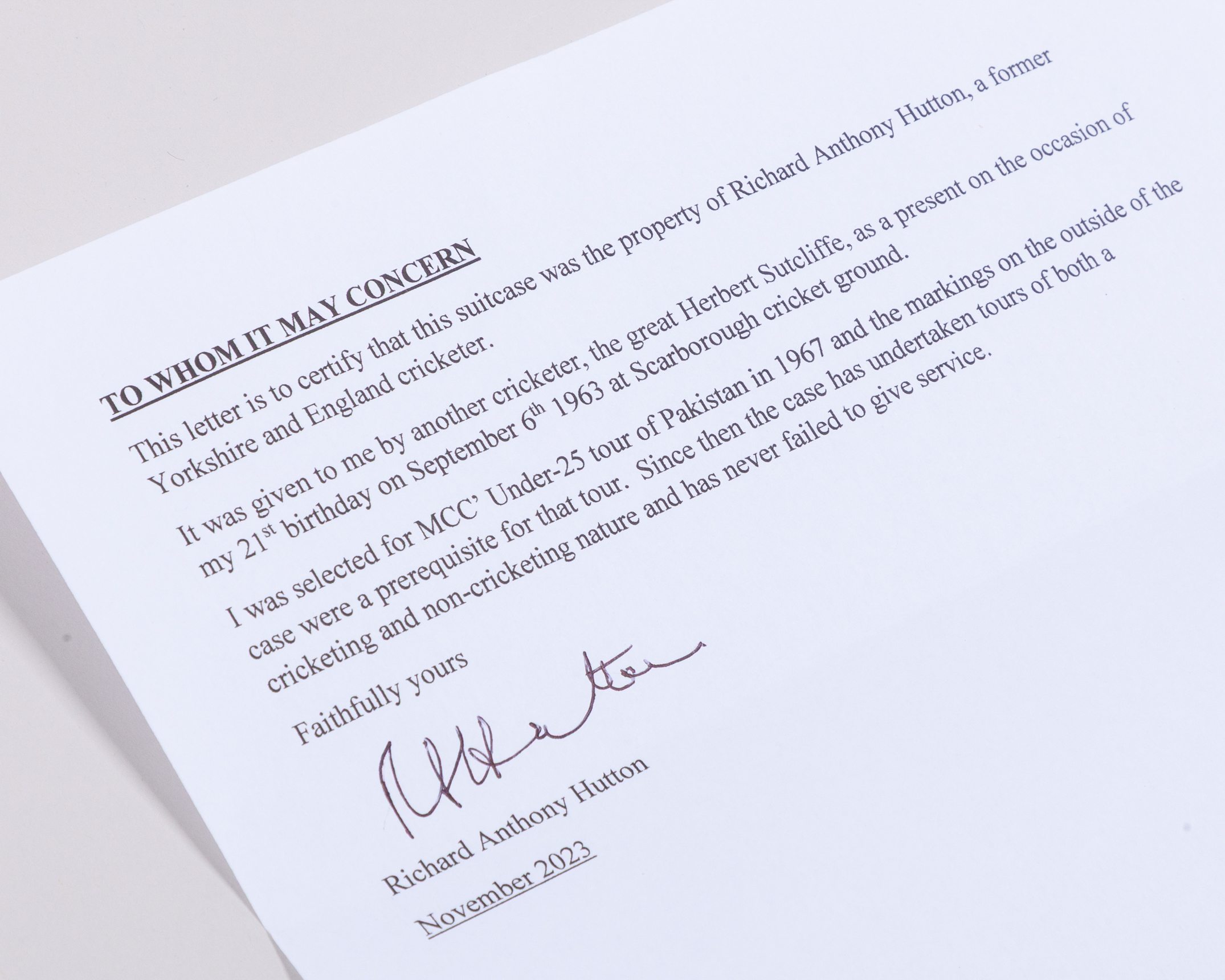 Richard Anthony Hutton brown suitcase by Arthur Barber Bradford, with letter of provenance, well used with staining, discolouration and loose inner lining, two autographed cricket Yellow Pages card including Fred Truman, two autographed cricket annual dinner menus (5)