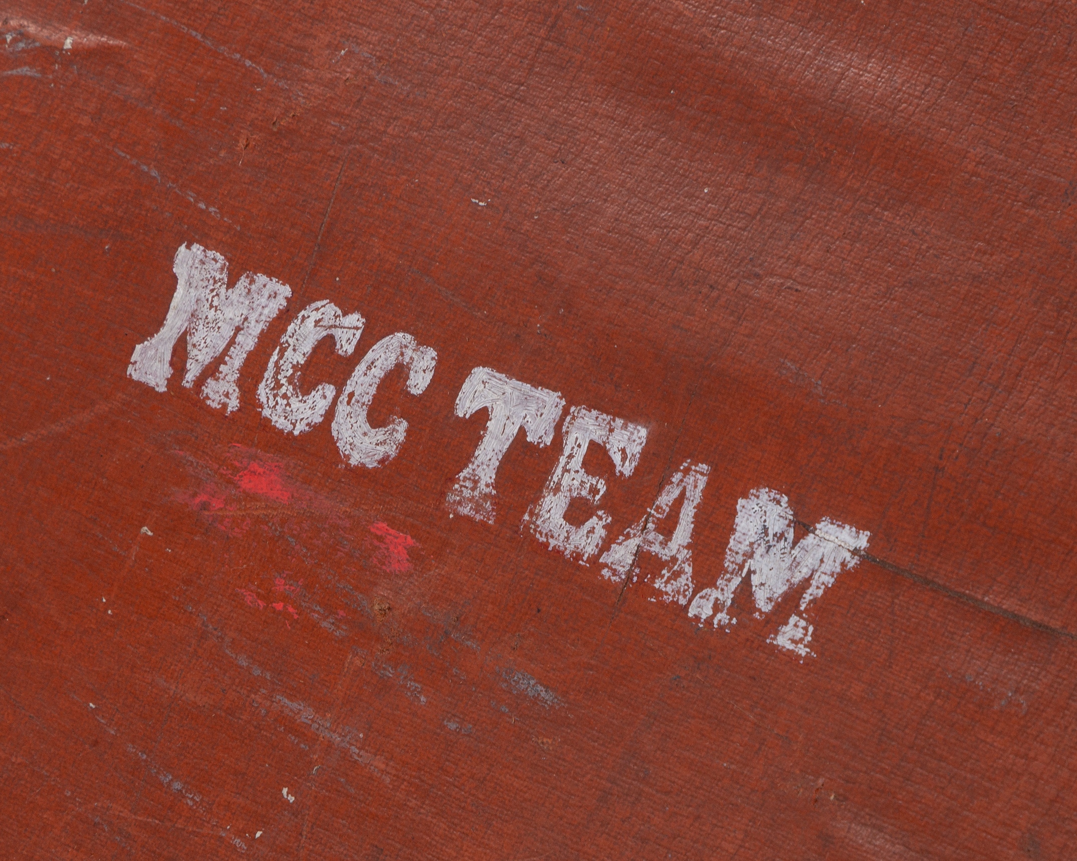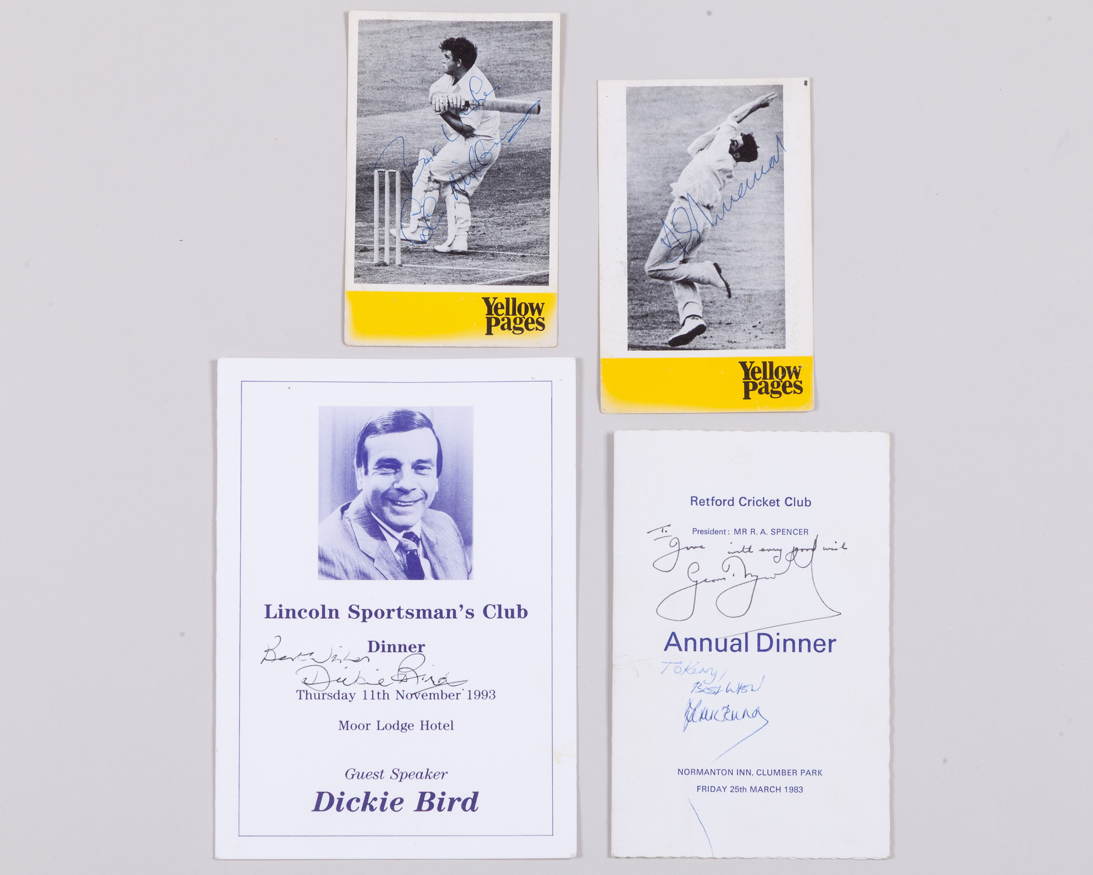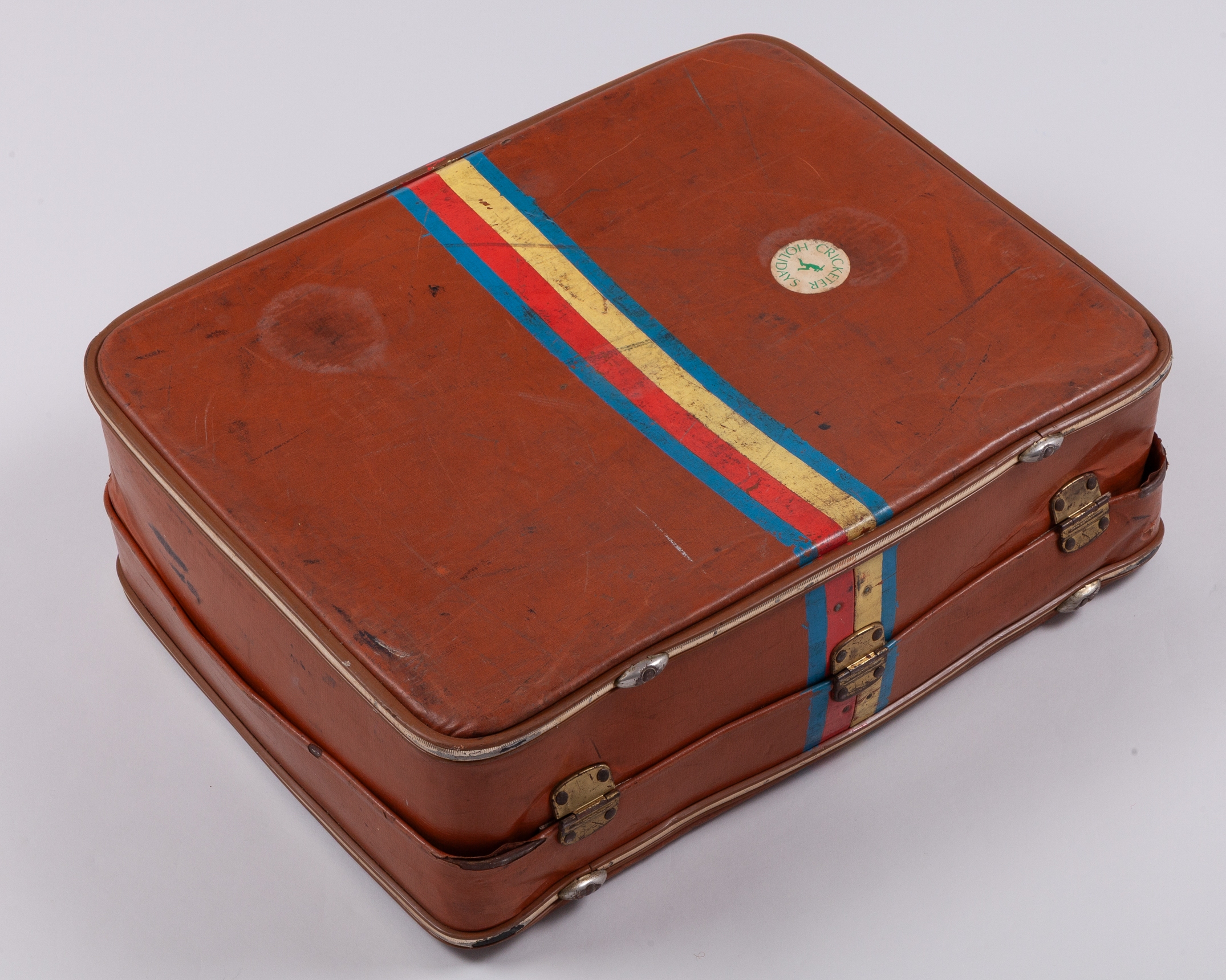 Richard Anthony Hutton brown suitcase by Arthur Barber Bradford, with letter of provenance, well used with staining, discolouration and loose inner lining, two autographed cricket Yellow Pages card including Fred Truman, two autographed cricket annual dinner menus (5)