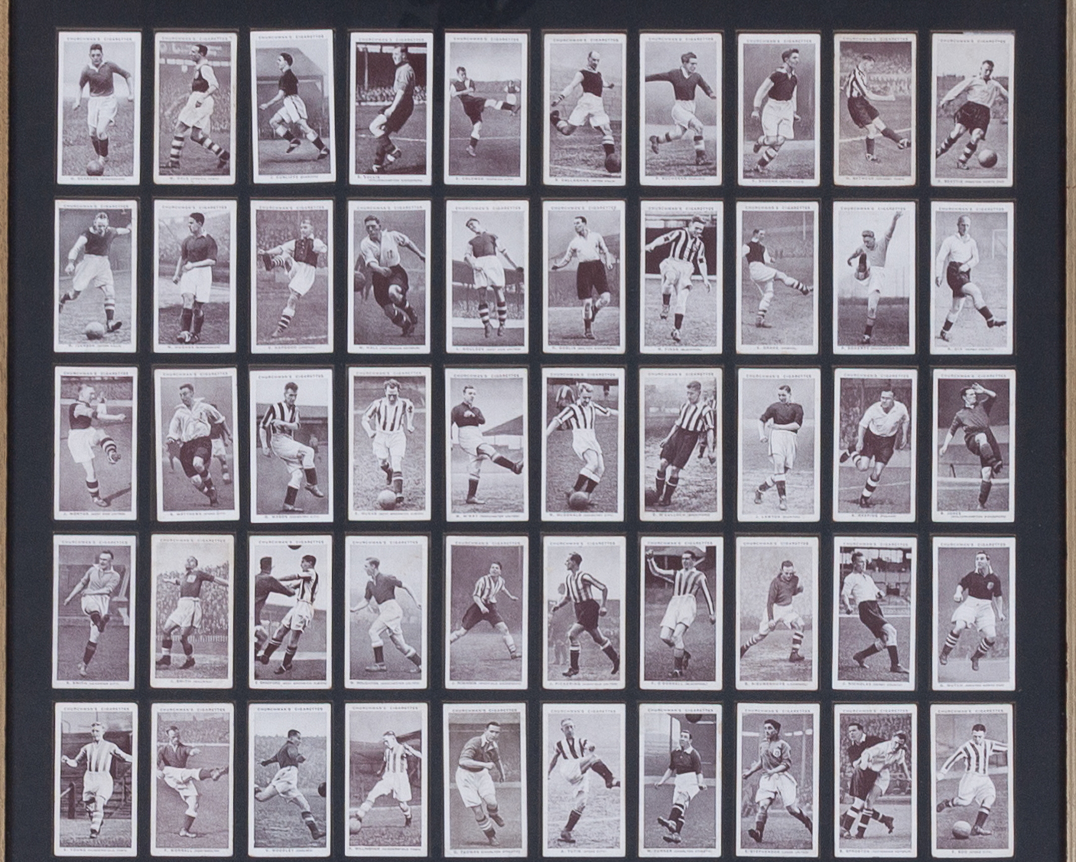An England 1986 World Cup display, comprising: an official Football Association publication, depicting fully autographed colour portraits of all twenty-two squad players and manager Bobby Robson, faded, in common mount, 58 x 78cm, framed and glazed, complete set of Churchman's Association Footballers cigarette cards, framed and glazed (2)
