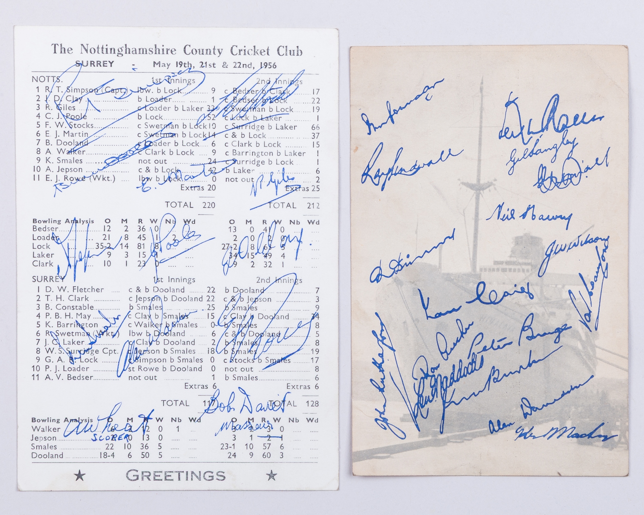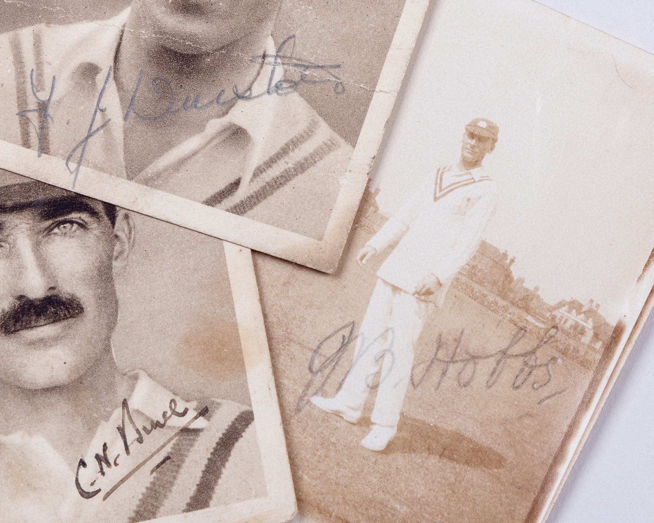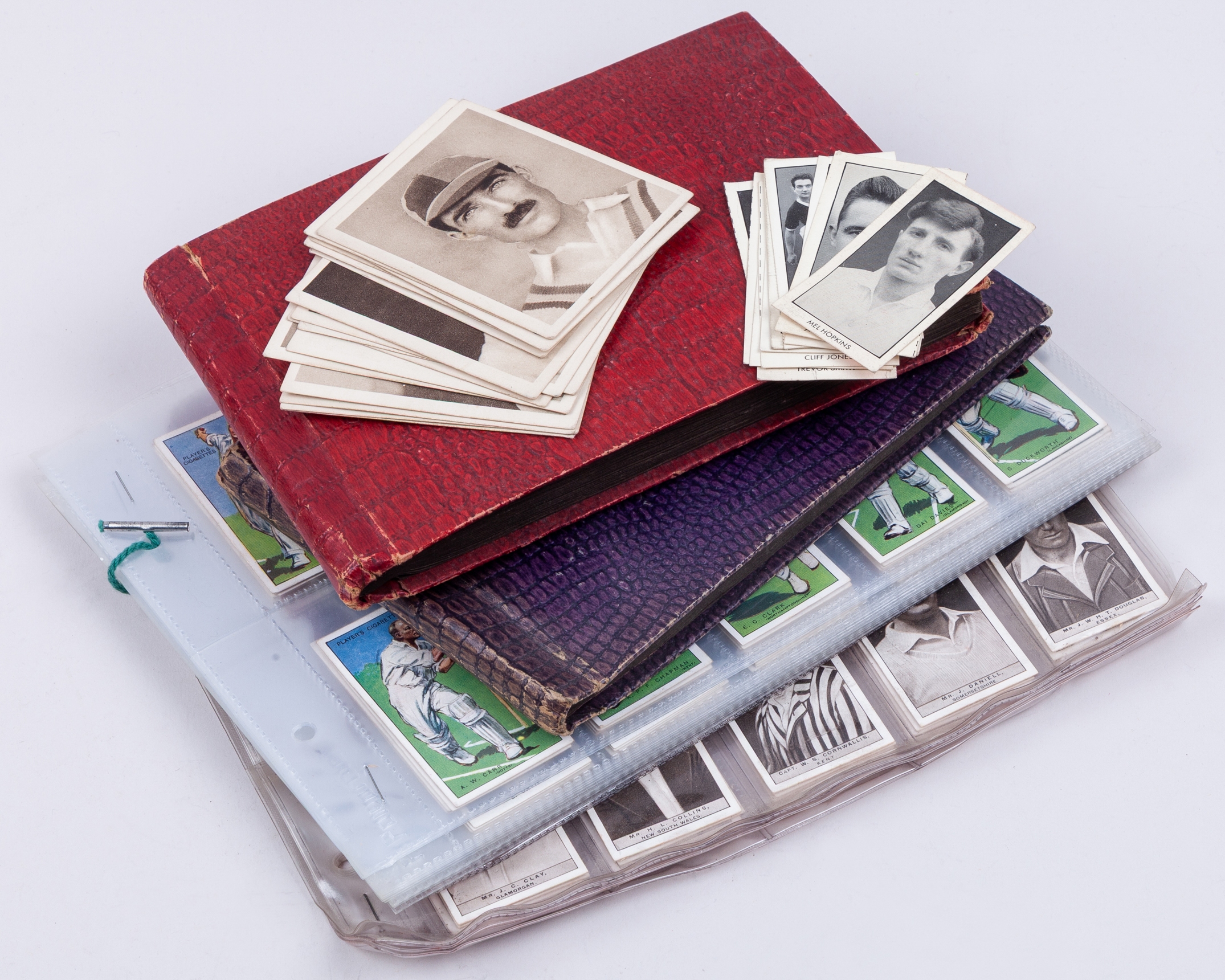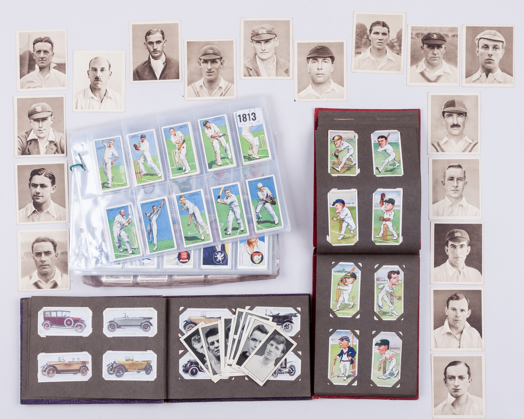 Collection of cricket cigarette trading cards, including Ogden's Cricket 1926, John Player & Sons Cricketers 1930, 1938, John PLayer & Sons Cricketers Caricatures by “RIP” and Wills's Cigarettes Cricketers 1928, all being complete series of fifty, Sunripe Cigarettes Famous Cricketers cards, two cigarette card albums of cricket, football, army corps and motor cars, Sir Don Bradman Commemorative medal