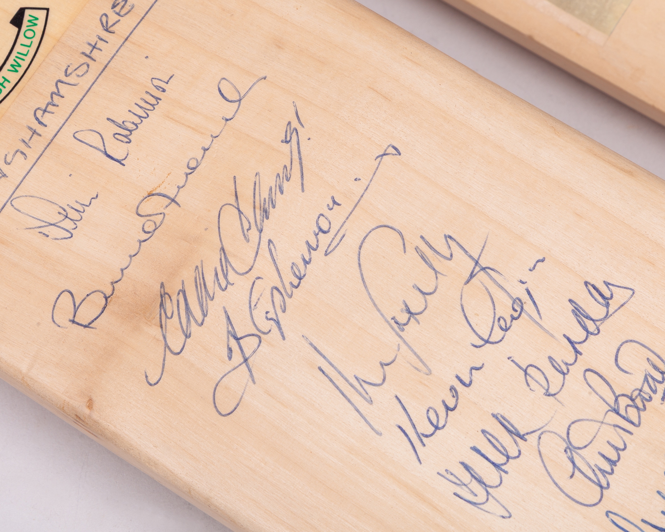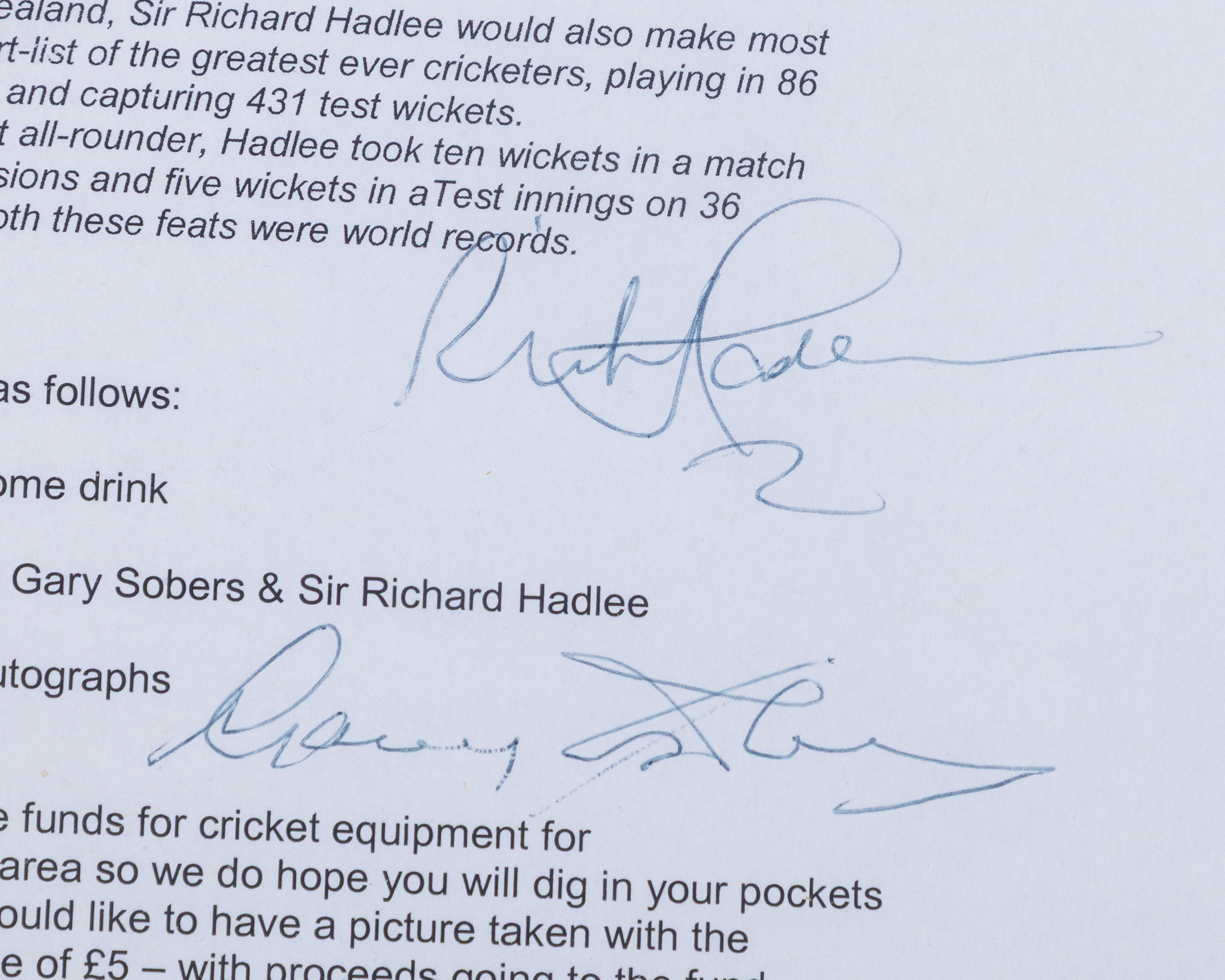 Nottinghamshire CCC, Gary Sobers and Richard Hadlee autographed cricket bats, Nottinghamshire with twenty-one autographs on a Duncan Fearnley cricket bat, Gary Sobers autographed Hardys & Hansons cricket bat and a Richard Hadlee autographed mini-bat, with autographed framed and glazed itinerary of the fundraising lunch (4)