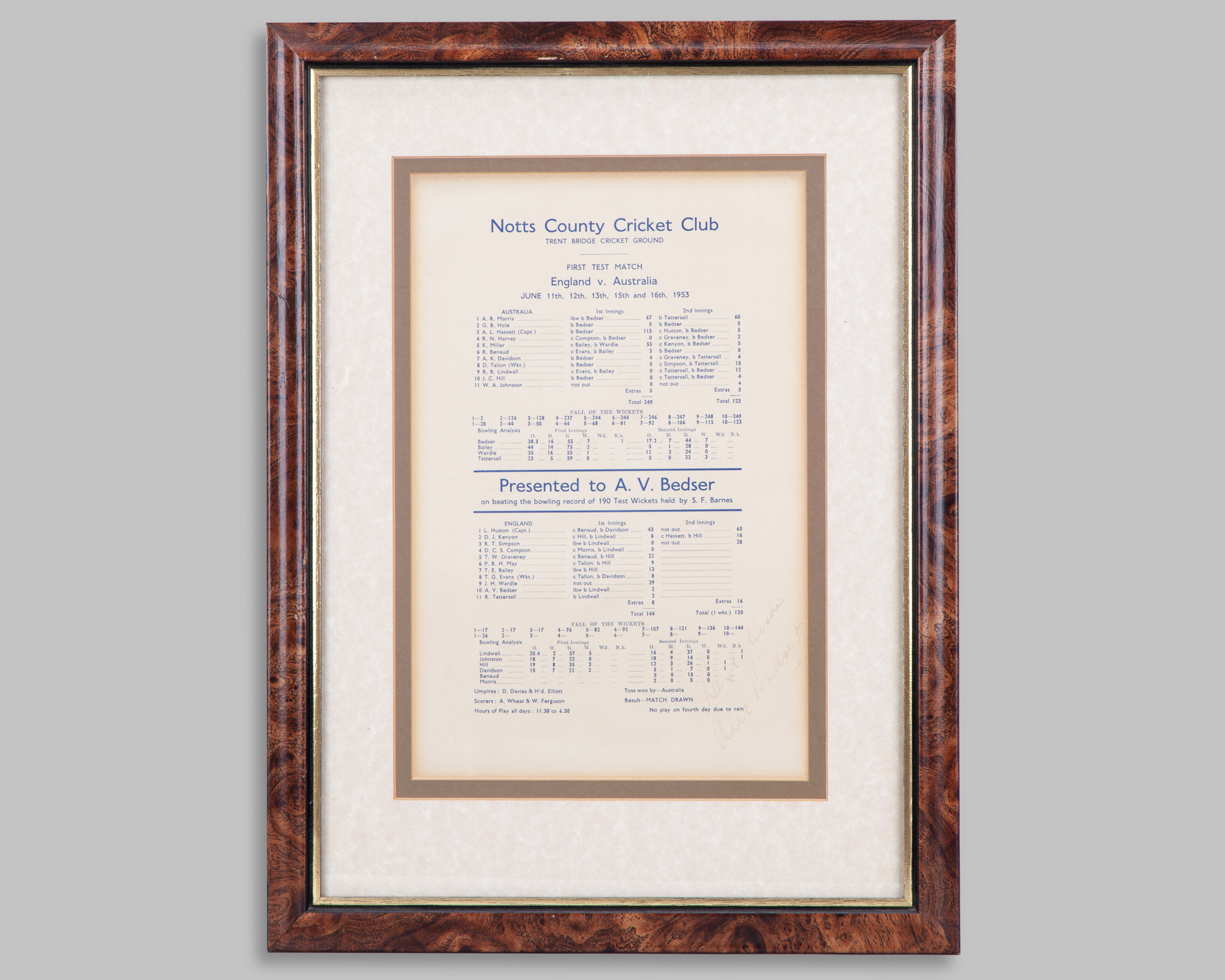 Alec Bedser autographed Notts CCC scorecard presentation on breaking Test wicket record