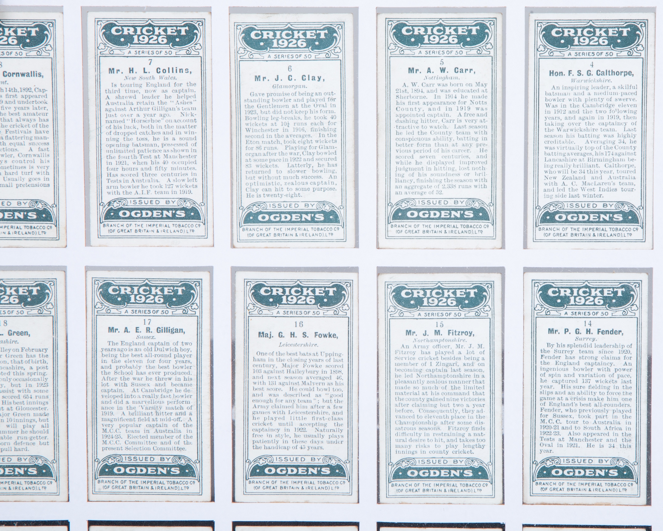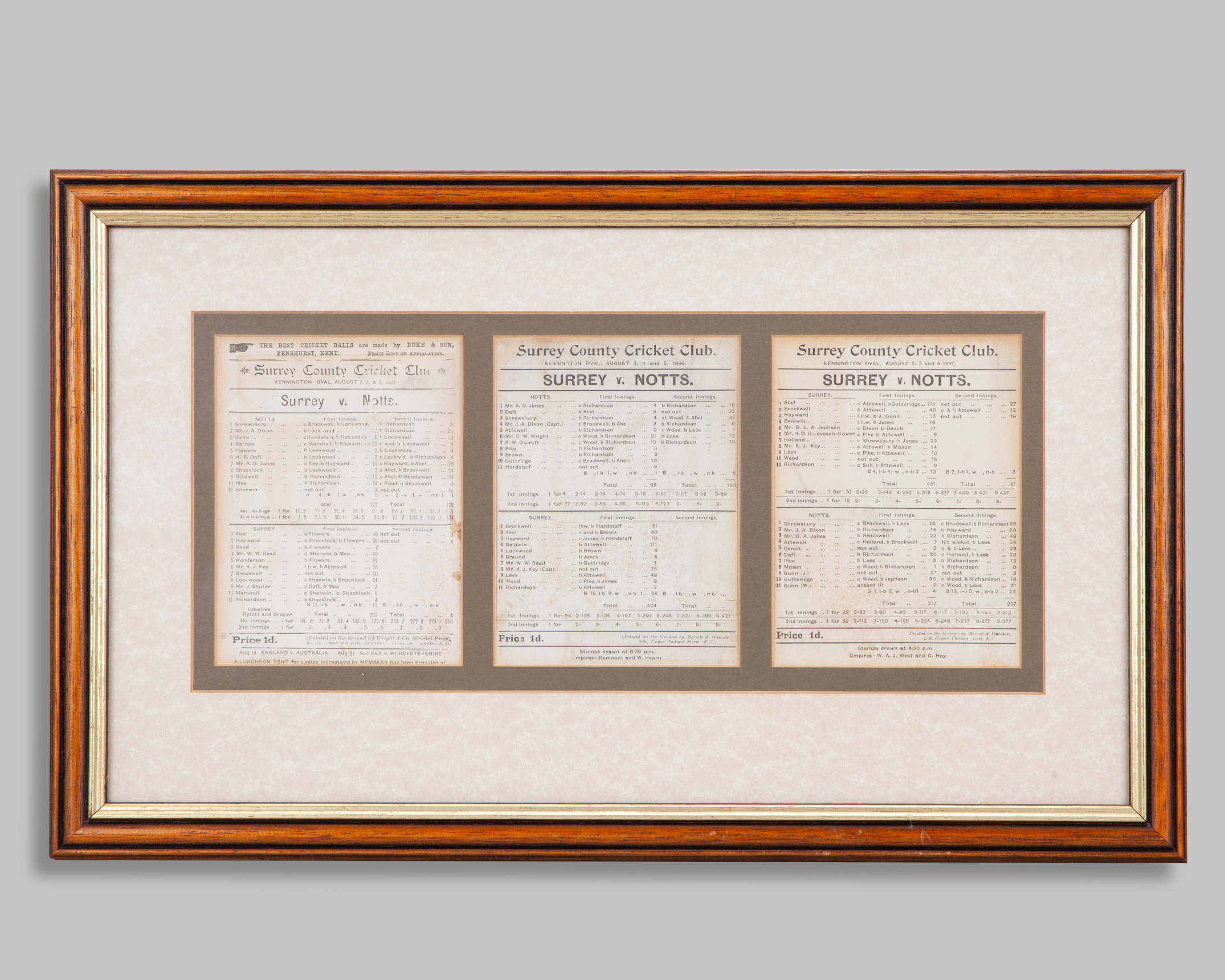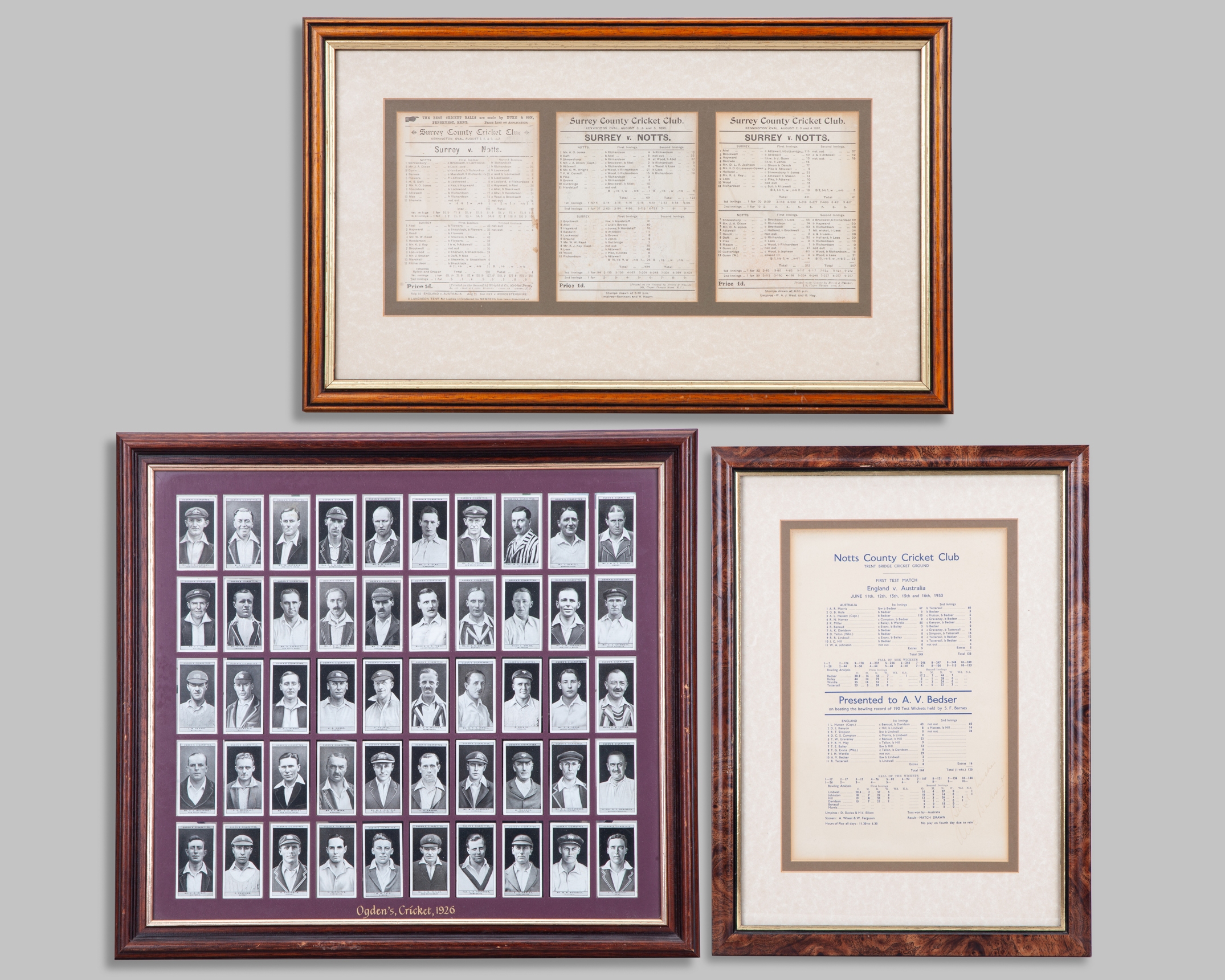 Alec Bedser autographed Notts CCC scorecard presentation on breaking Test wicket record display, mounted, framed and glazed, 35 x 47cm, three Surrey v. Notts 1890s scorecards display, mounted, framed and glazed, 49 x 30cm, Ogden's Cricket 1926 complete set of fifty card display, mounted, framed and glazed on both sides, 53 x 48cm (3)