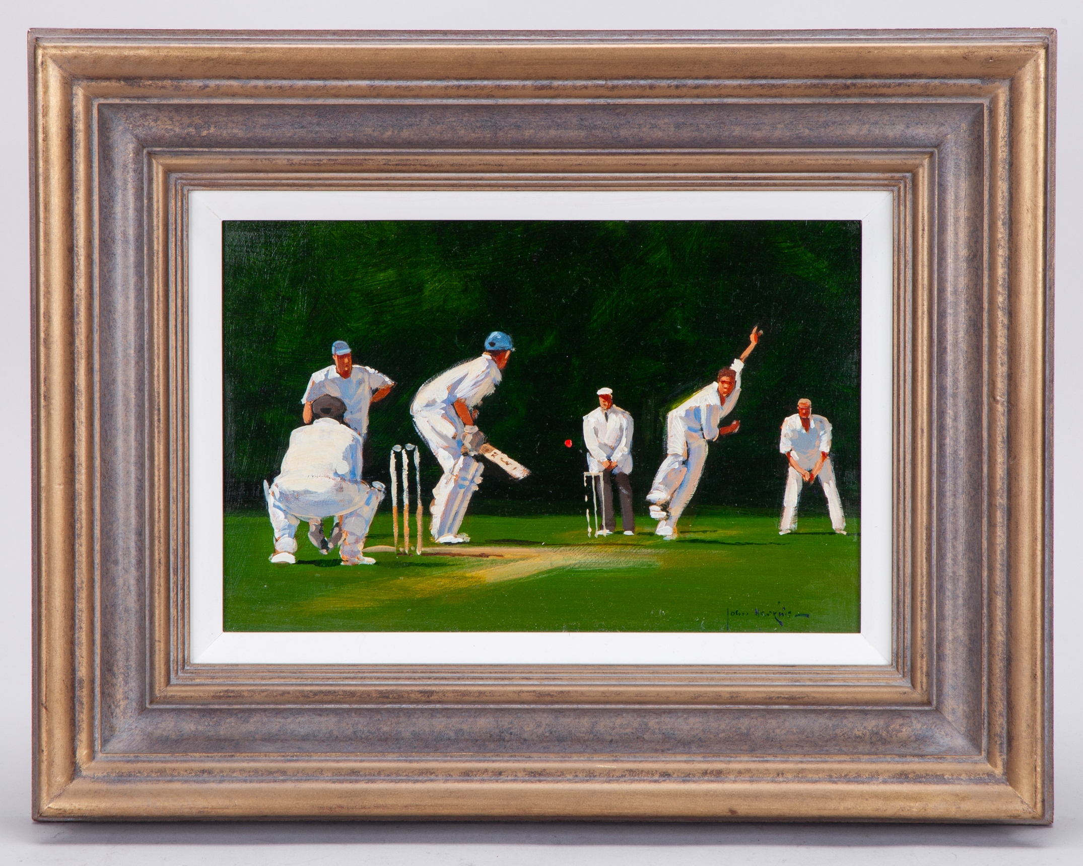 John Haskins (British, B.1938) Bowling, signed, acrylic on board, framed, the image 28 x 18cm and the overall 46 x 36cm