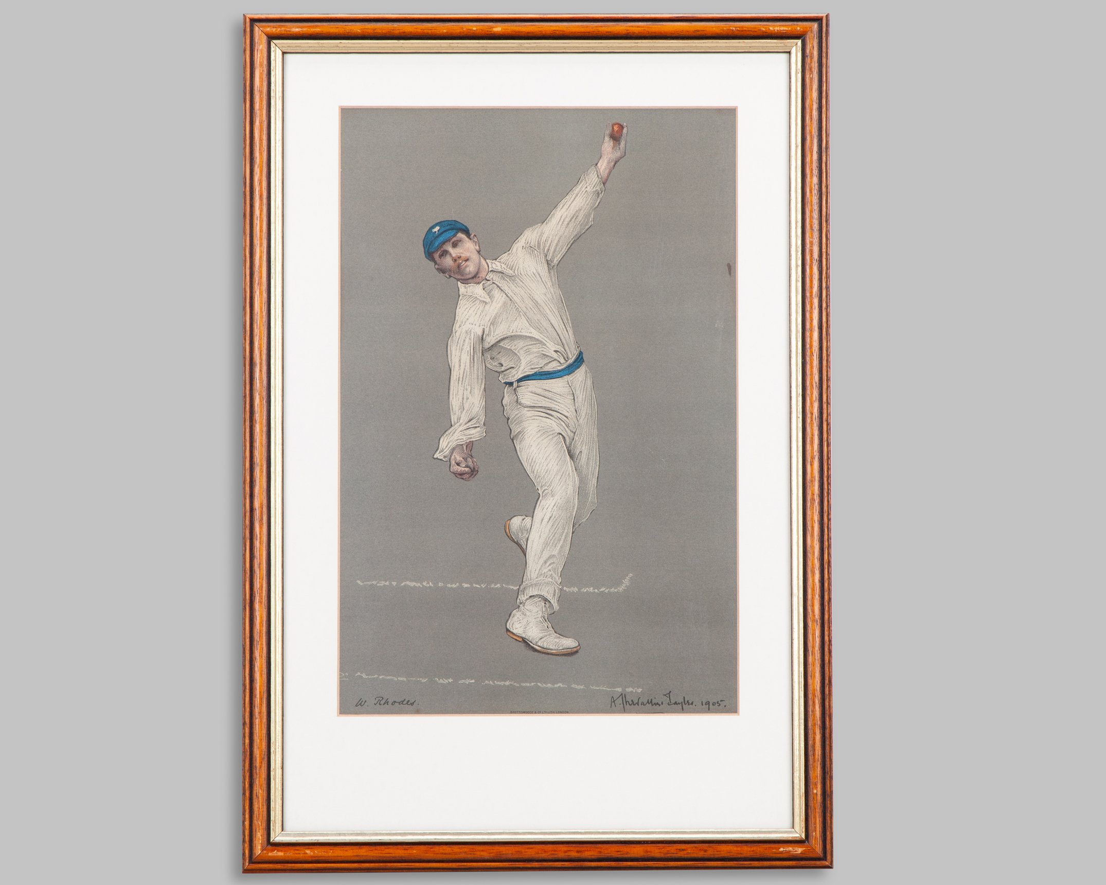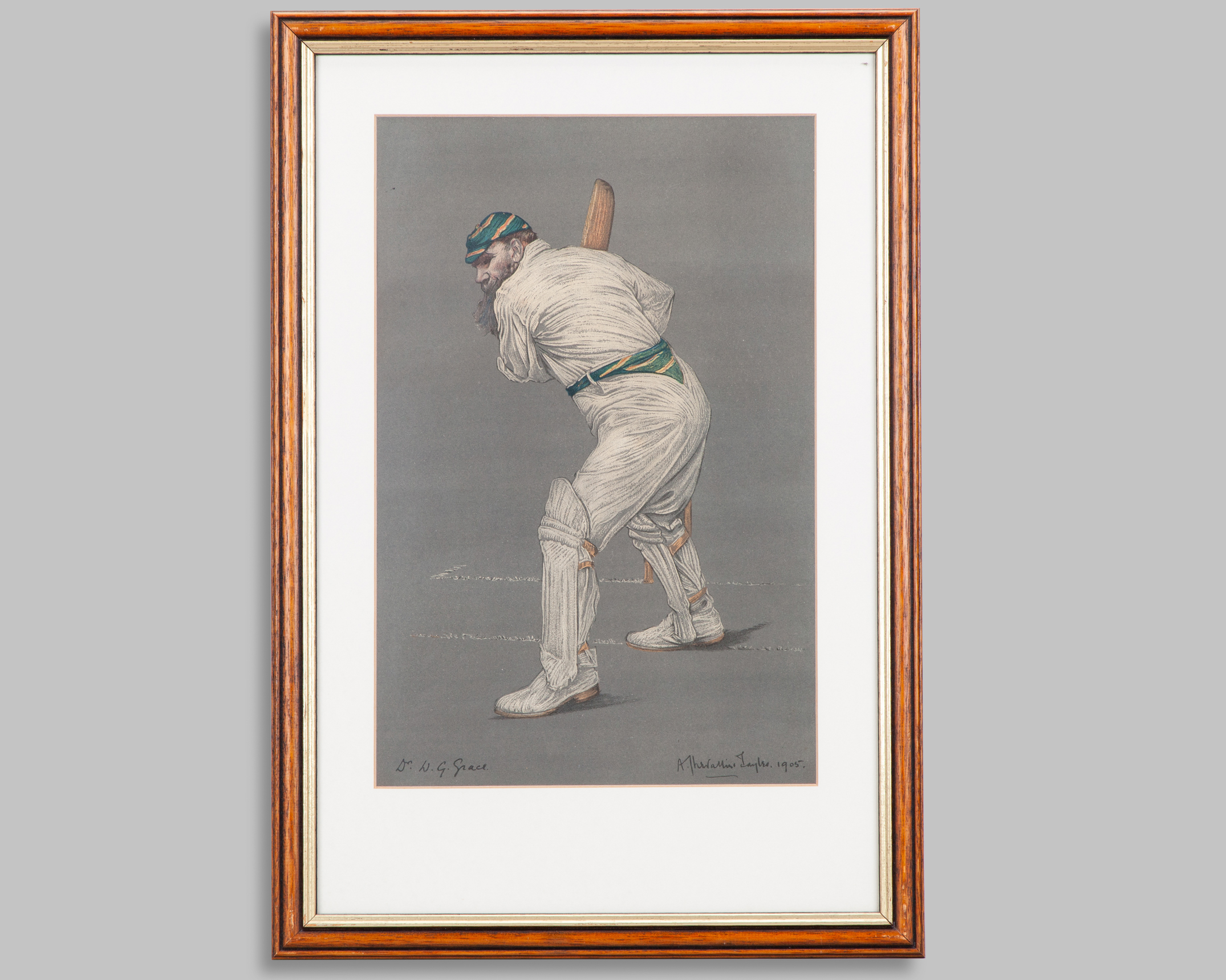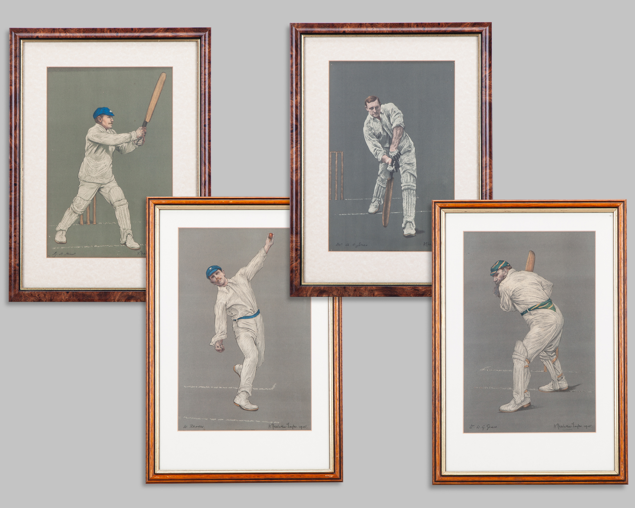 After Albert Chevallier Tayler four 1905 prints, comprising W. G. Grace, Wilfred Rhodes, George Hirst and Arthur Jones, all framed and glazed, Jones and Hirst 40 x 54cm overall, with Grace and Rhodes 36 x 52cm overall and text taped to the back (4)