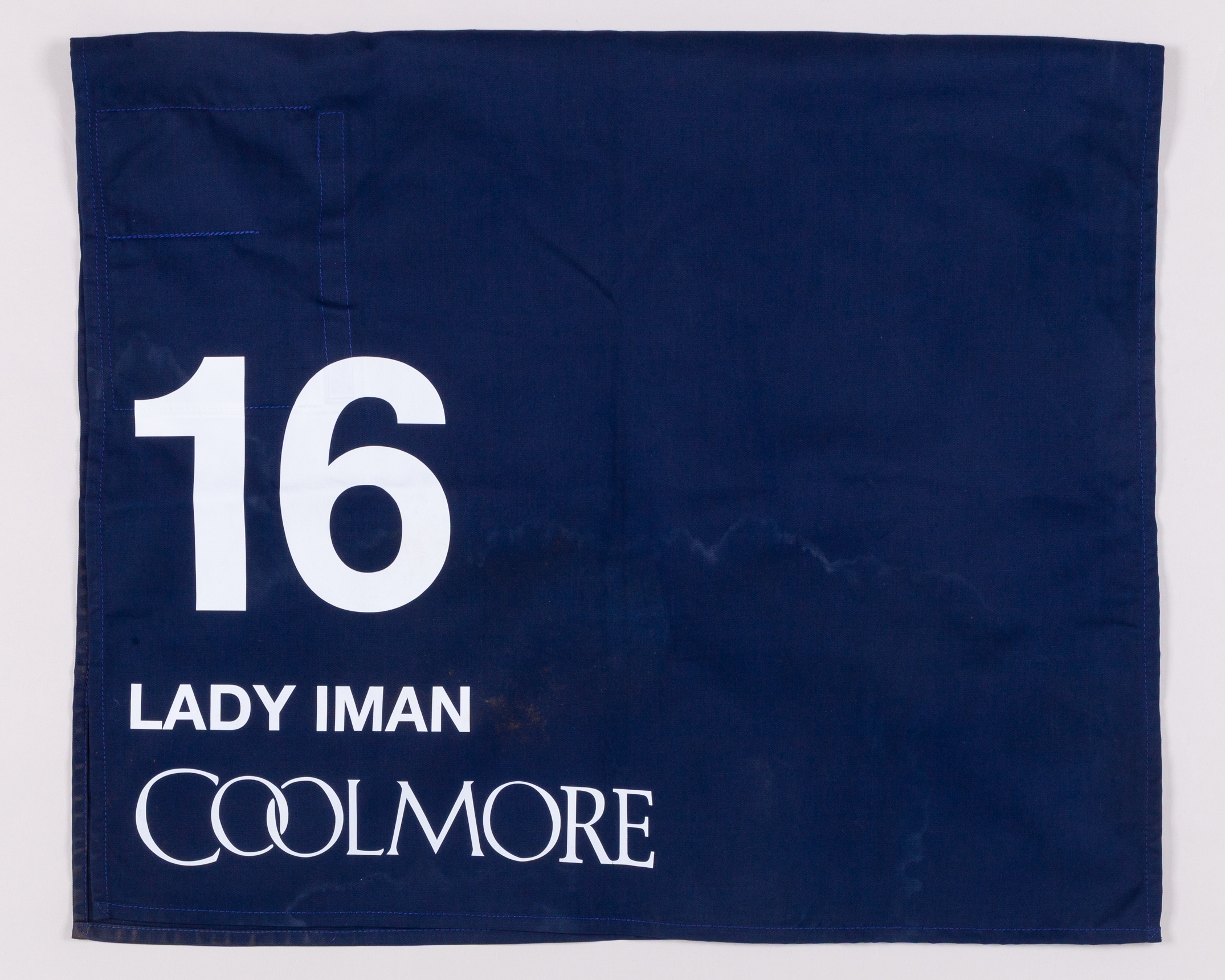 No.16 number cloth worn by Lady Iman in the 2025 Nunthorpe Stakes at York, blue with white printing and Coolmore sponsorship