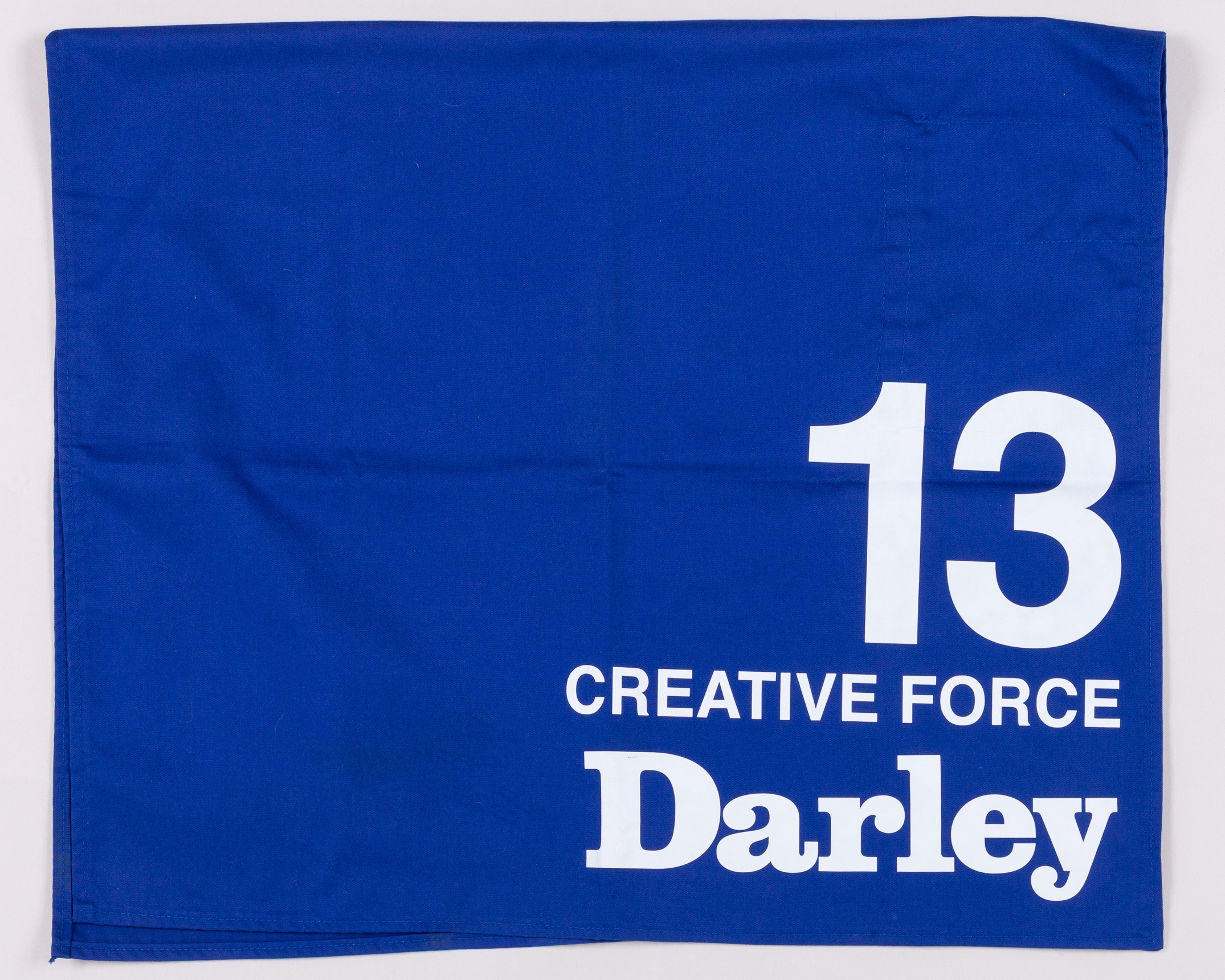 No.13 number cloth worn by Creative Force in the 2021 July Cup at Newmarket, blue with white printing and Darley sponsorGhip