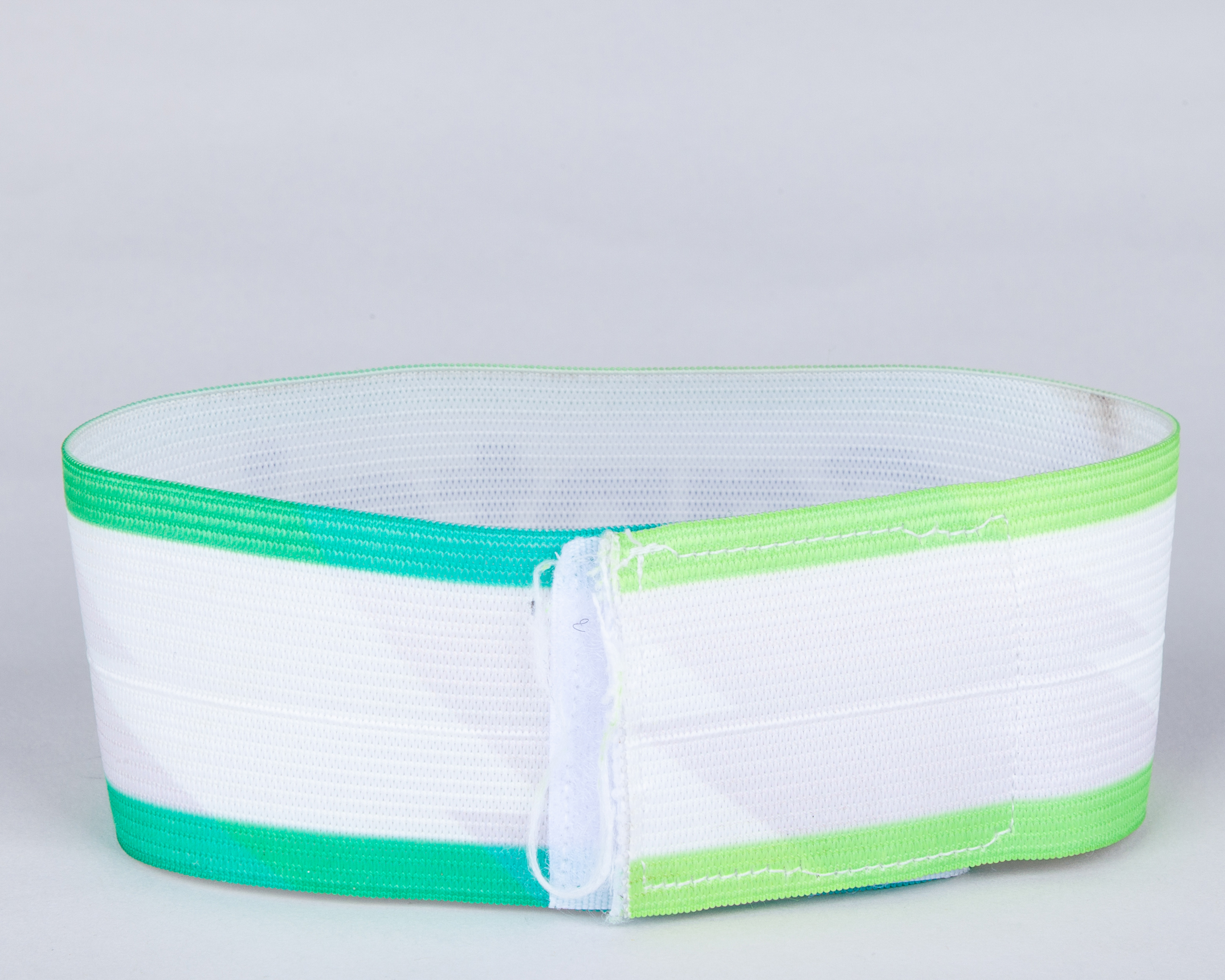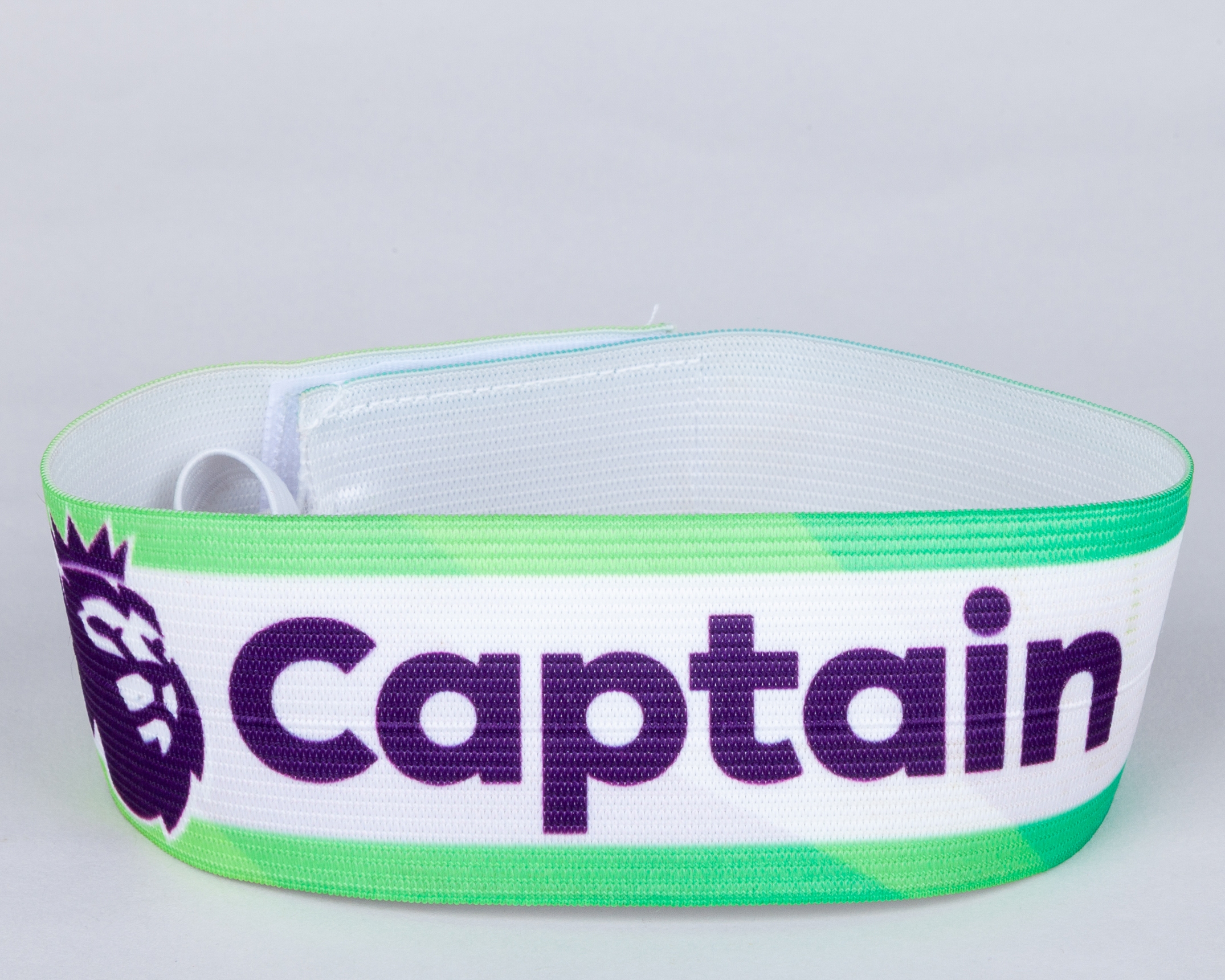 Marc Guéhi match worn captain's armband Crystal Palace v. Aston Villa, Premier League 2026, white and green with CAPTAIN in purple and Premier League Logo