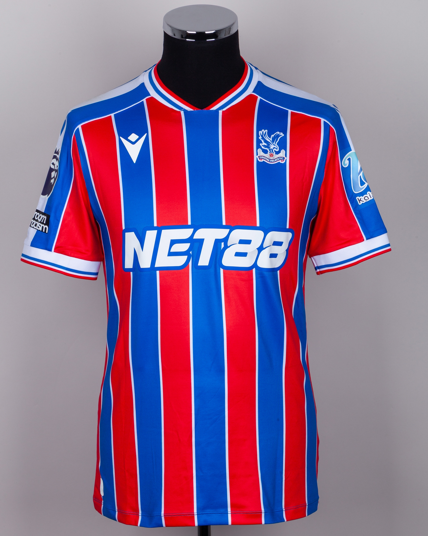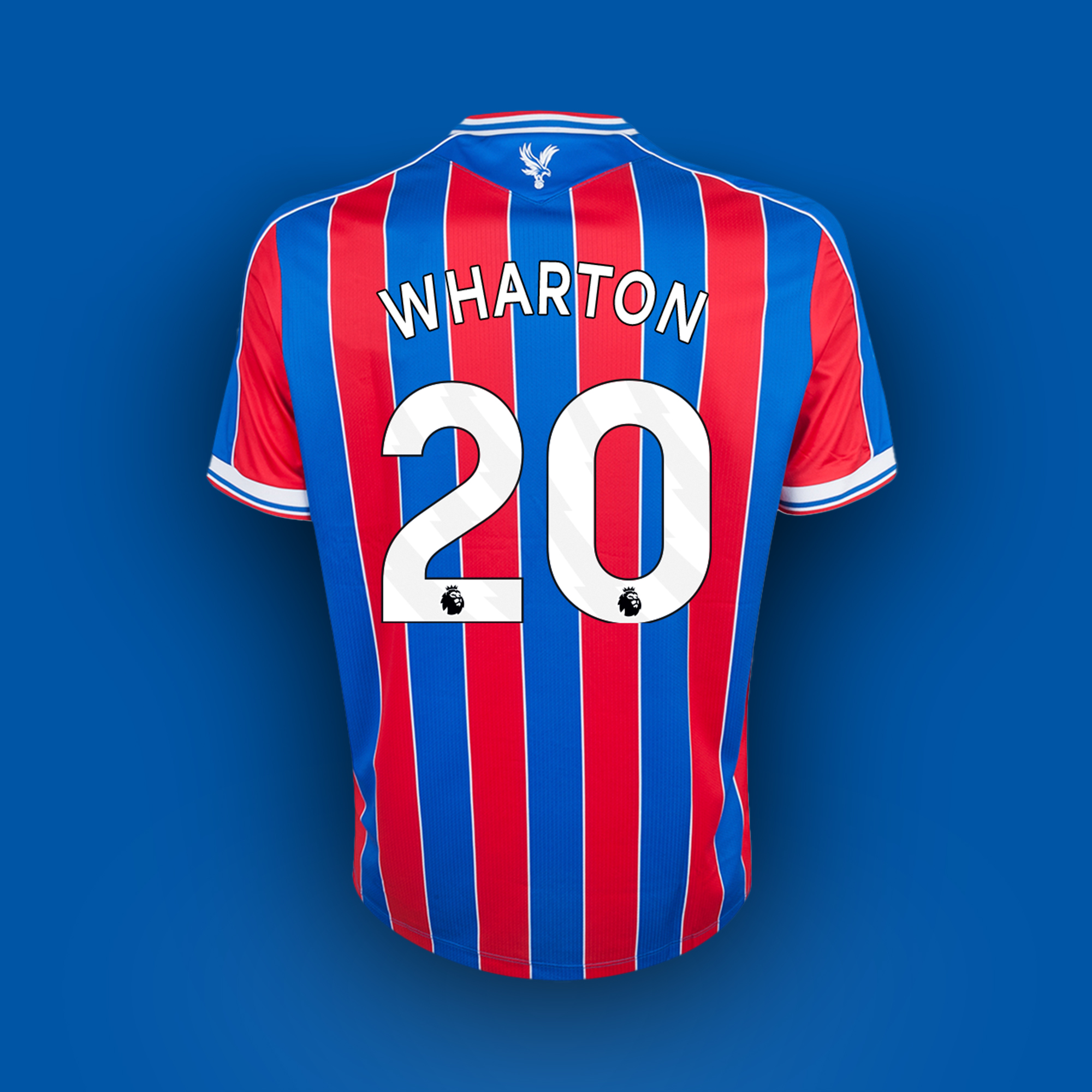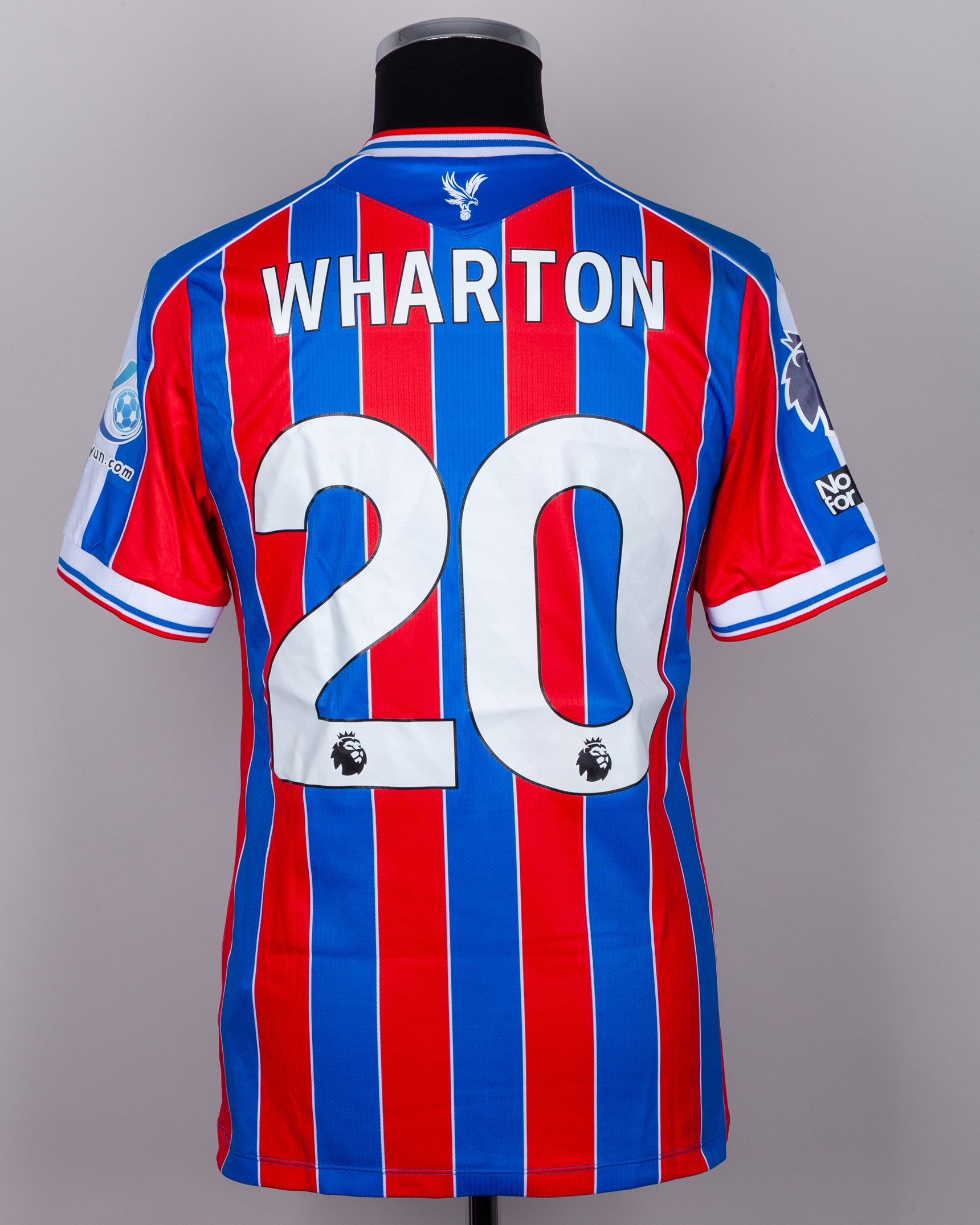 Adam Wharton No.20 Crystal Palace v. Aston Villa match worn short-sleeved shirt, Premier League 2026, Macron, with crew-neck collar and printed badge, the reverse lettered WHARTON the right sleeve with Premier League logo