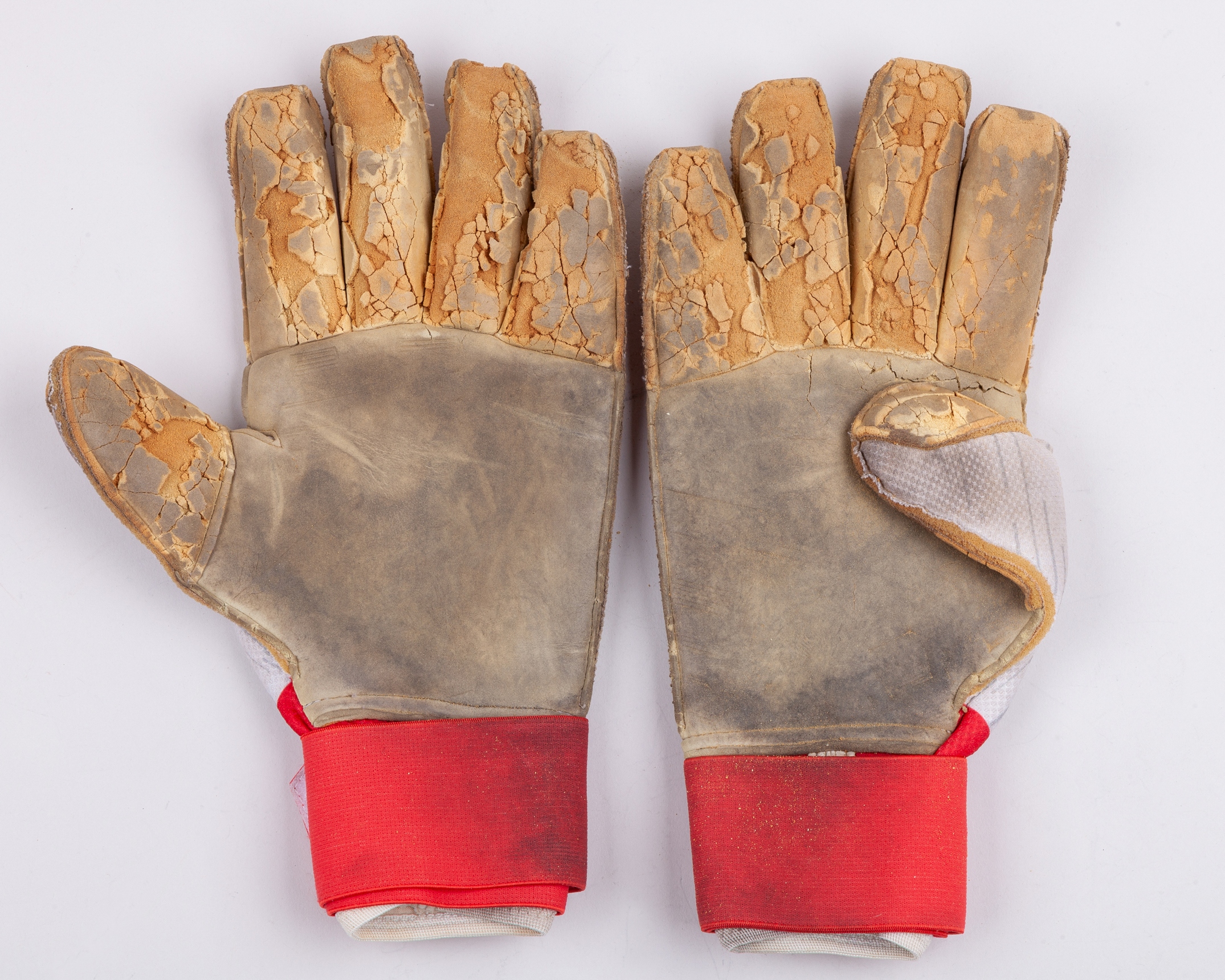 Marc-Andre Ter Stegen white, red and black Adidas match used goalkeeper gloves, May 2018, UK11, with MTERSTEGEN1 D decal on both gloves, the gloves are hardened, brittle and worn