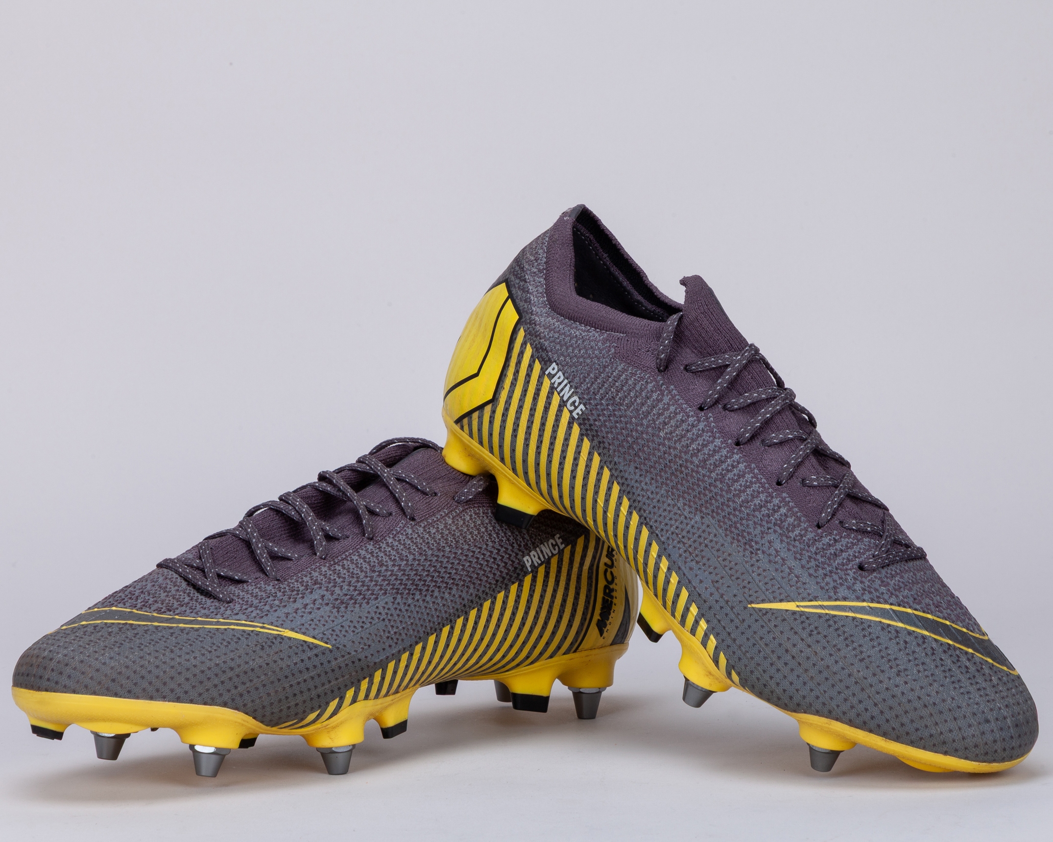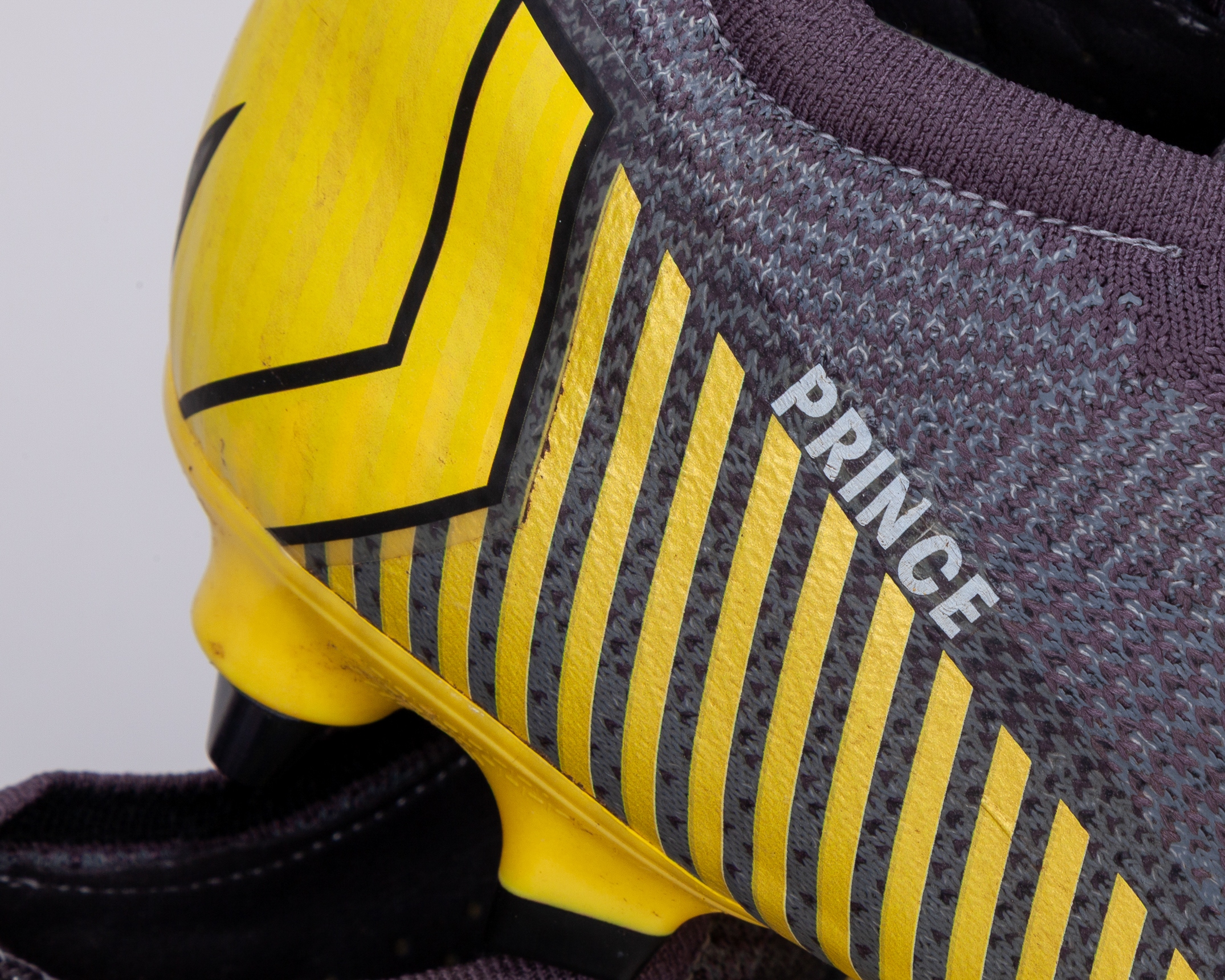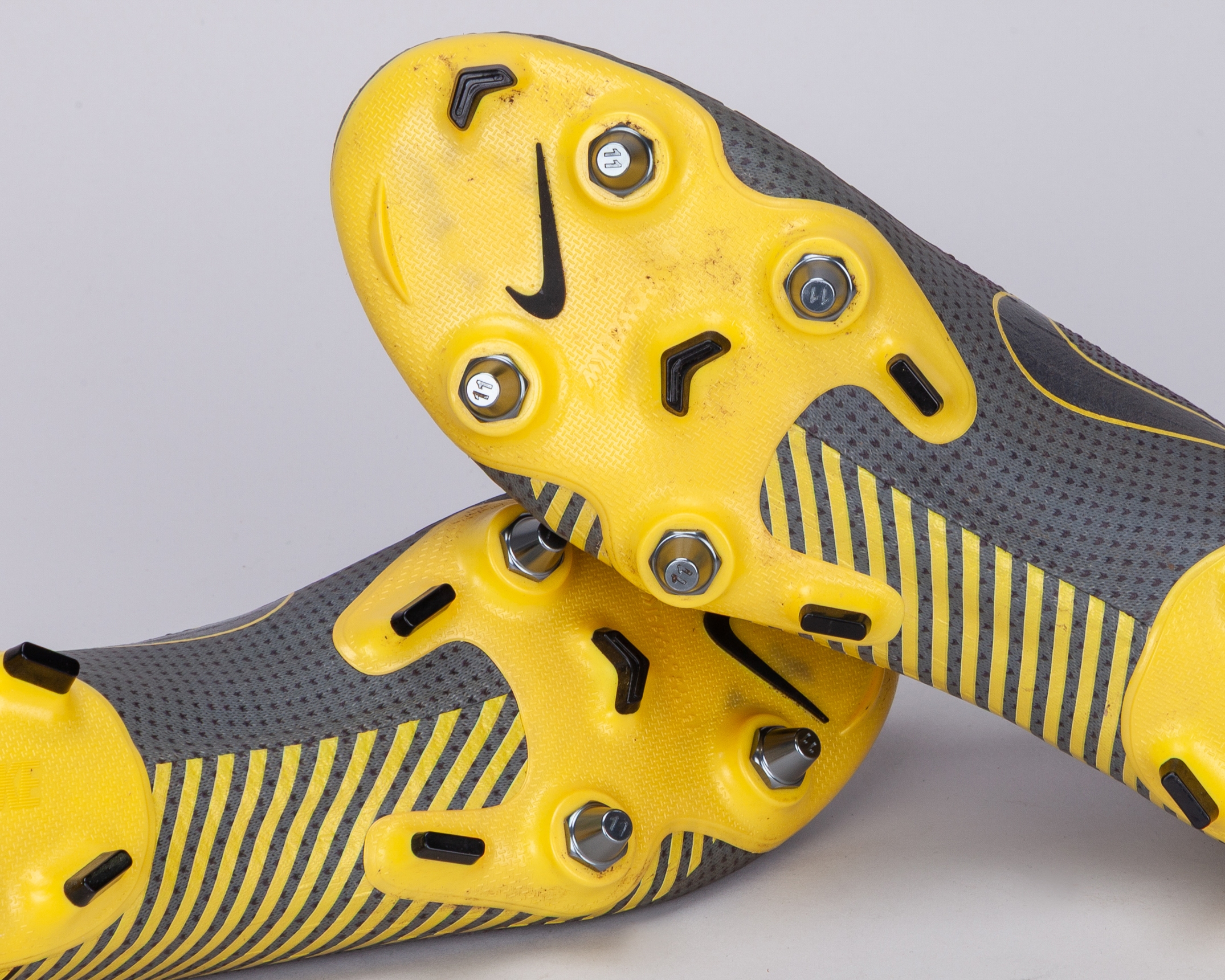 Kevin Prince Boateng grey and yellow Nike Mercurial football boots, 2018-19, UK9.5, with PRINCE decal on both boots, with some signs of wear, worn in training