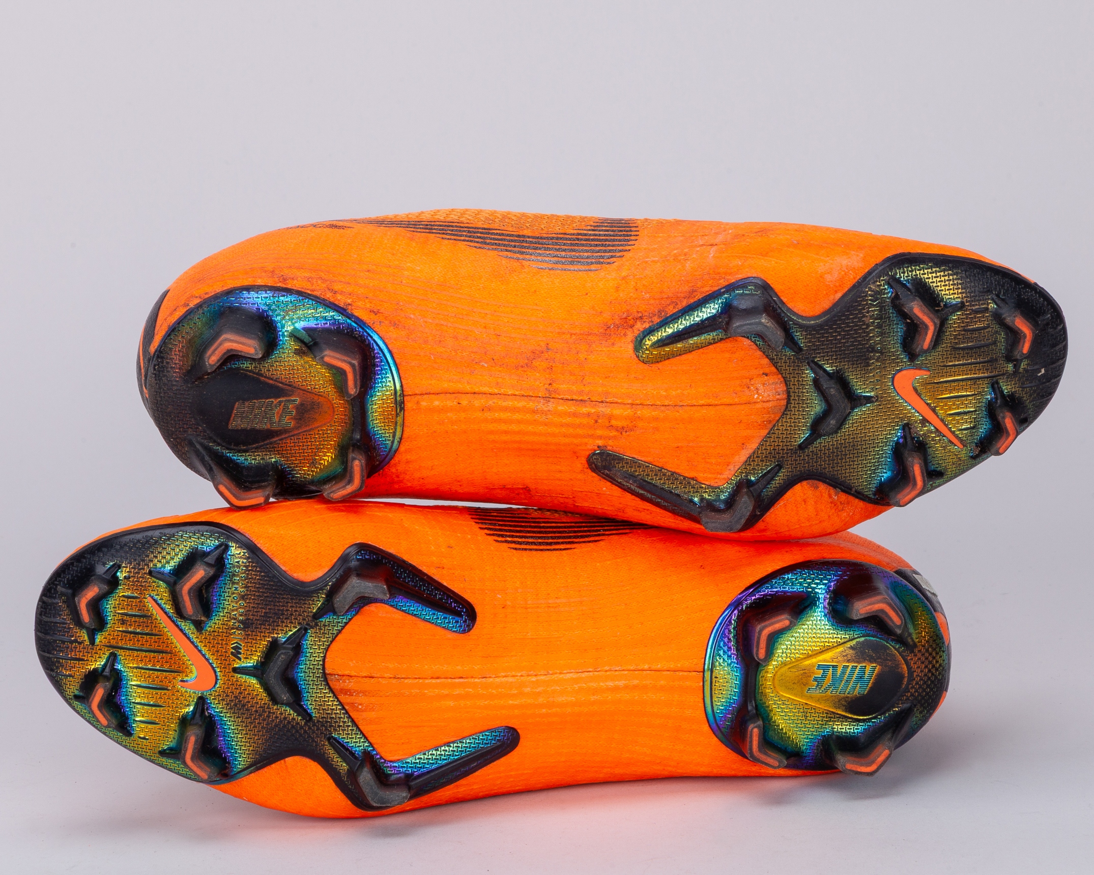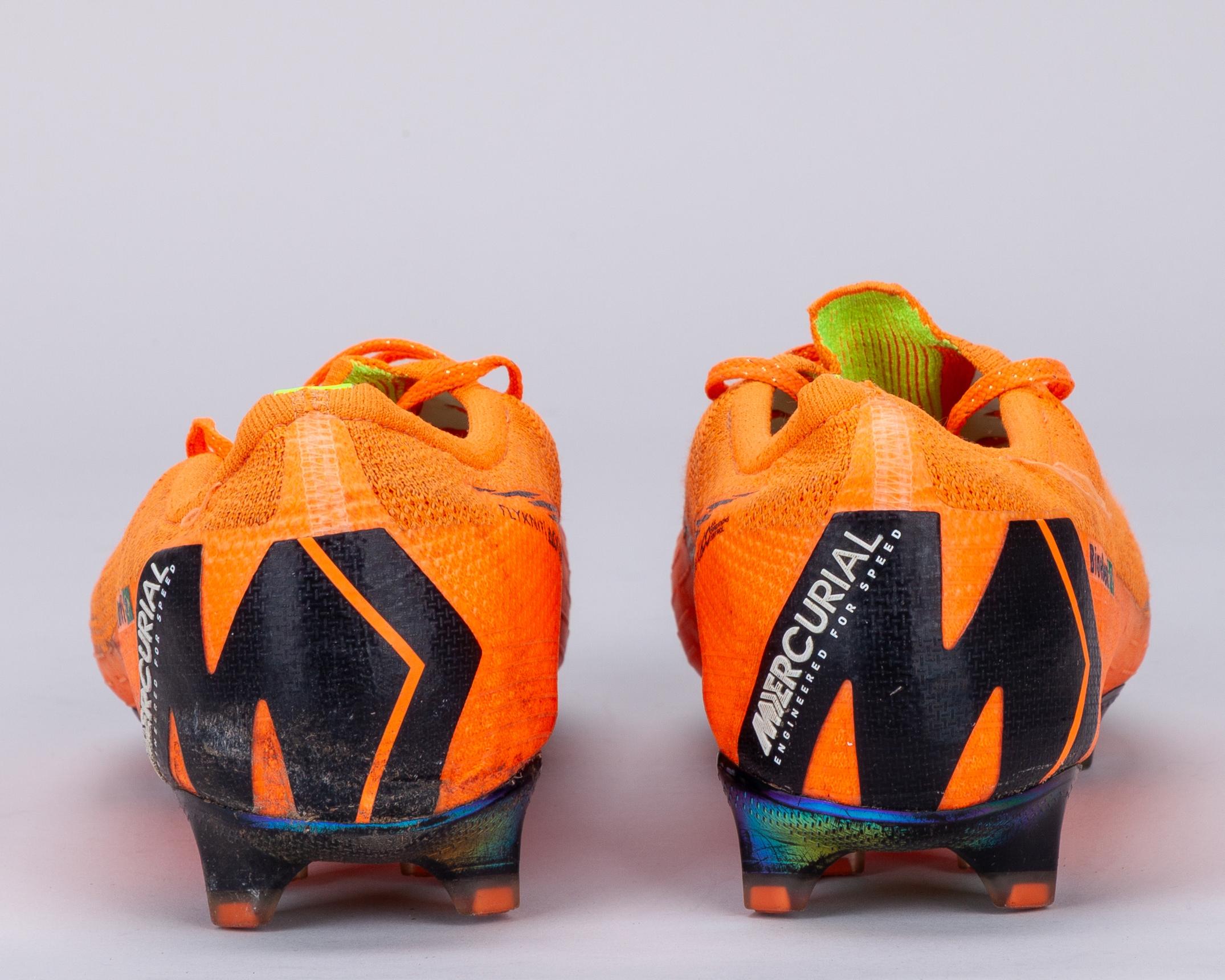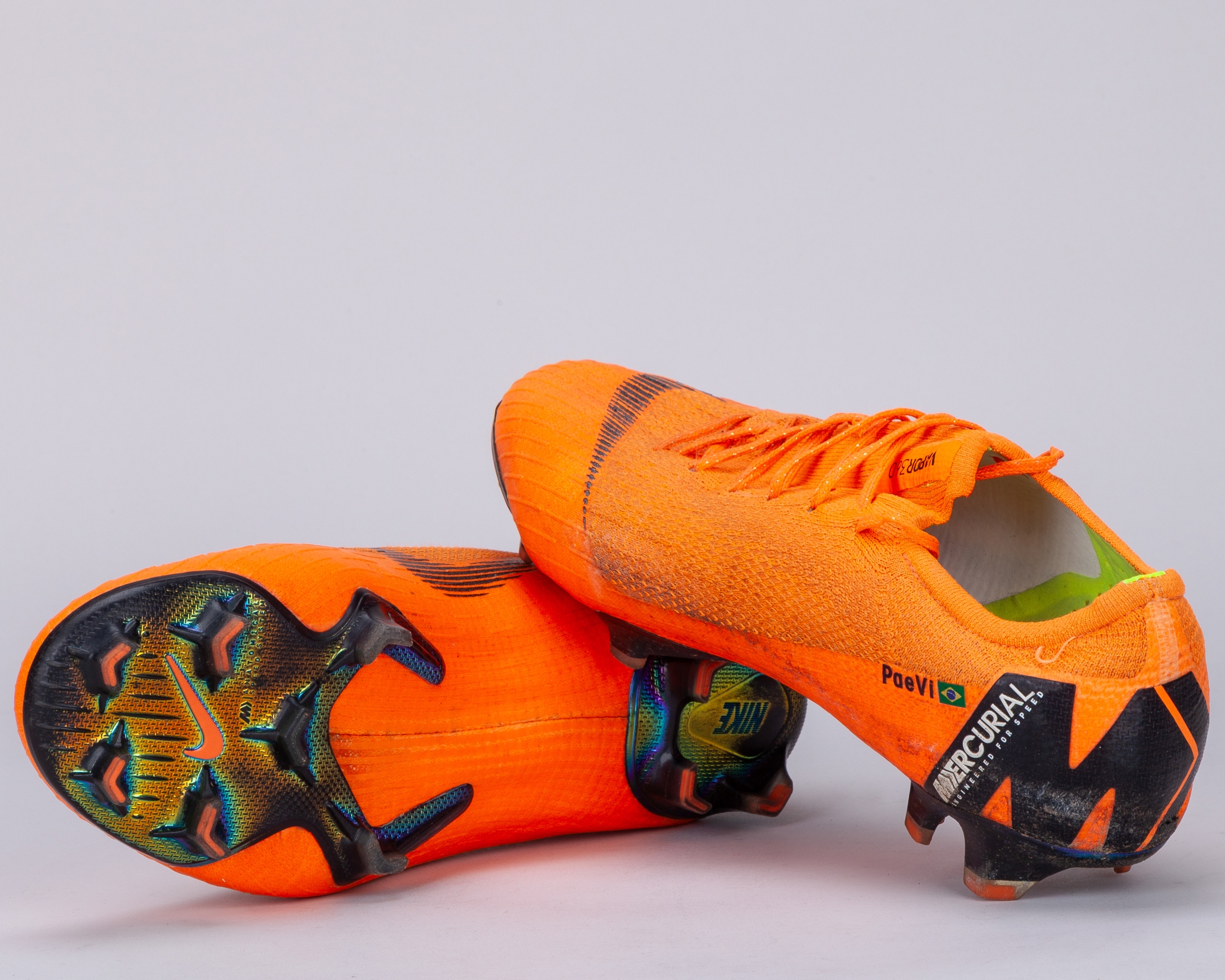 Paulinho orange Nike Mercurial Vapor 360 match worn football boots, April-May 2018, with BiaeBen (Brazil flag) decal on the right boot and PaeVi (Brazil flag) decal on the left, with innersoles removed and 15 written in ink within the right boot, signs of wear