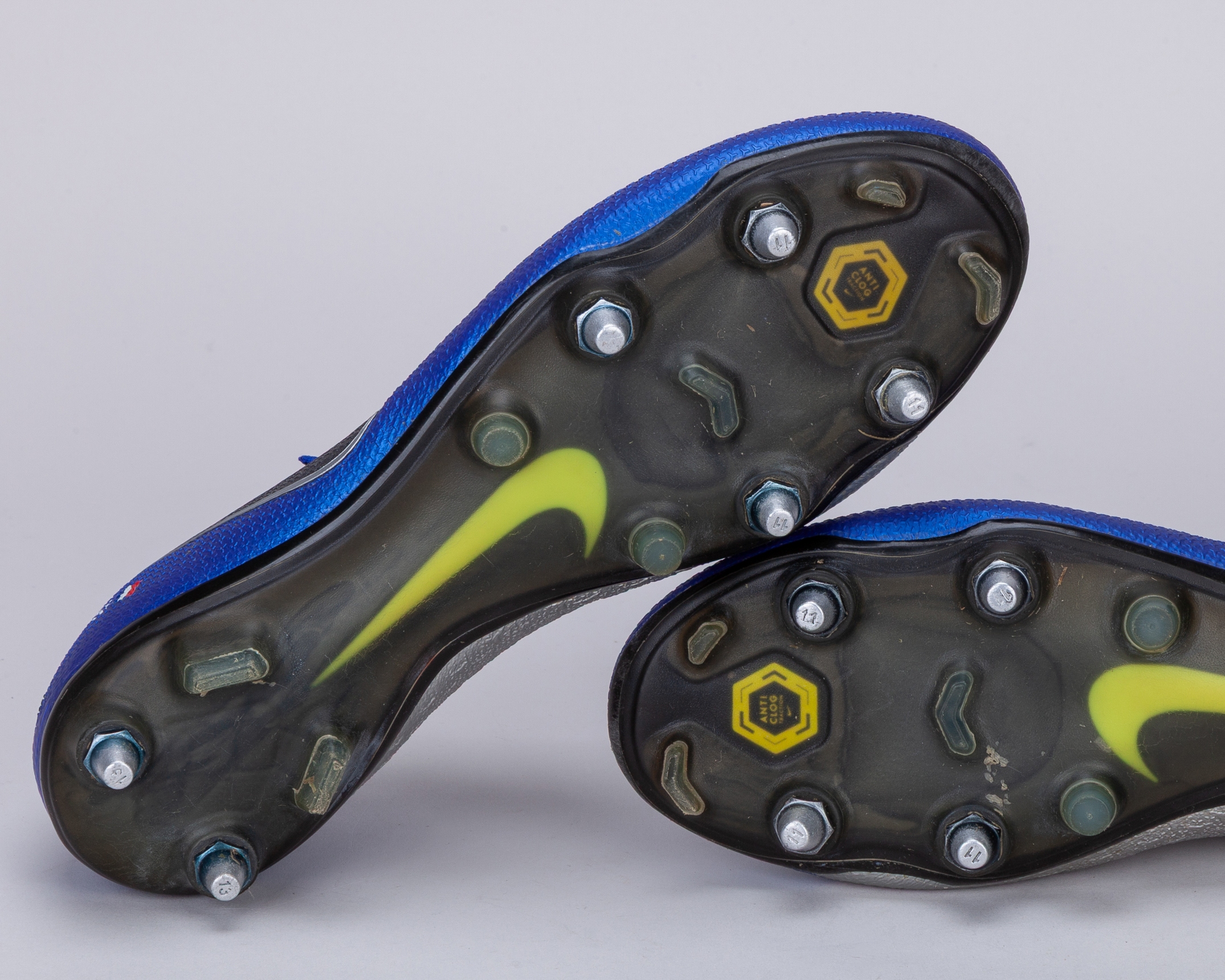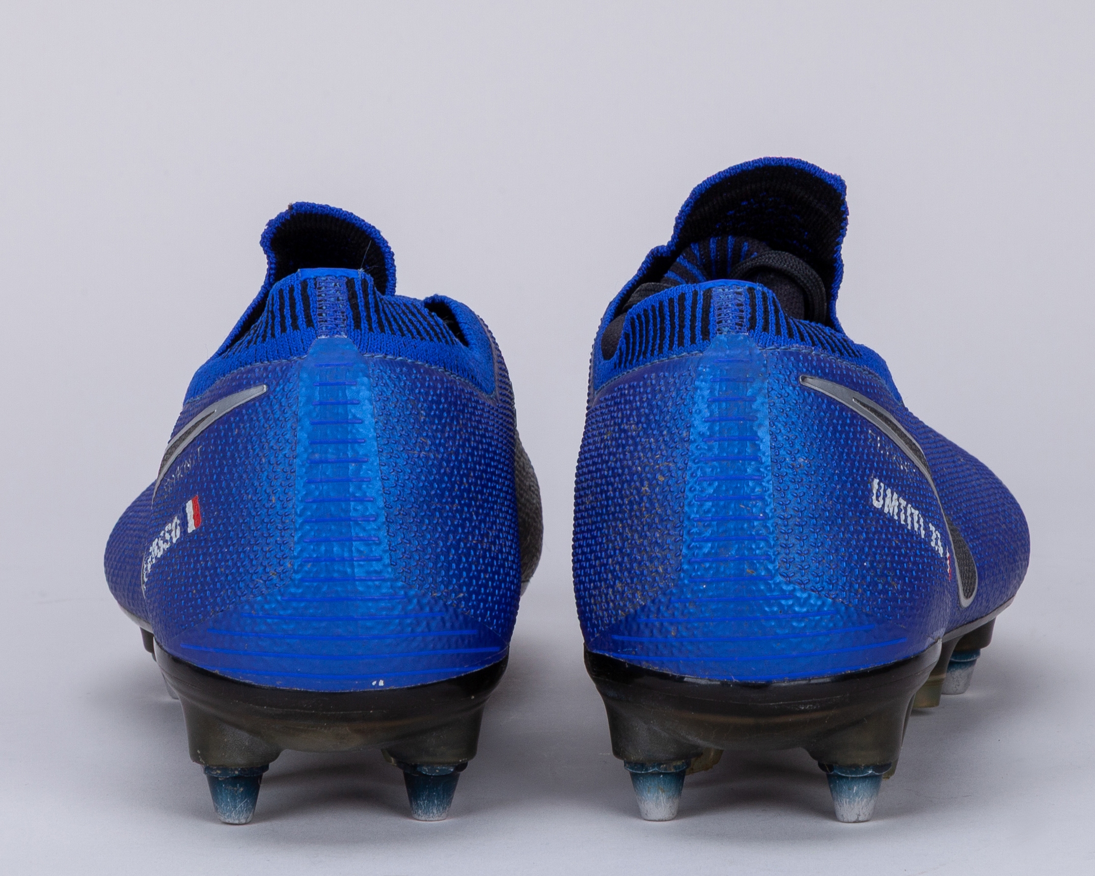 Samuel Umtiti blue Nike Phantom SN Barcelona v. Atletico Madrid match worn football boots, 2018, UK9, with UMTITI 23 (French flag) decal on right boot and EL BOSSO (French flag) on left boot, with signs of wear