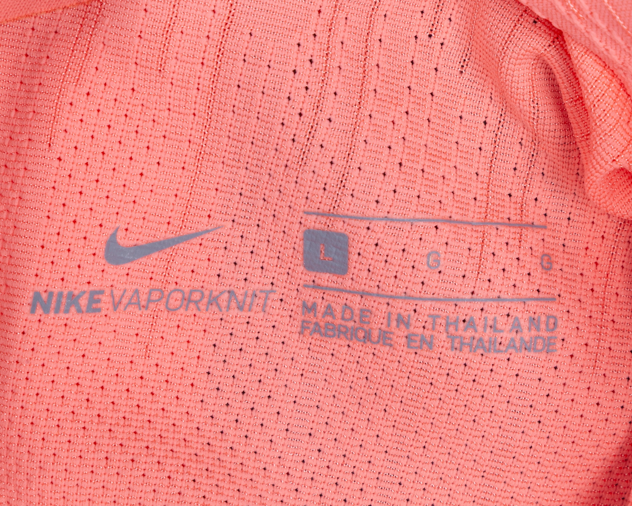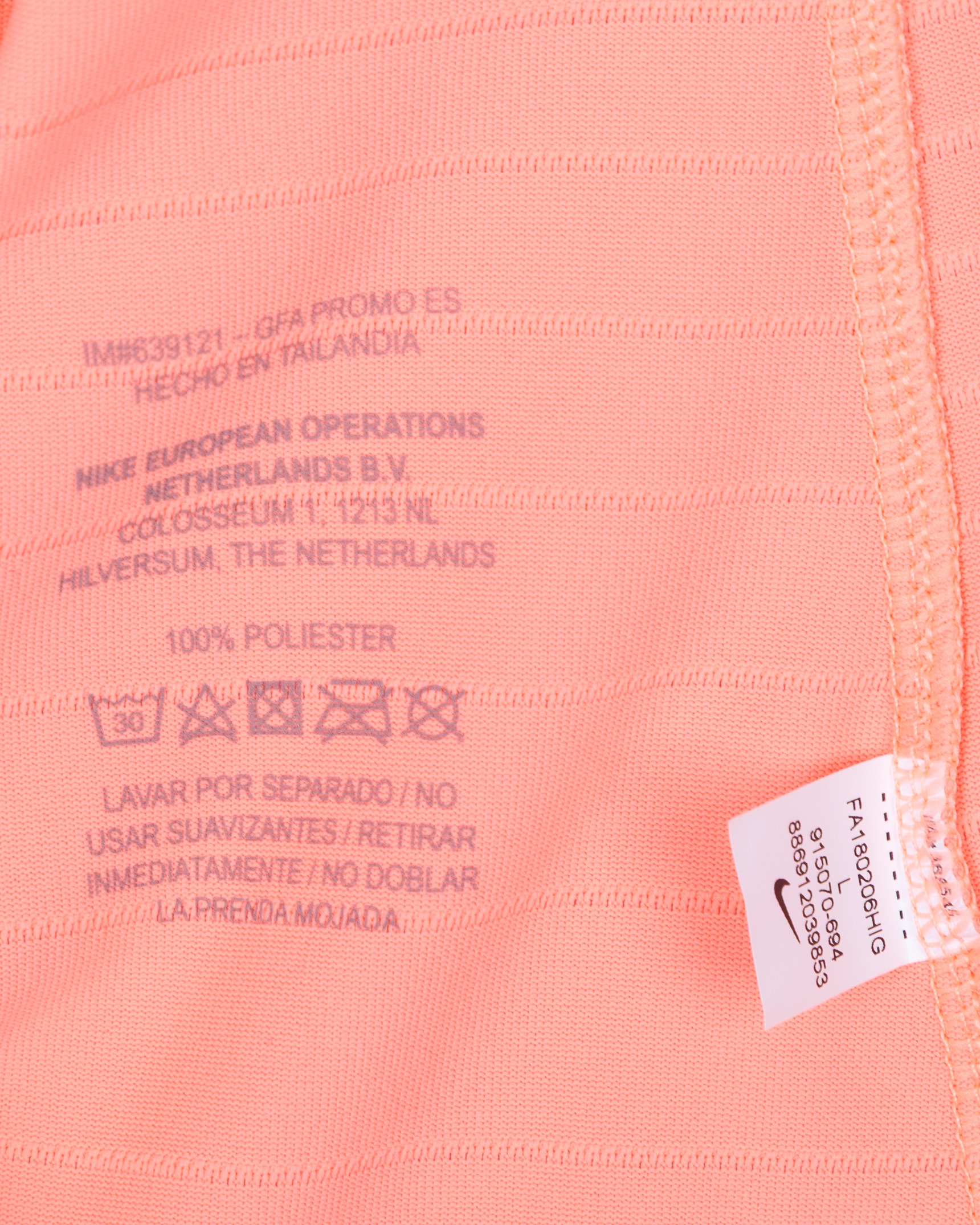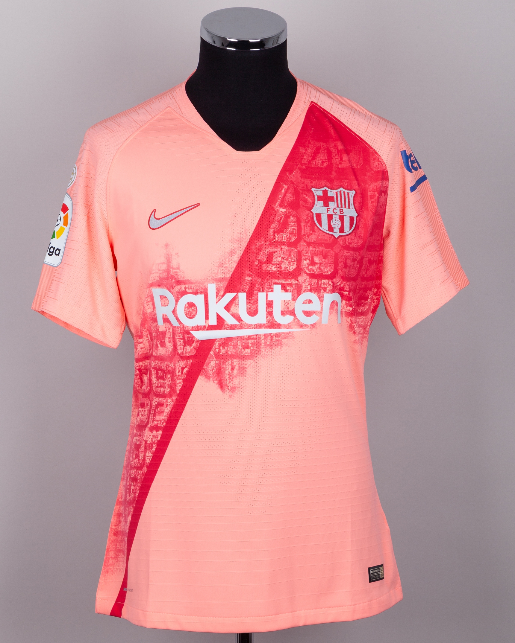 Lionel Messi pink issued No.10 Barcelona short-sleeved shirt, 2018-19 third, Nike, L, with v-neck style collar and printed badge, the reverse lettered MESSI, the right sleeve with La Liga flash