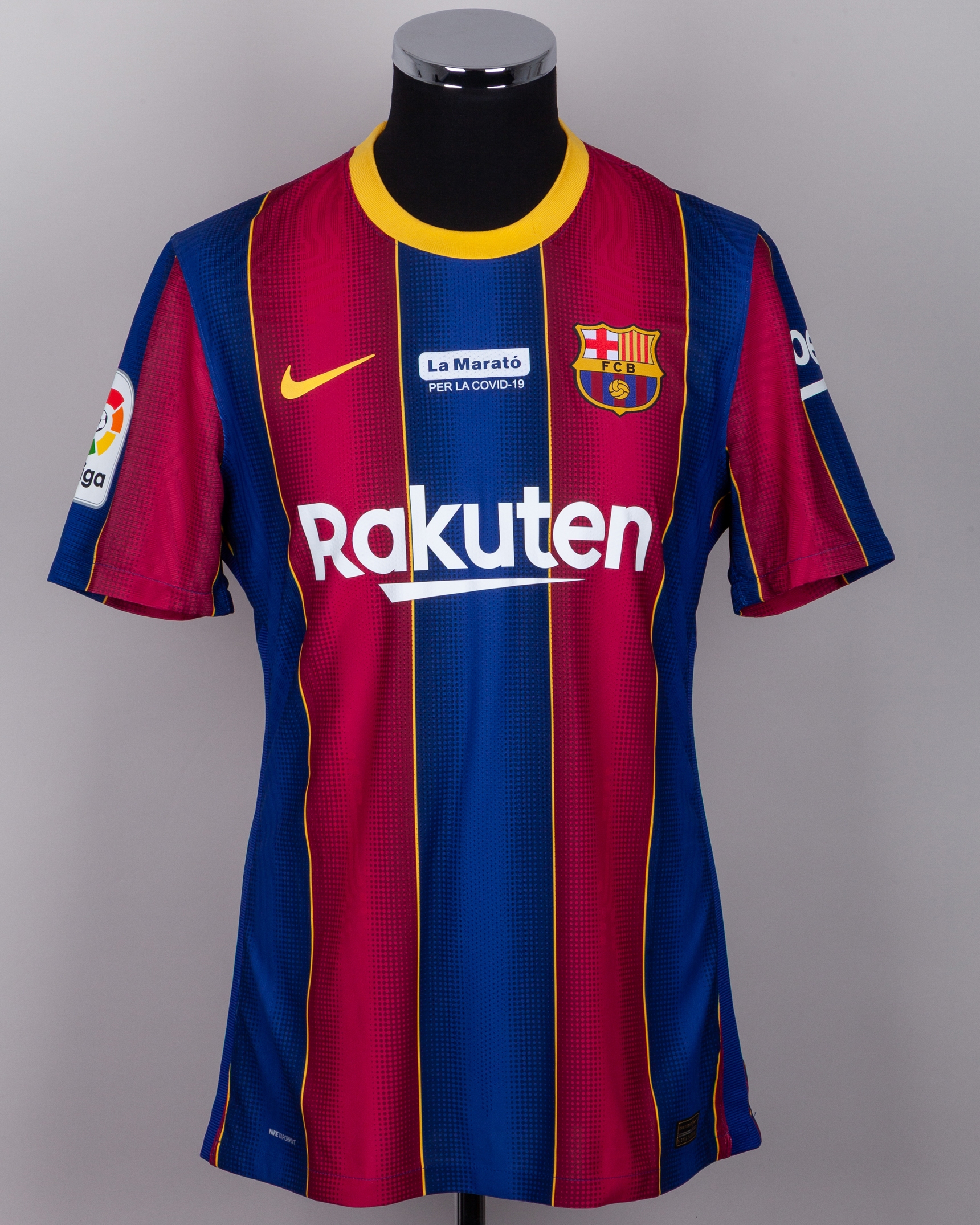 Lionel Messi garnet and blue match-issued No.10 Barcelona v. Valencia short-sleeved shirt, 2020-21 home, Nike, L, with crew-neck collar and printed badge, with La Marato PER LA COVID-19 badge, the reverse lettered MESSI, the right sleeve with La Liga flash