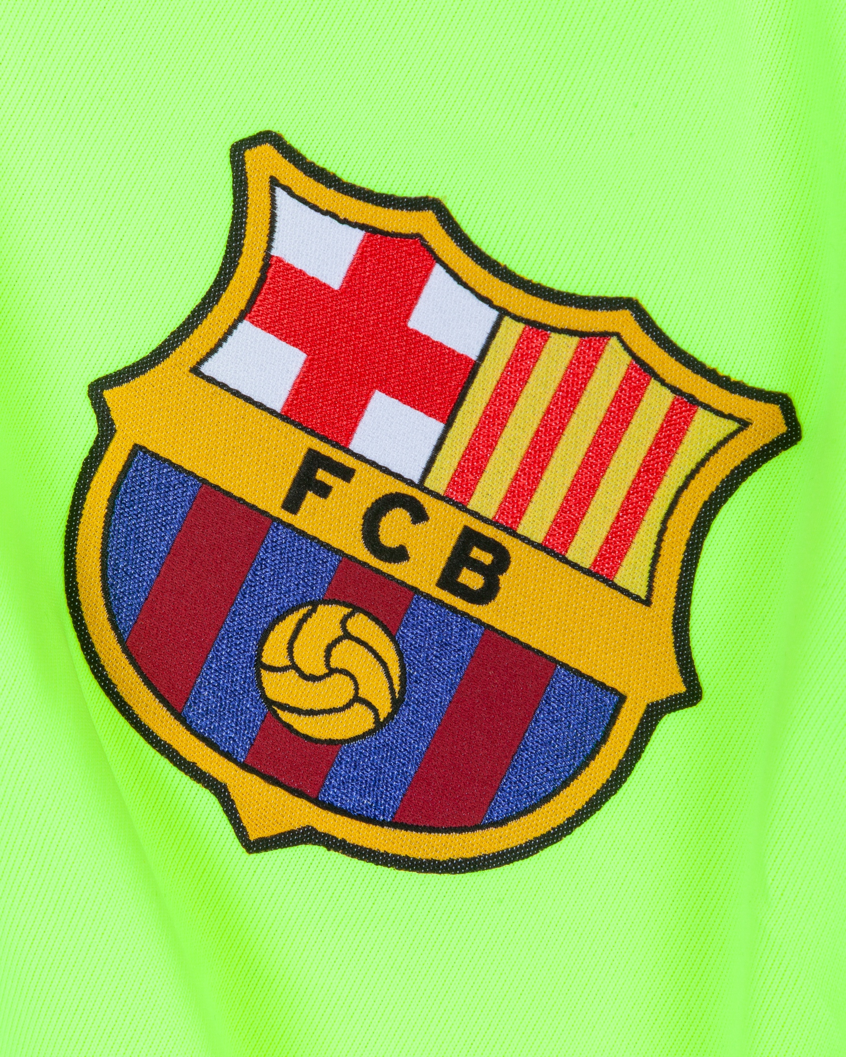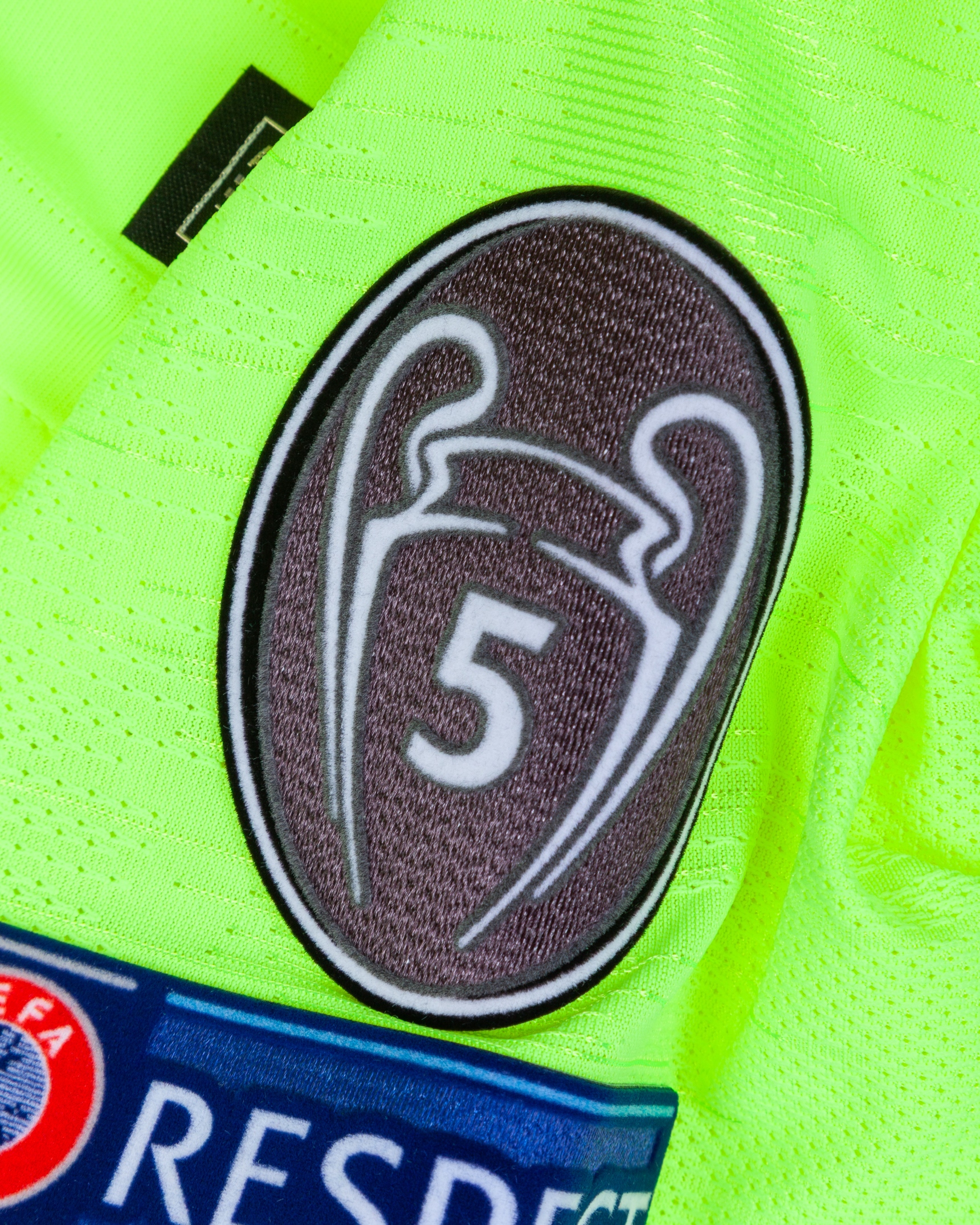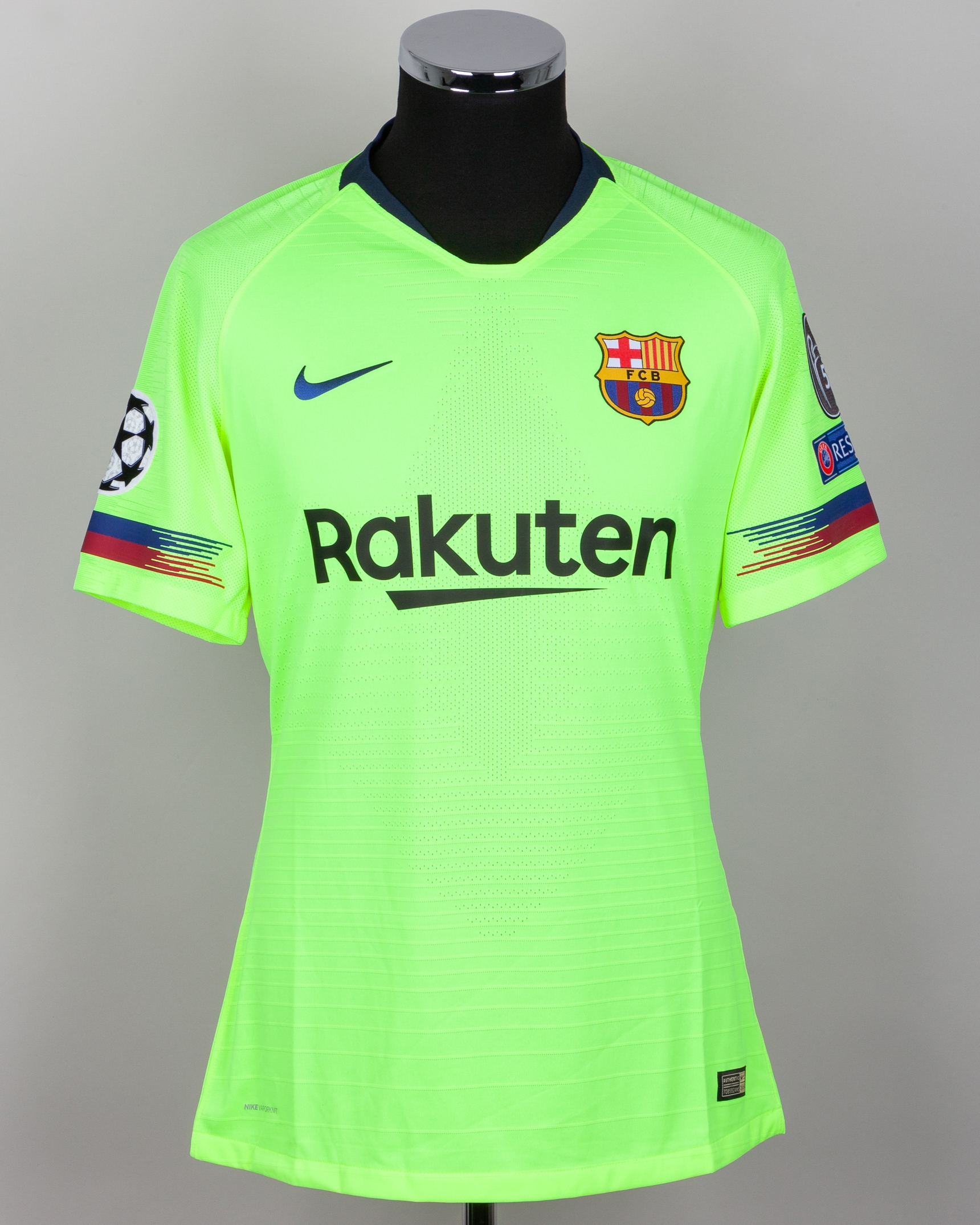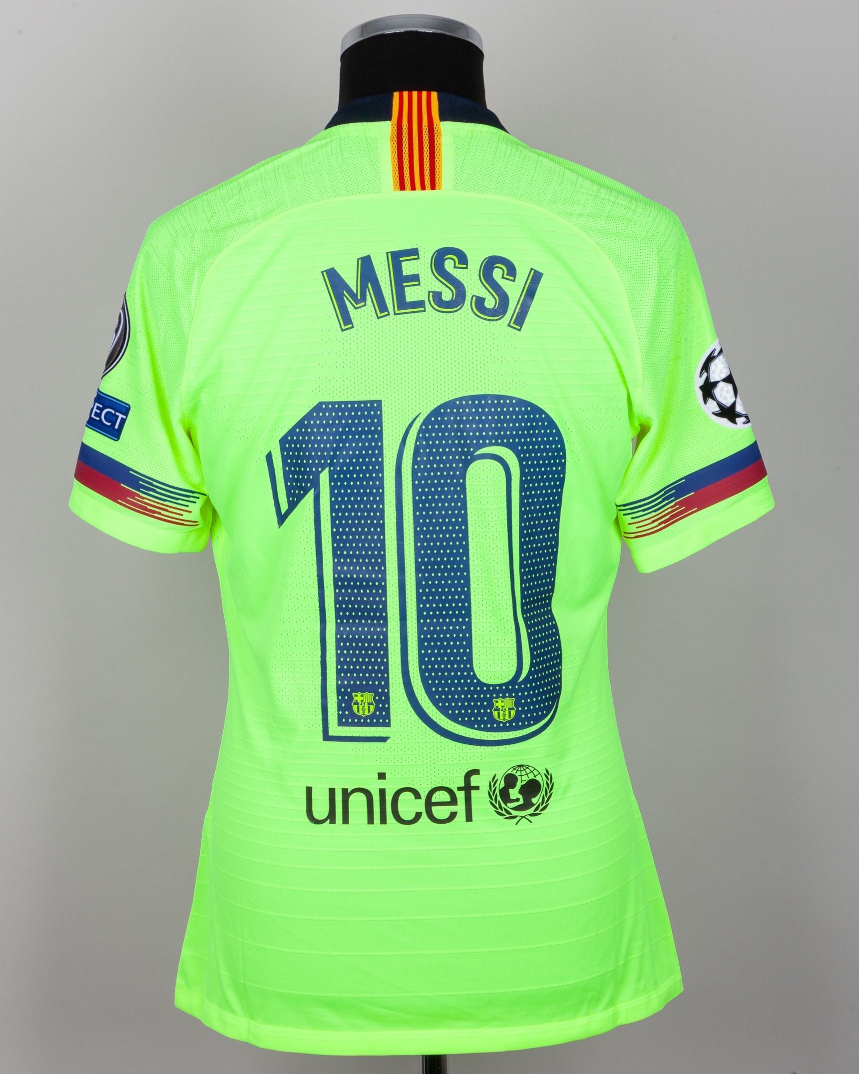 Lionel Messi yellow issued No.10 Barcelona Champions League short-sleeved shirt, 2018-19 away, Nike, L, with v-neck style collar and printed badge, the reverse lettered MESSI, the right sleeve with Champions League flash and the left sleeve with respect and 5 Champions League flashes