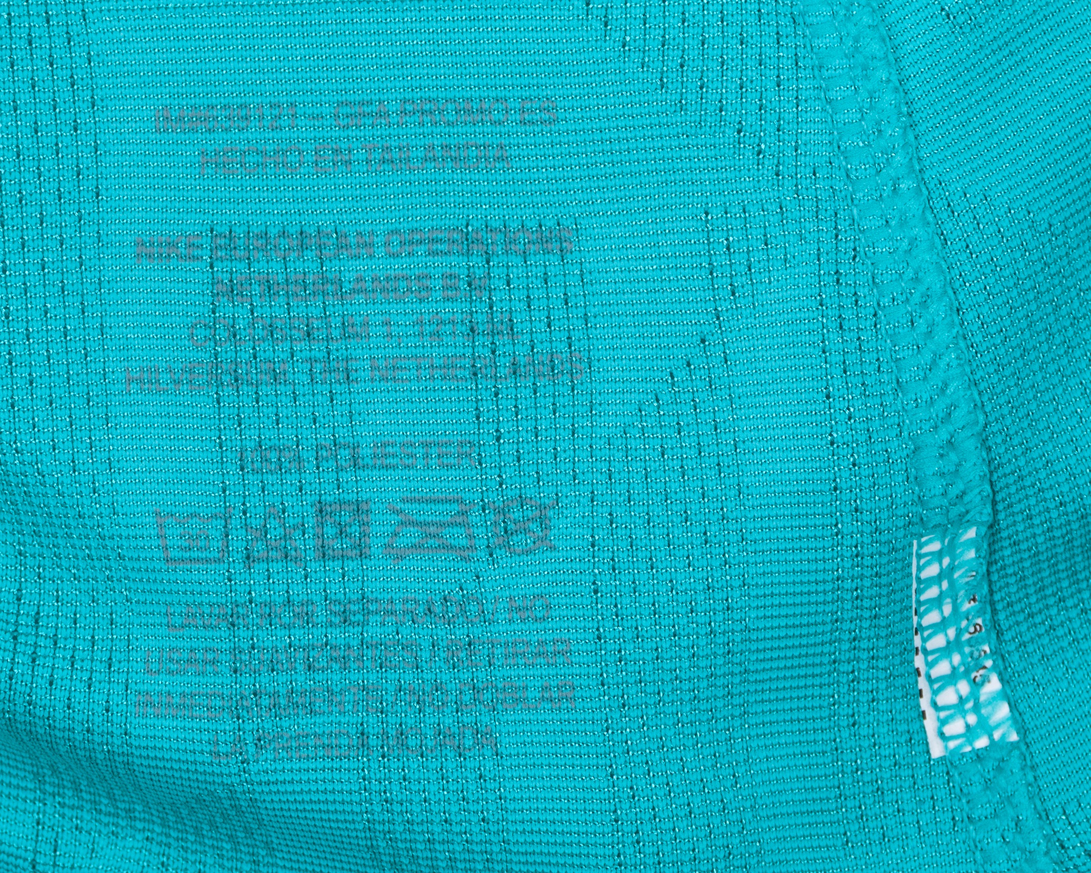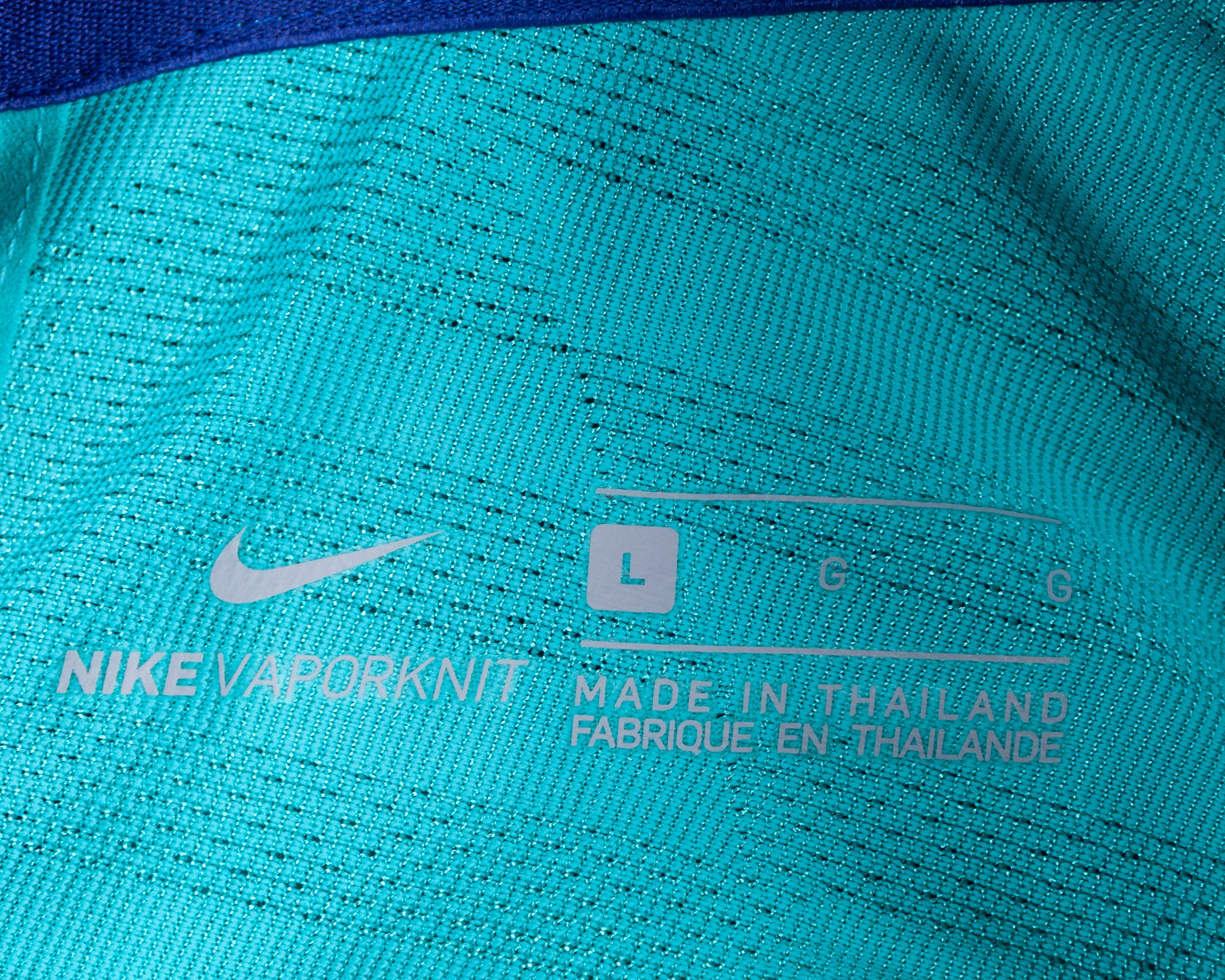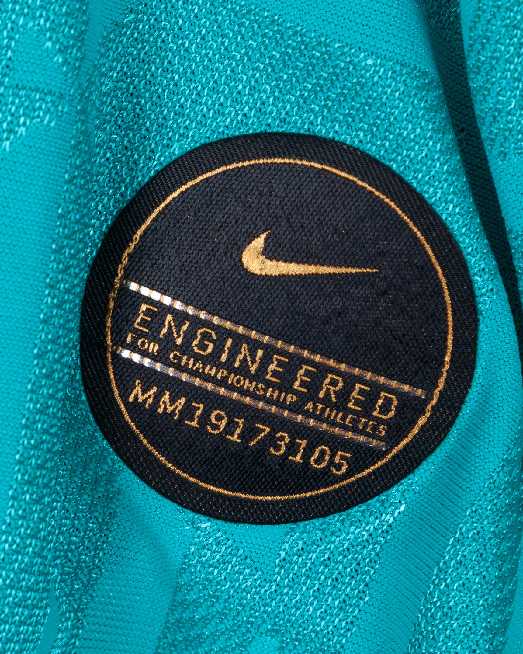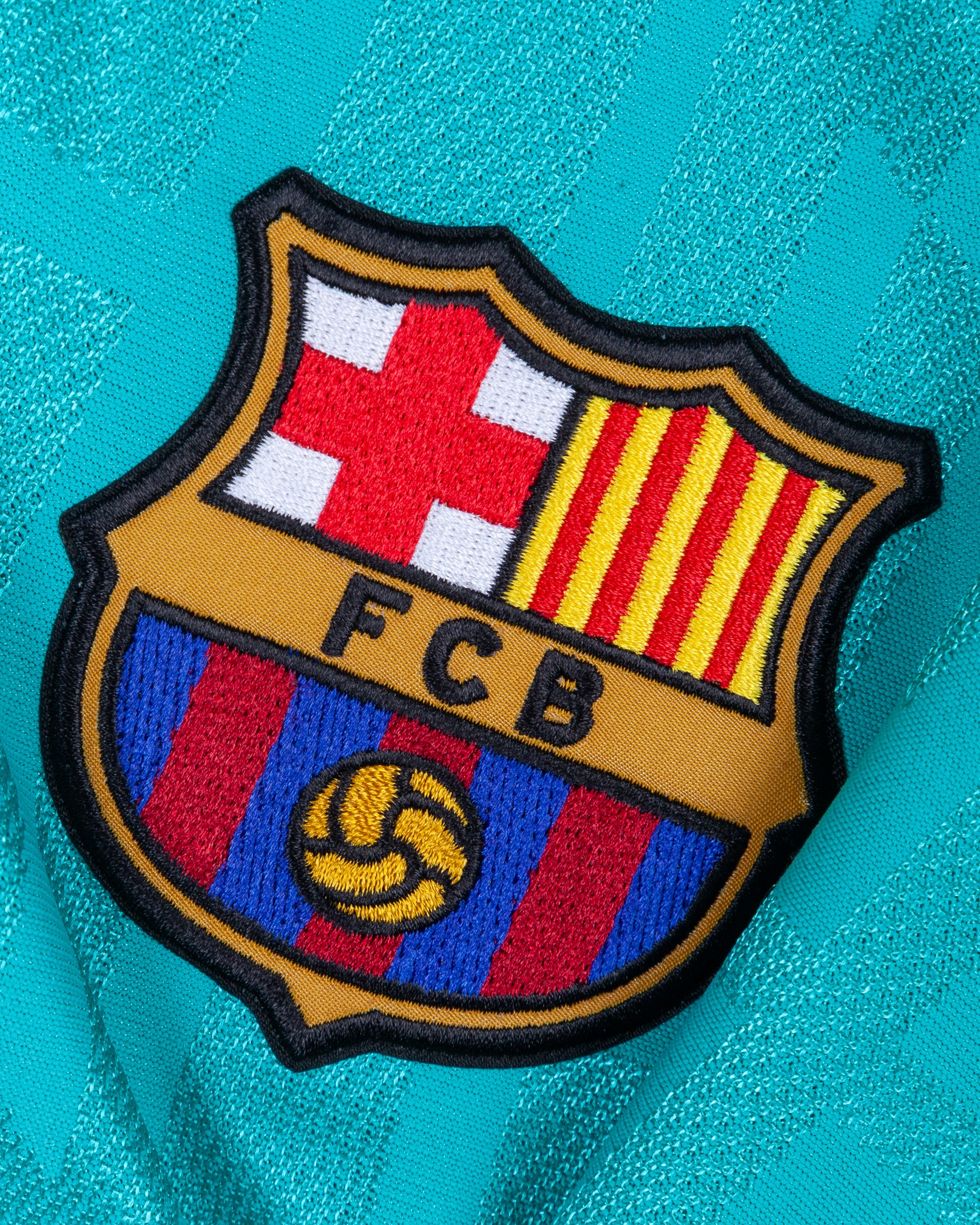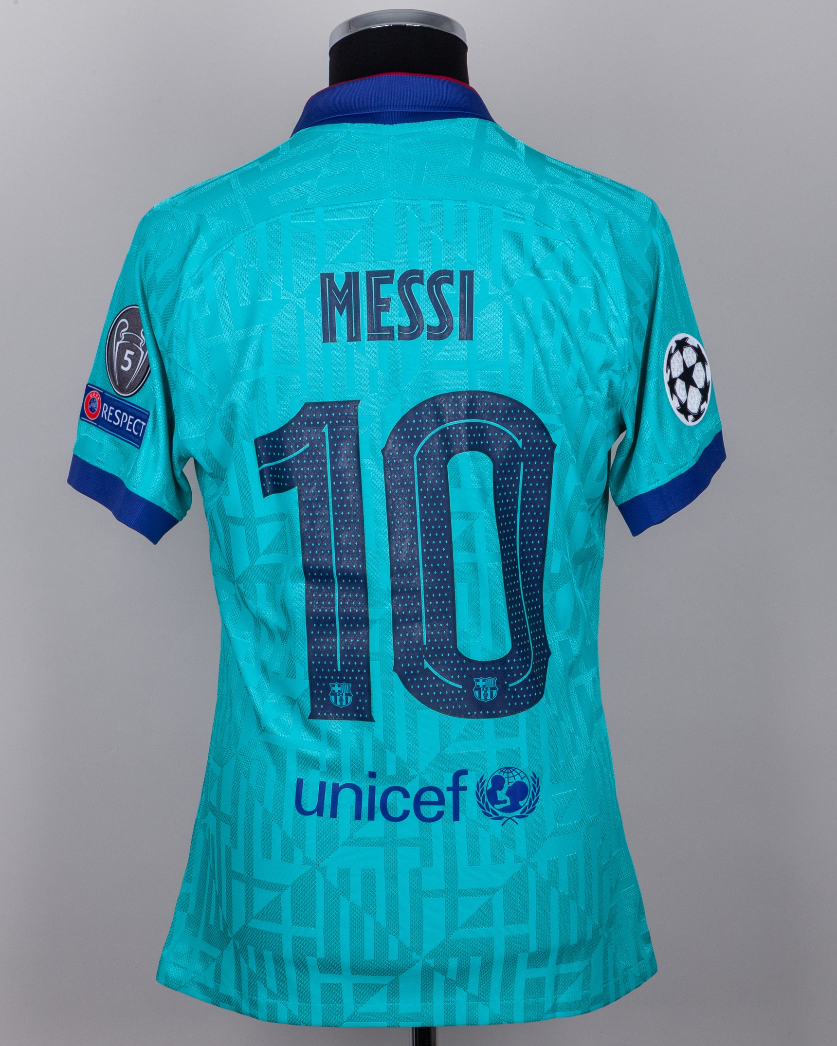 Lionel Messi teal green issued No.10 Barcelona Champions League short-sleeved shirt, 2019-20 third, Nike, L, with v-neck collar and embroidered printed on badge inscribed FCB, the reverse lettered MESSI, the right sleeve with Champions League flash and the left sleeve with respect and 5 Champions League flashes