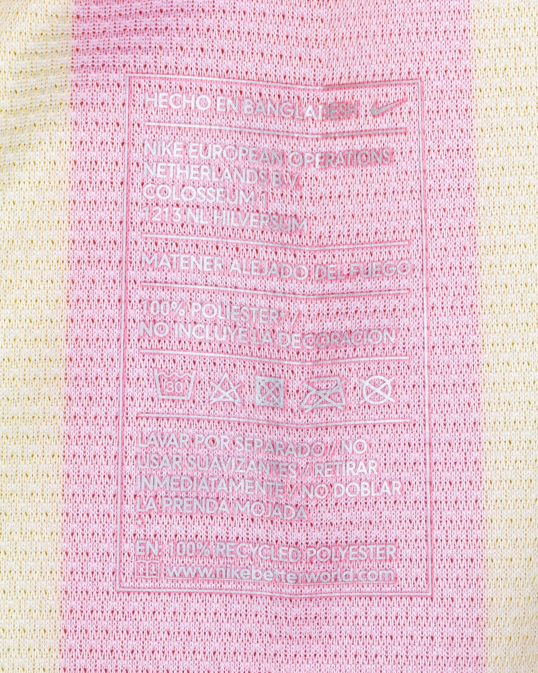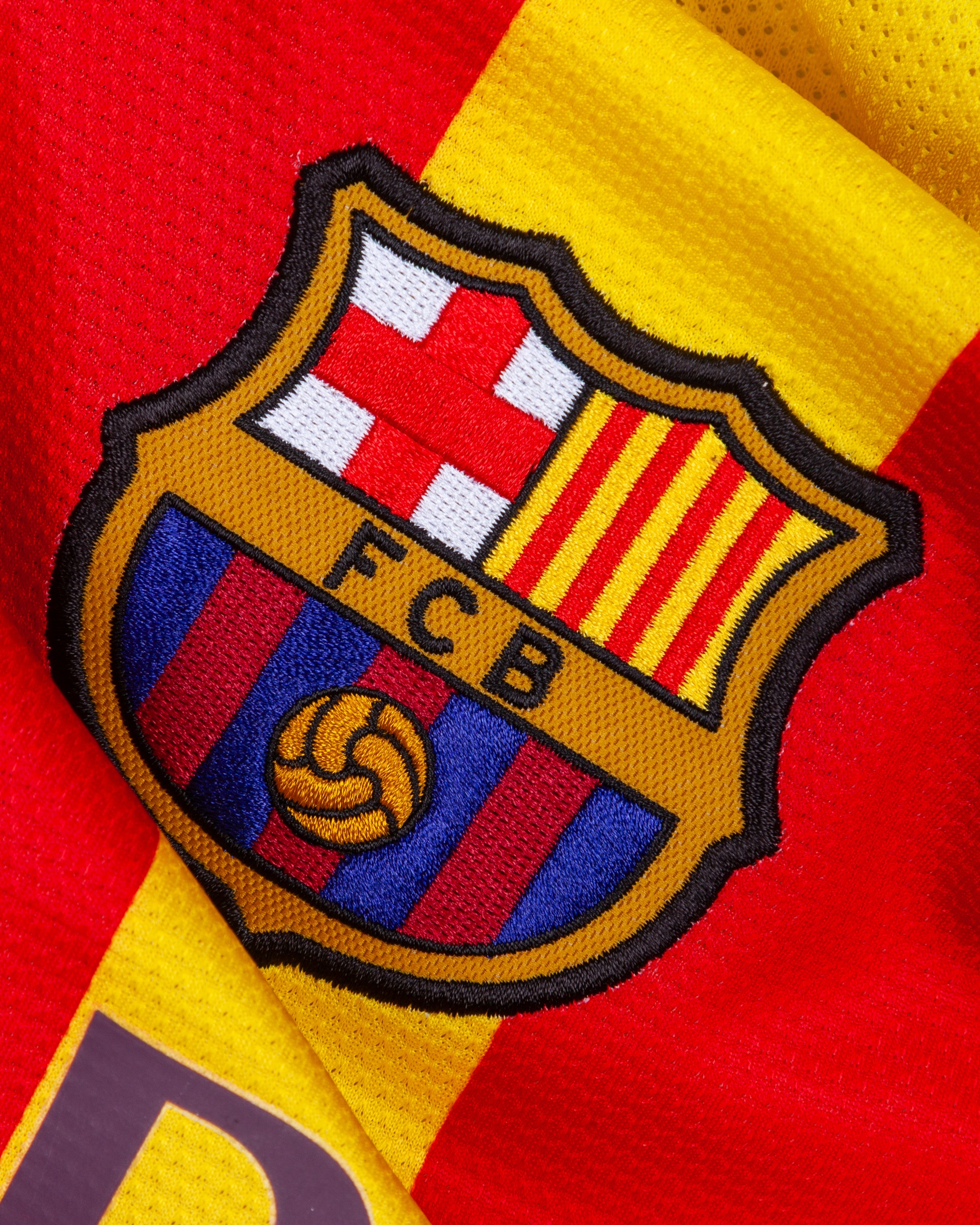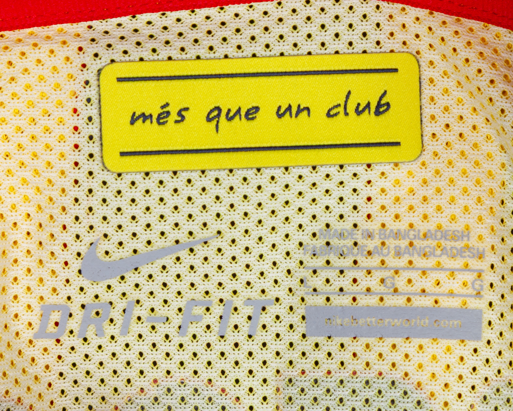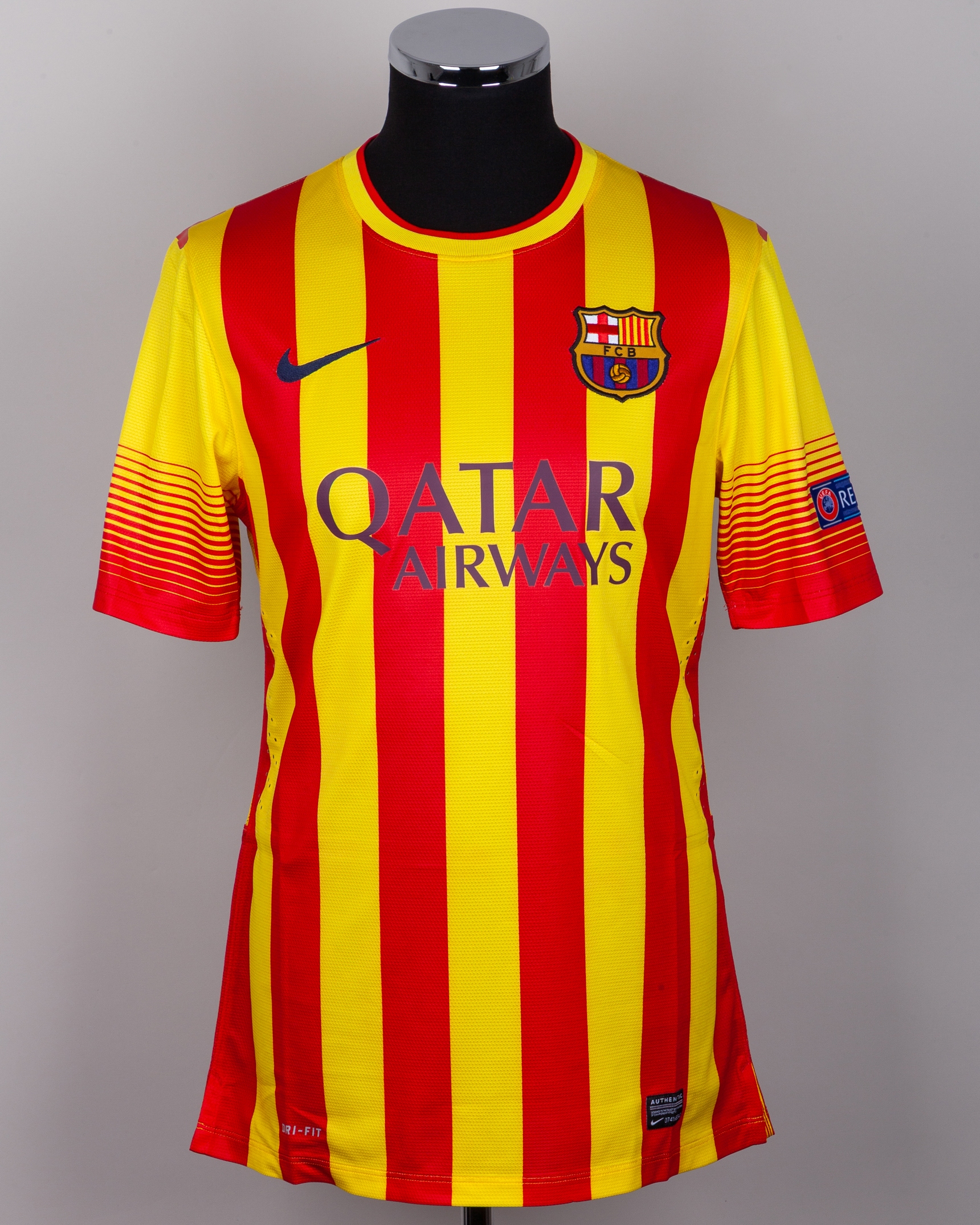 Lionel Messi red and yellow match-issued No.10 Barcelona v. AC Milan short-sleeved shirt, 2013-14 away, Nike, L, with crew-neck collar and embroidered cloth badge inscribed FCB, the reverse lettered MESSI, the right sleeve with Champions League flash and the left sleeve with respect flash