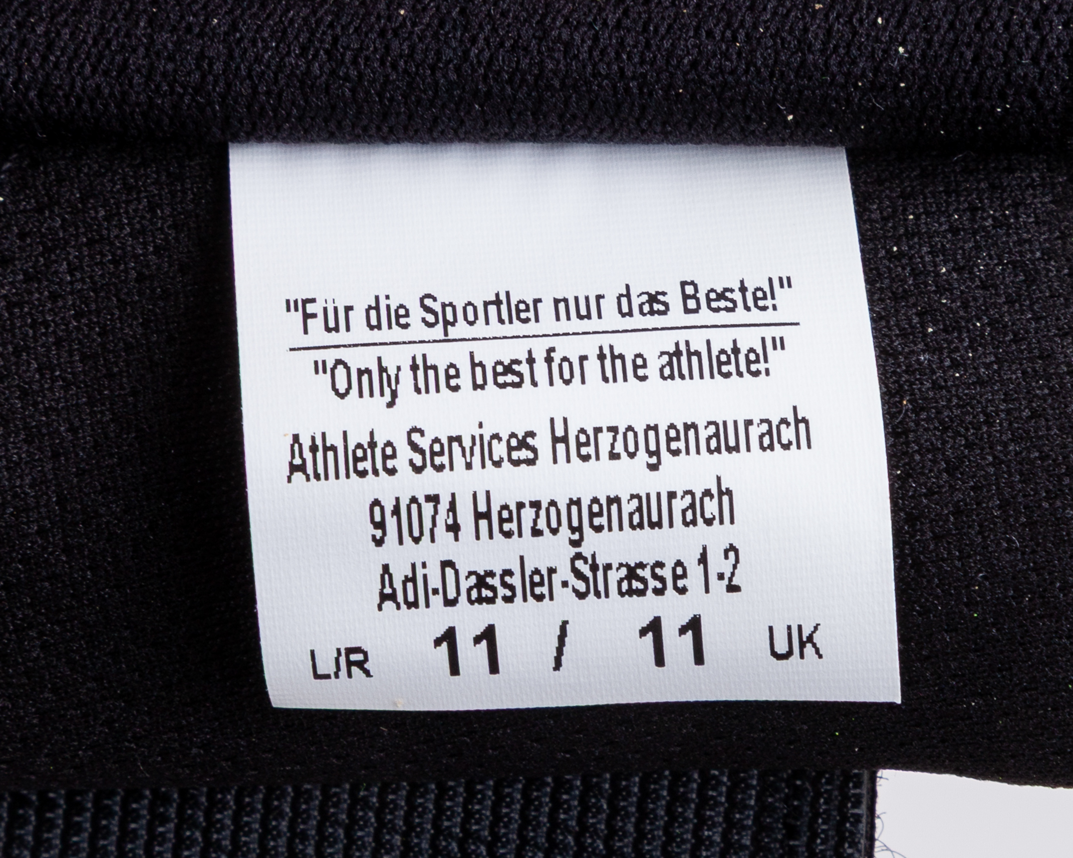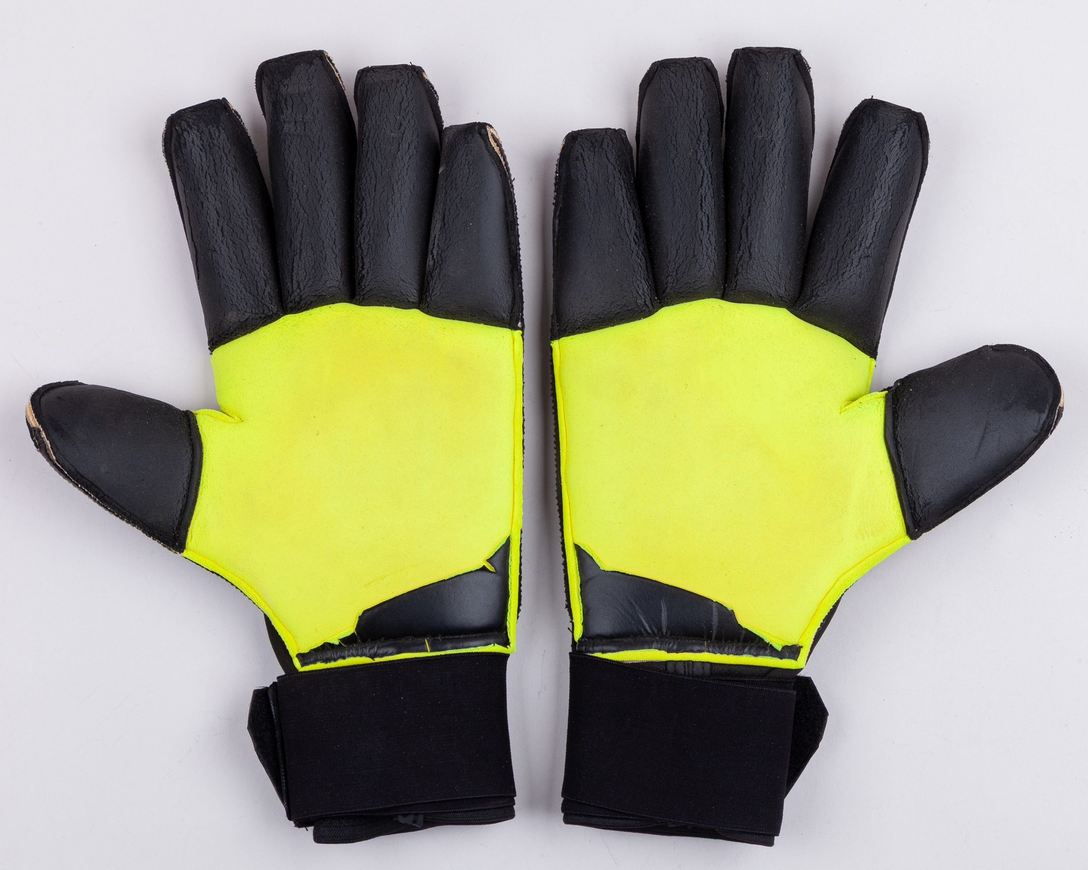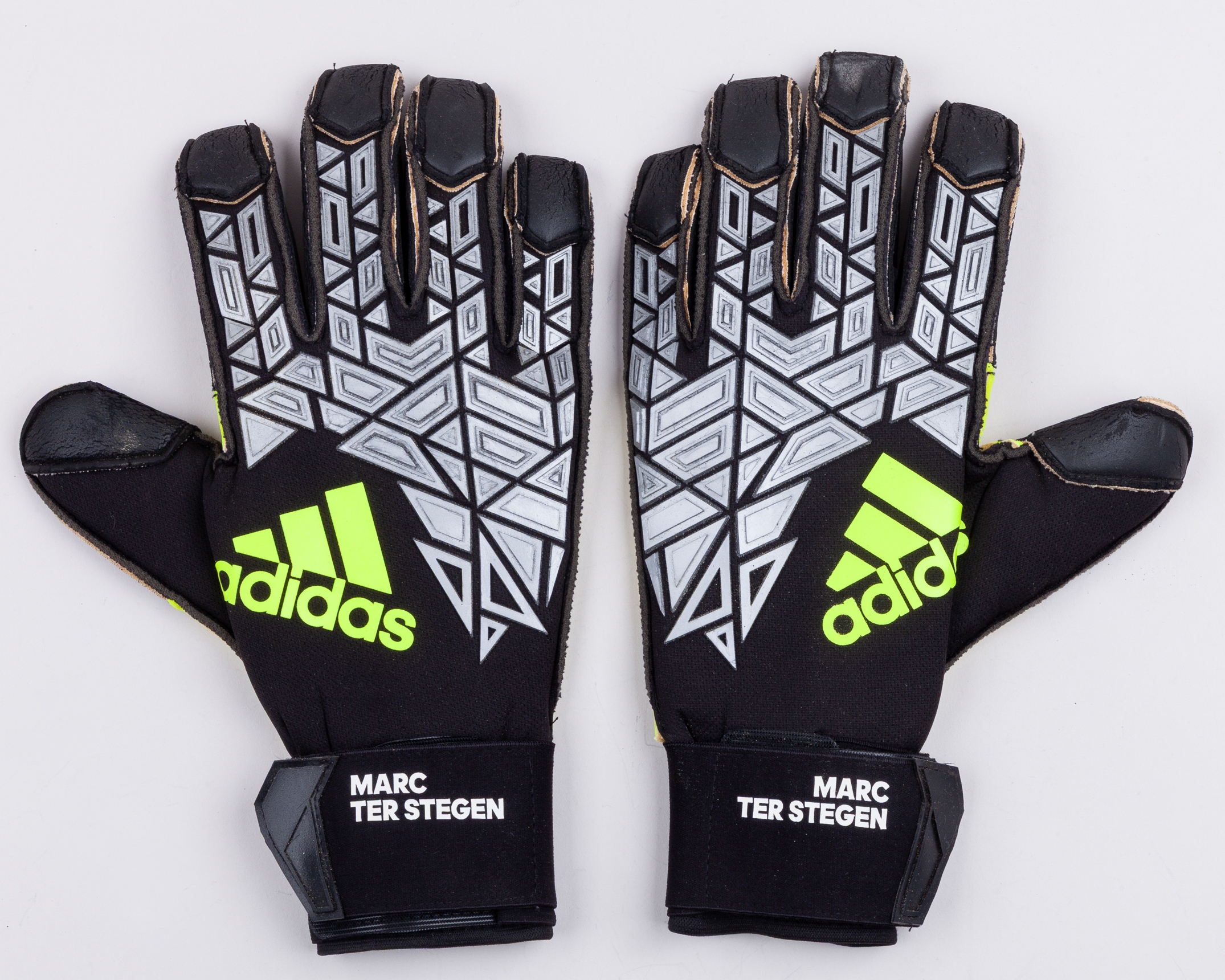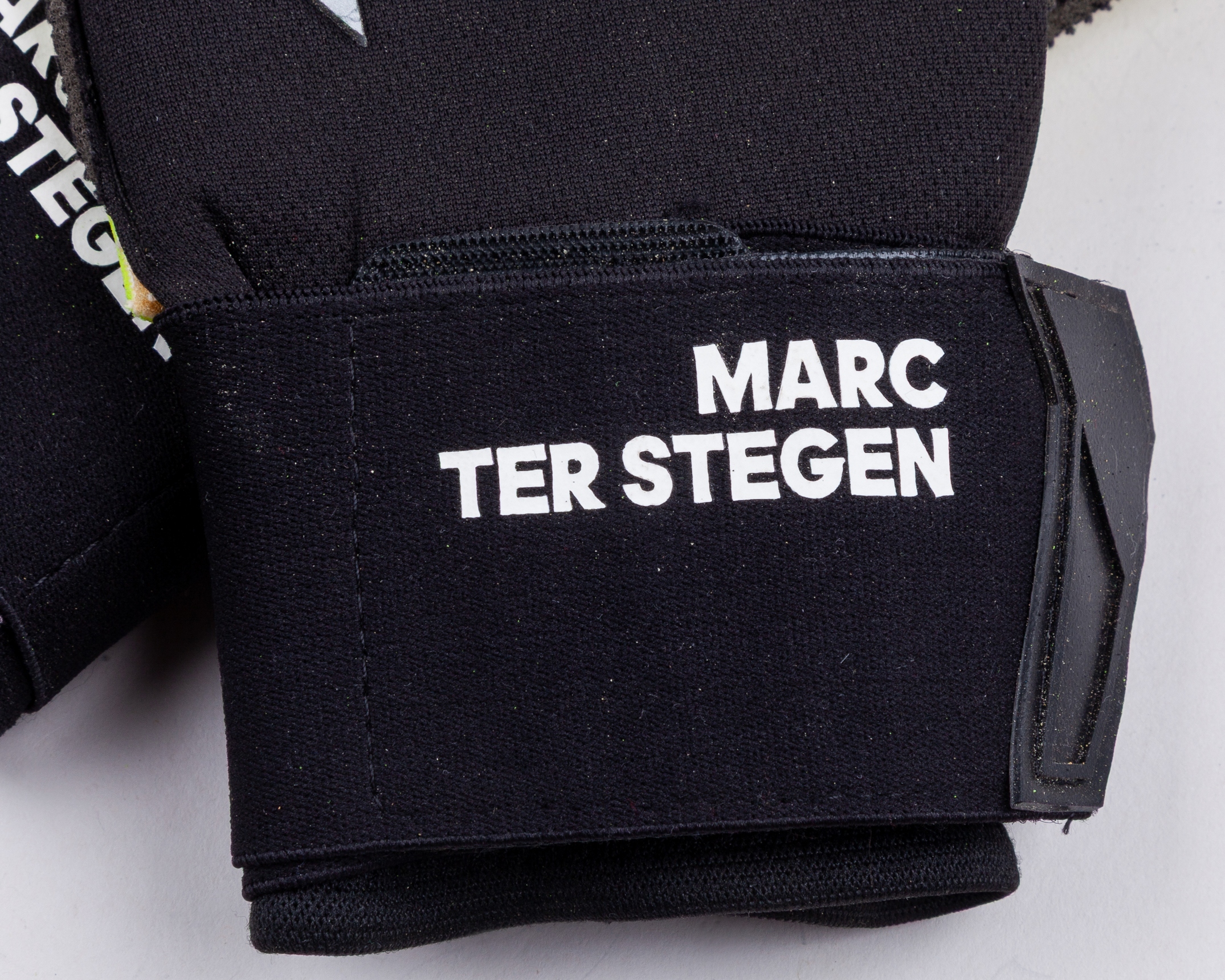 Marc-Andre Ter Stegen black Adidas goalkeeper gloves, Euros 2016, used in training, UK11, with MARC TER STEGEN decal on straps, the gloves are hardened and brittle