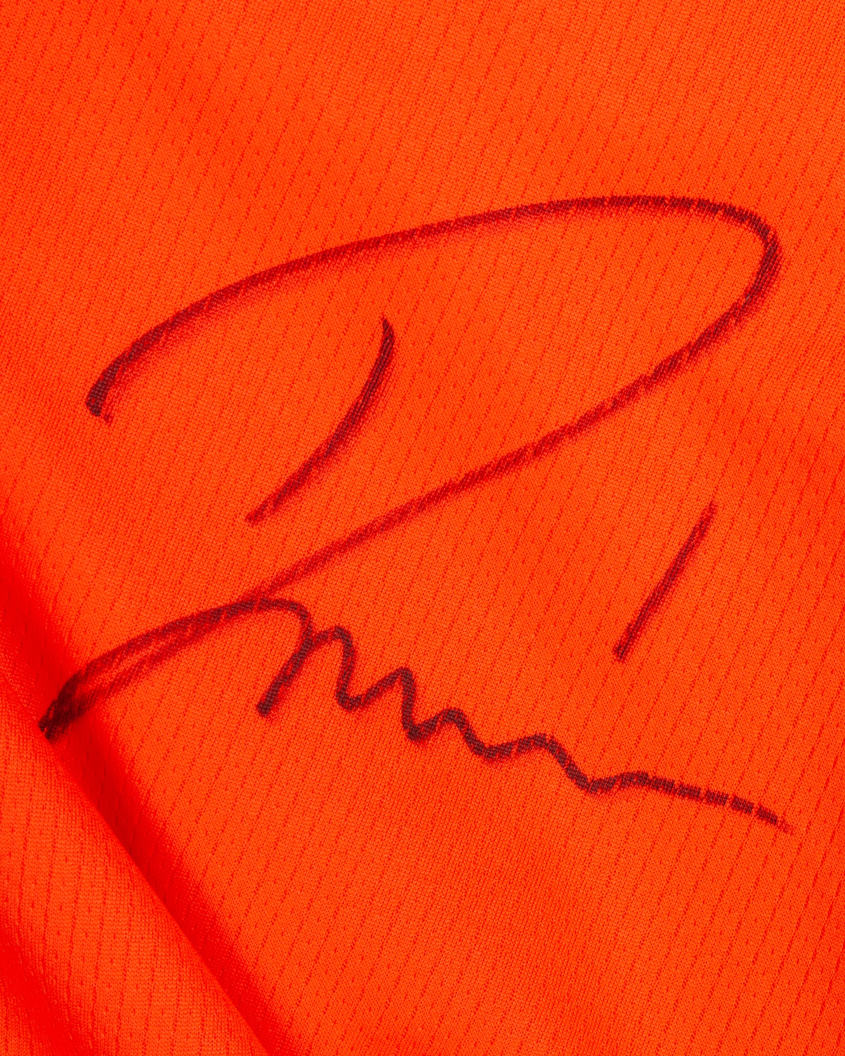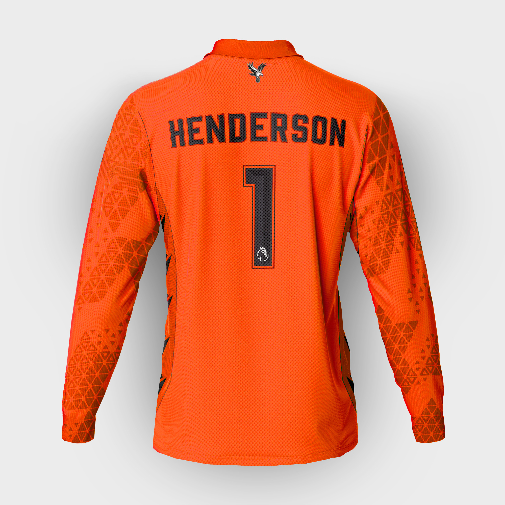 Dean Henderson No.1 Crystal Palace v. Brighton (Away) match issued, signed Premier League short-sleeved shirt 2026, Macron, with crew-neck collar and printed badge, the reverse lettered HENDERSON, the right sleeve with Premier League logo