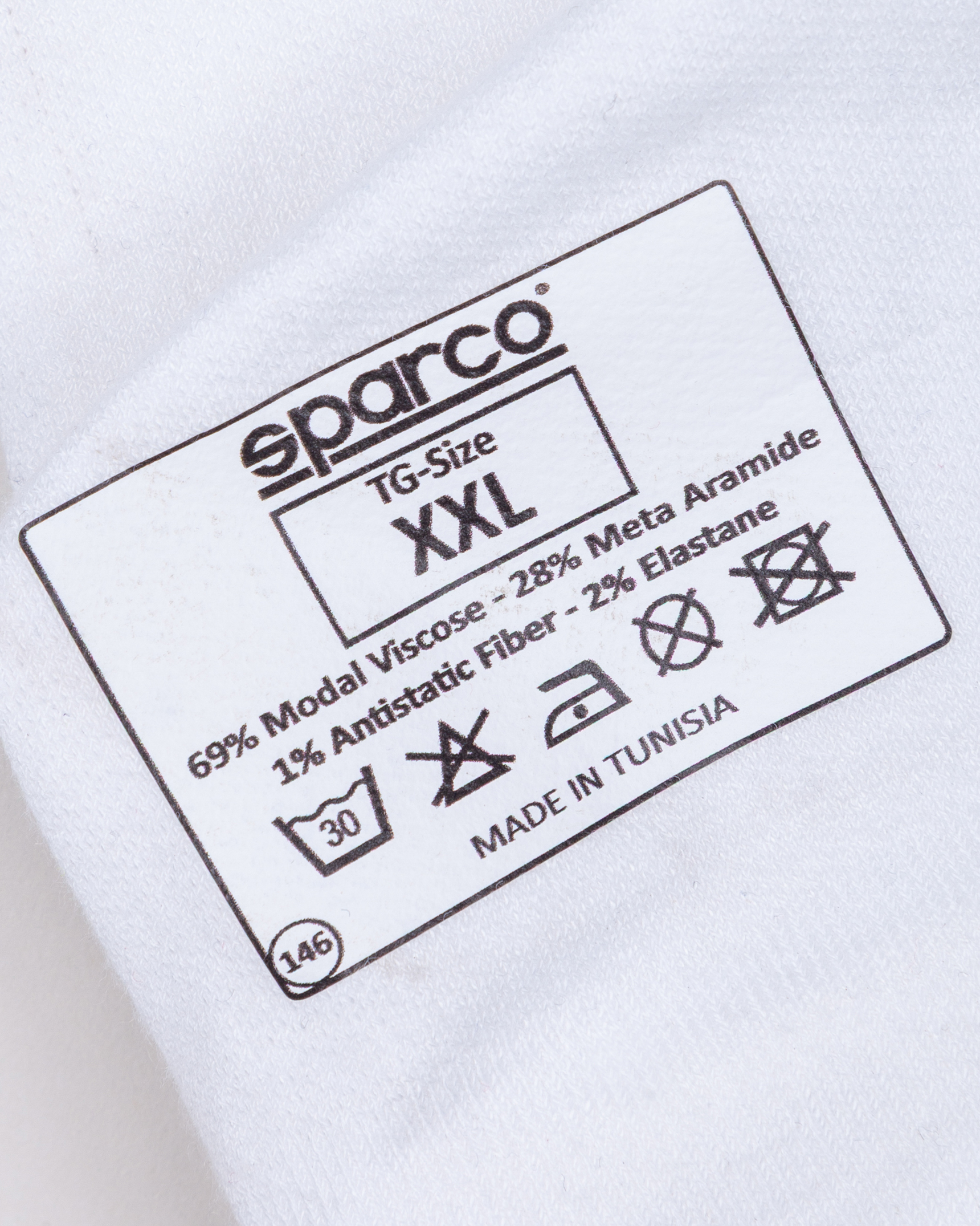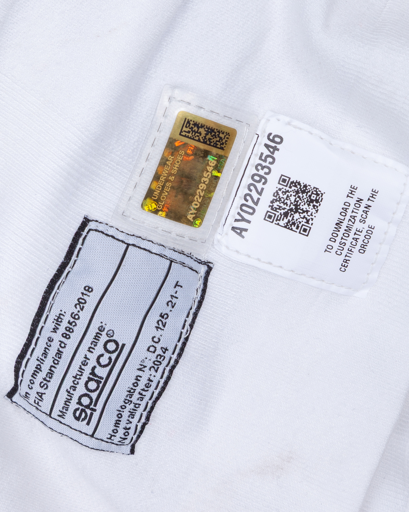The Sparco label reads: In compliance with: FIA Standard 8856-2018 / Manufacturer name: Sparco / Homologation No: DC.125.21-T / Not valid after: 2034.