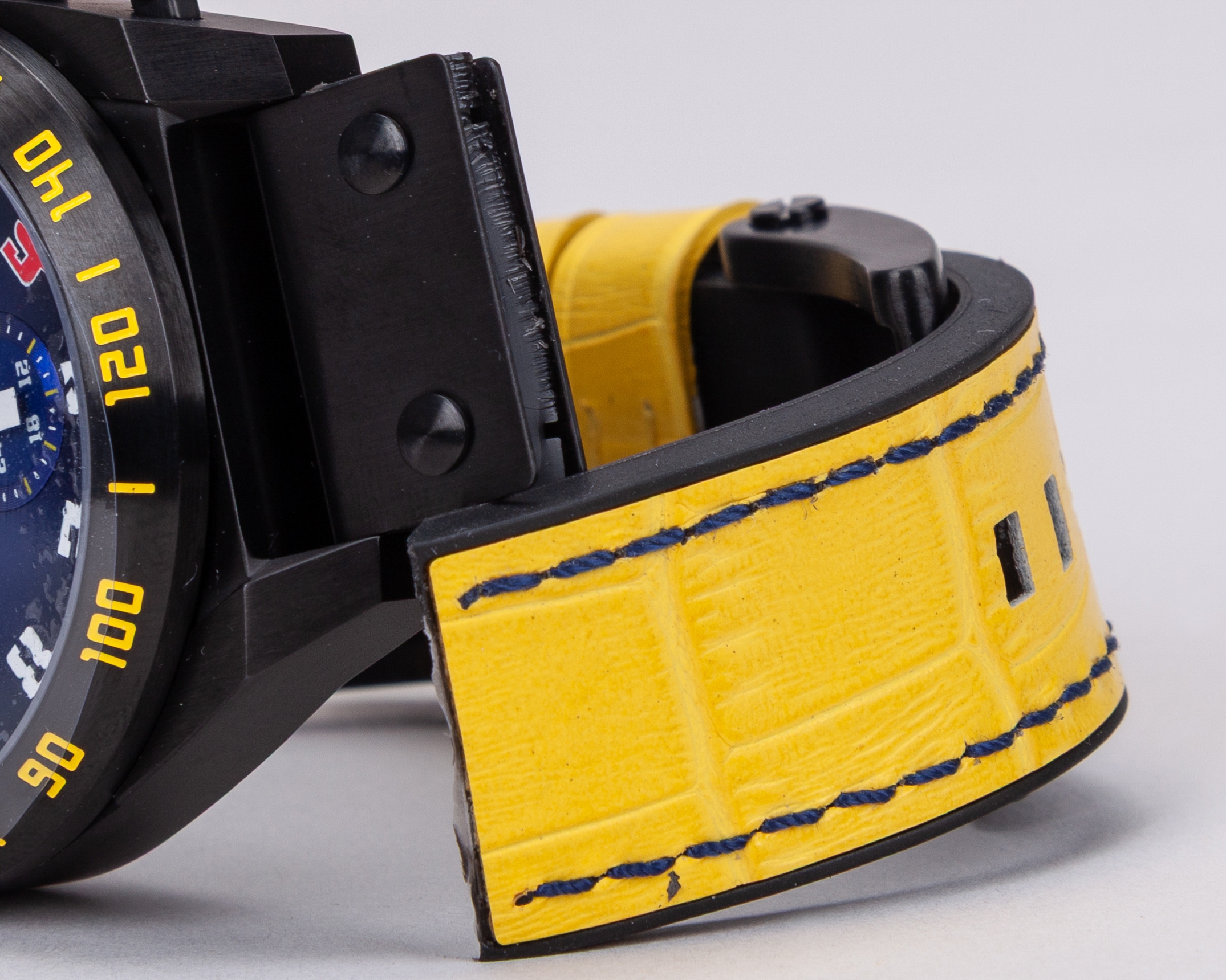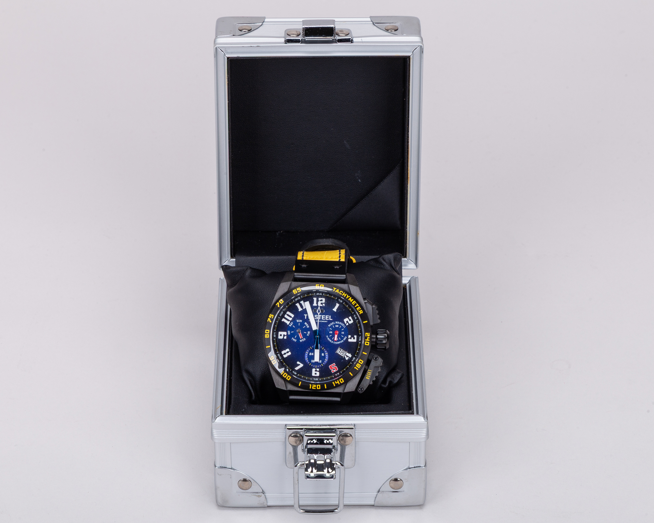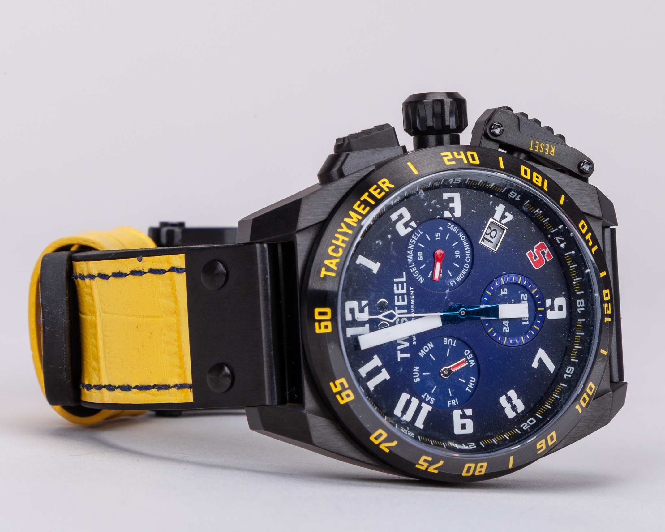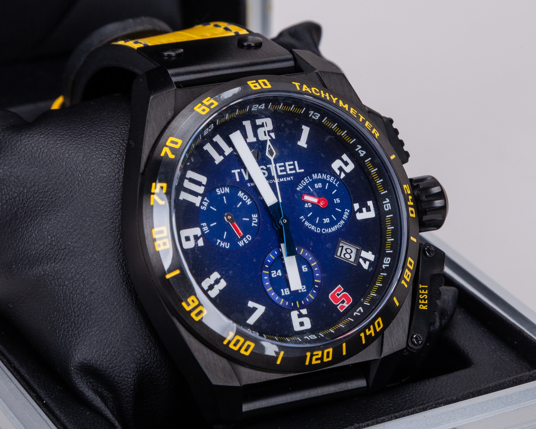 This watch is inspired by Mansell's championship winning Williams FW14B car. Powered by a Swiss made chronograph movement and features a black case , anti-reflective sapphire crystal, a yellow leather strap and a special Nigel Mansell case back.