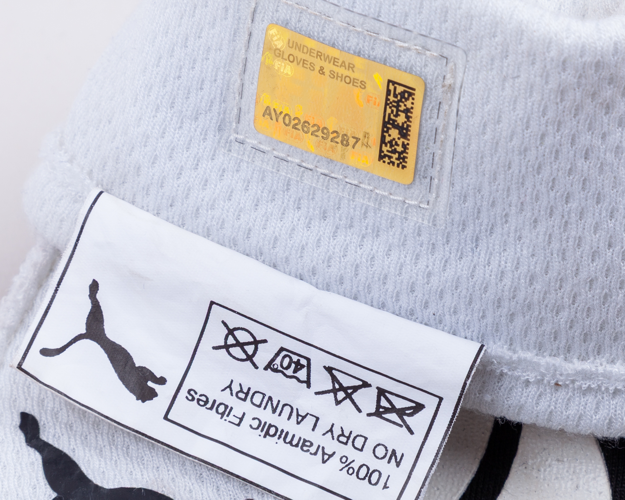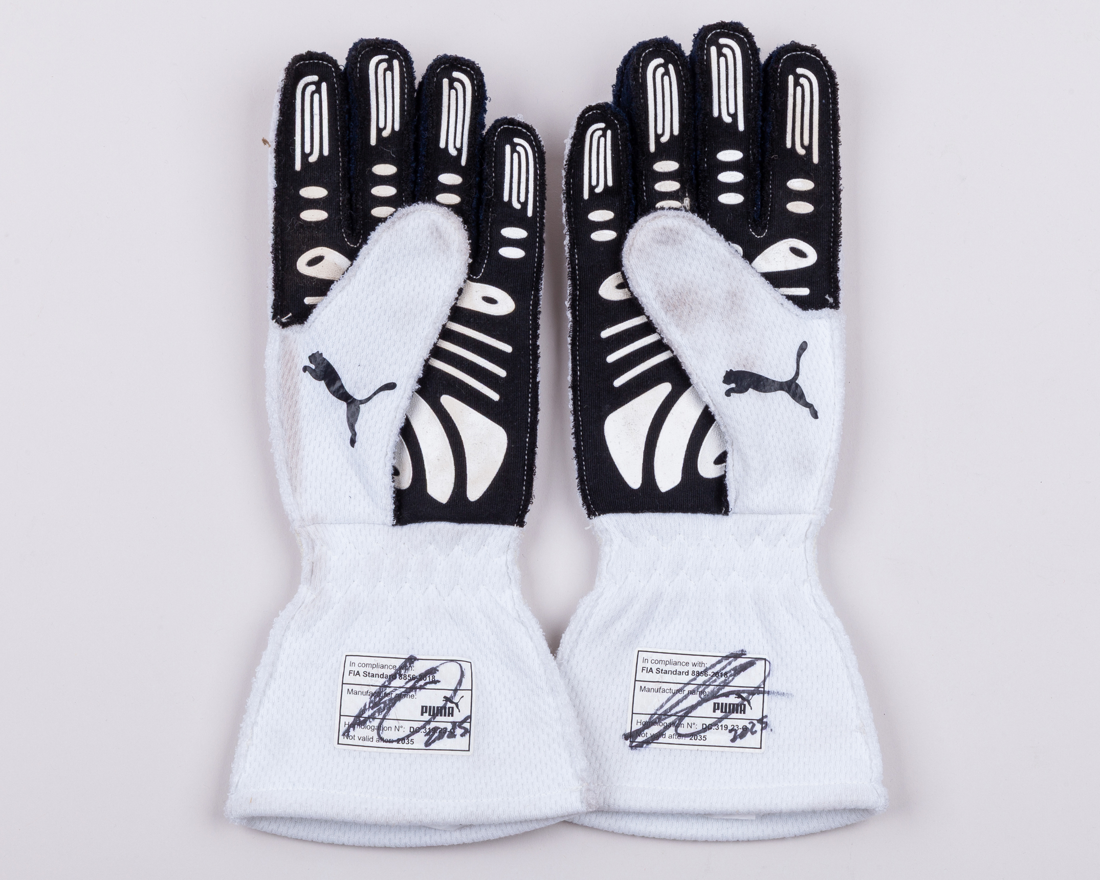 The gloves are crafted by Puma. The Puma white label on each glove reads: In compliance with: FIA Standard 8856-2018 / Manufacturer name: Puma / Homologation No: DC.319.23-G / Not valid after: 2035.