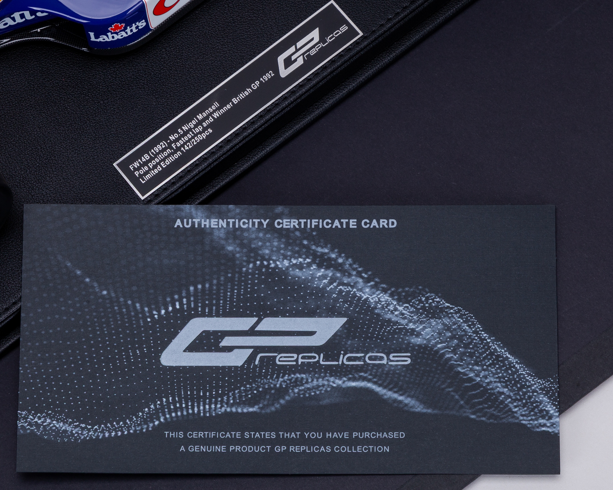 Nigel has personally signed the model car, the GP Replicas certificate, and the outer box.