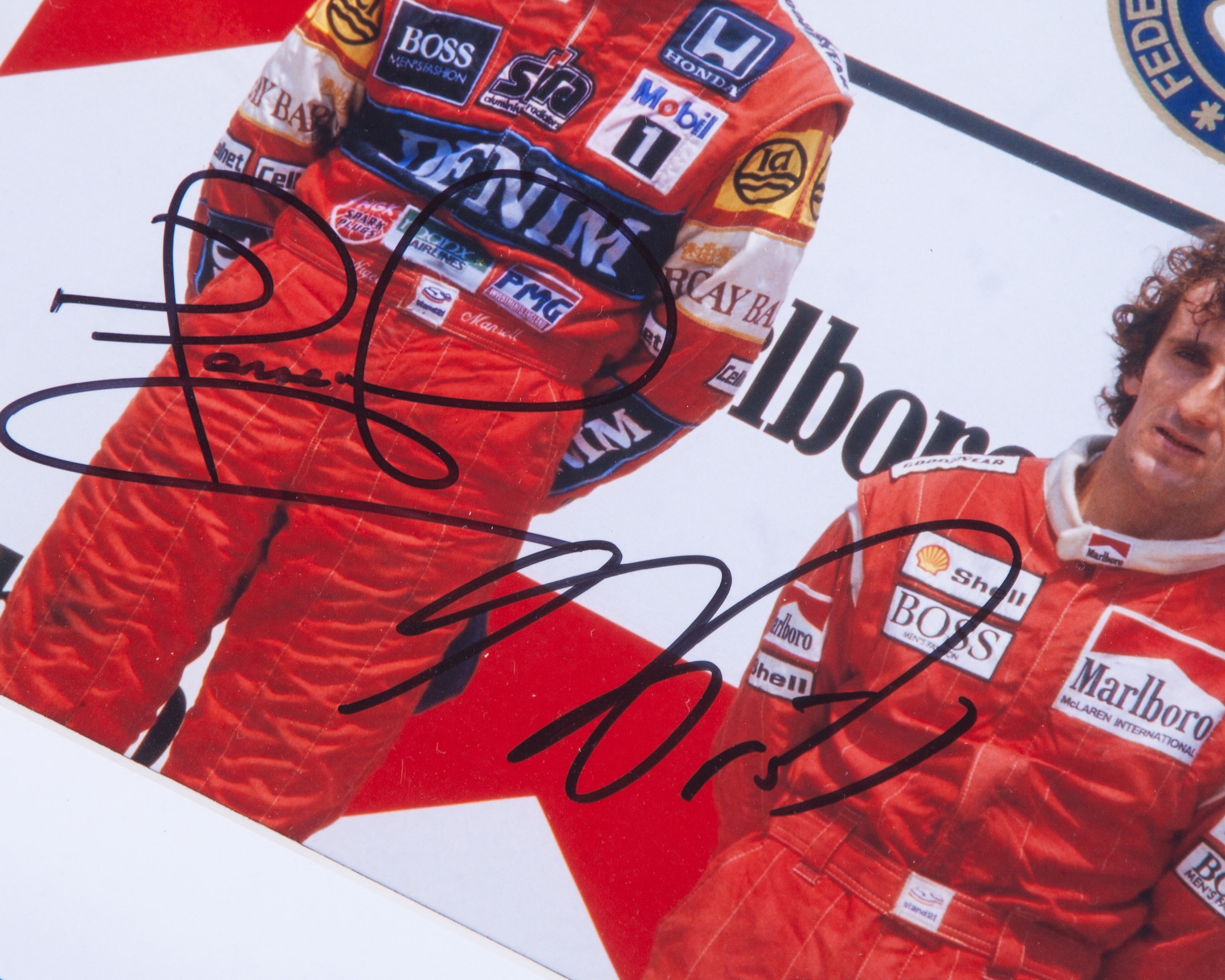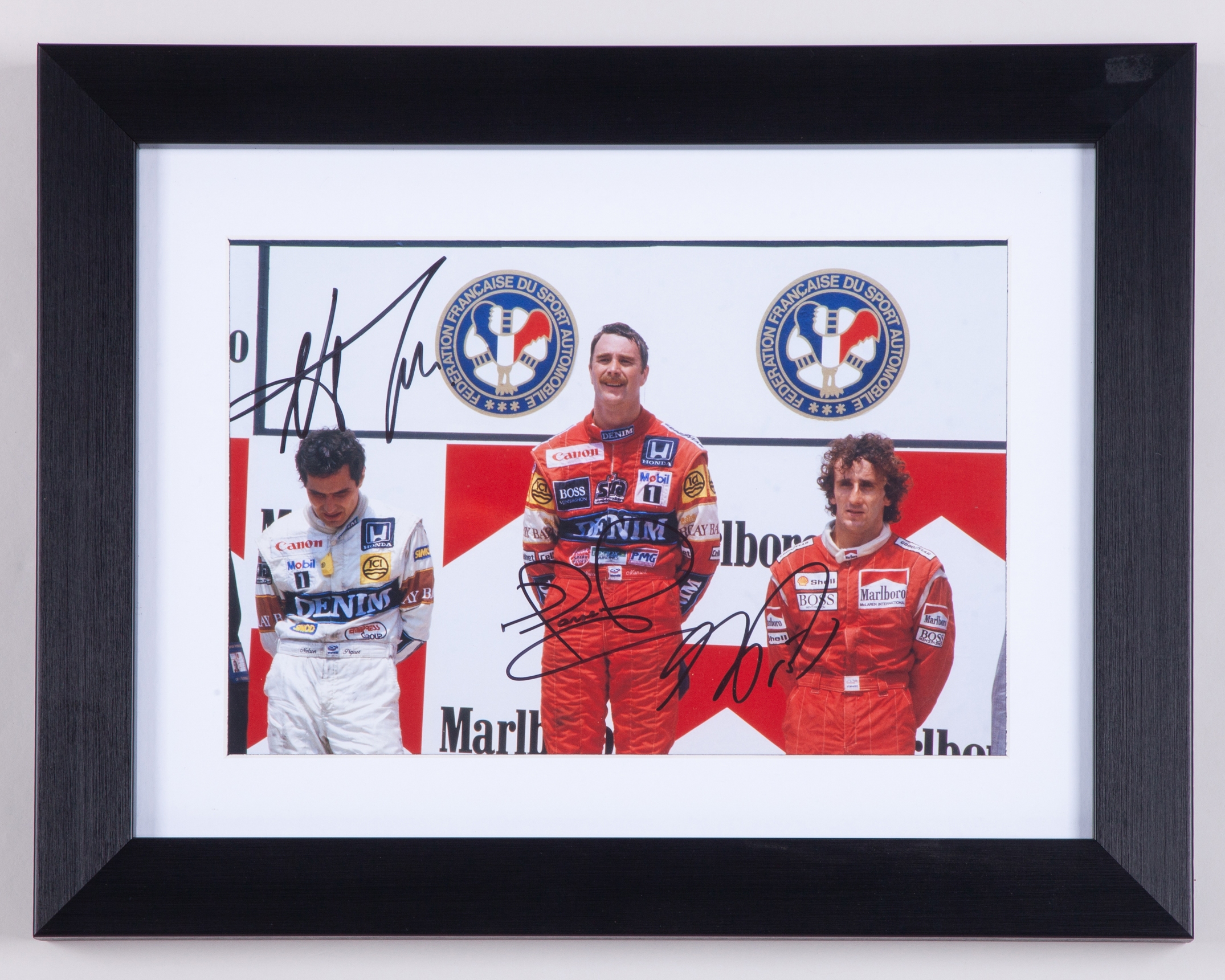 The print is professionally mounted, framed and glazed, and is personally hand signed by F1 World Champions Nigel Mansell, Alain Prost, and Nelson Piquet.