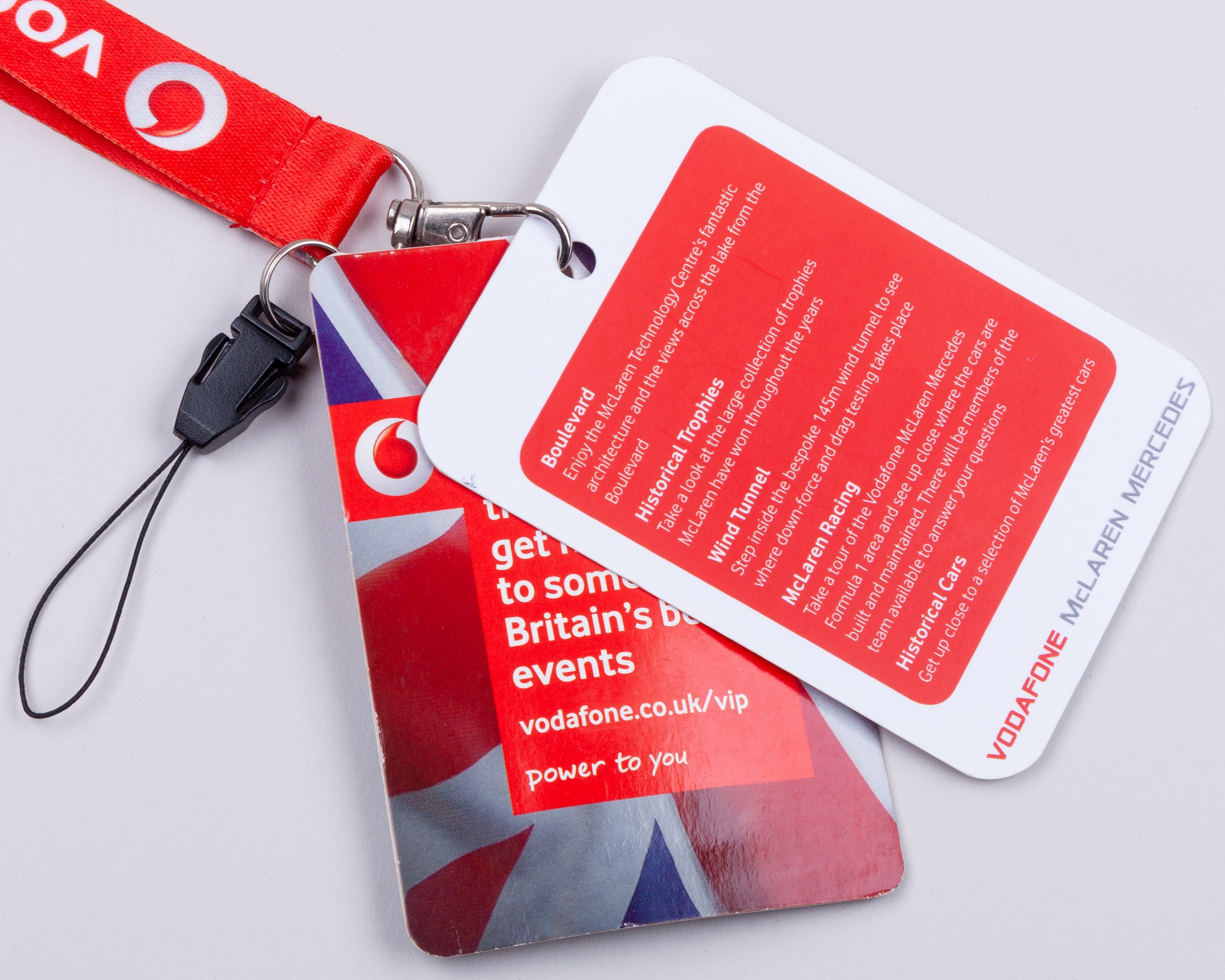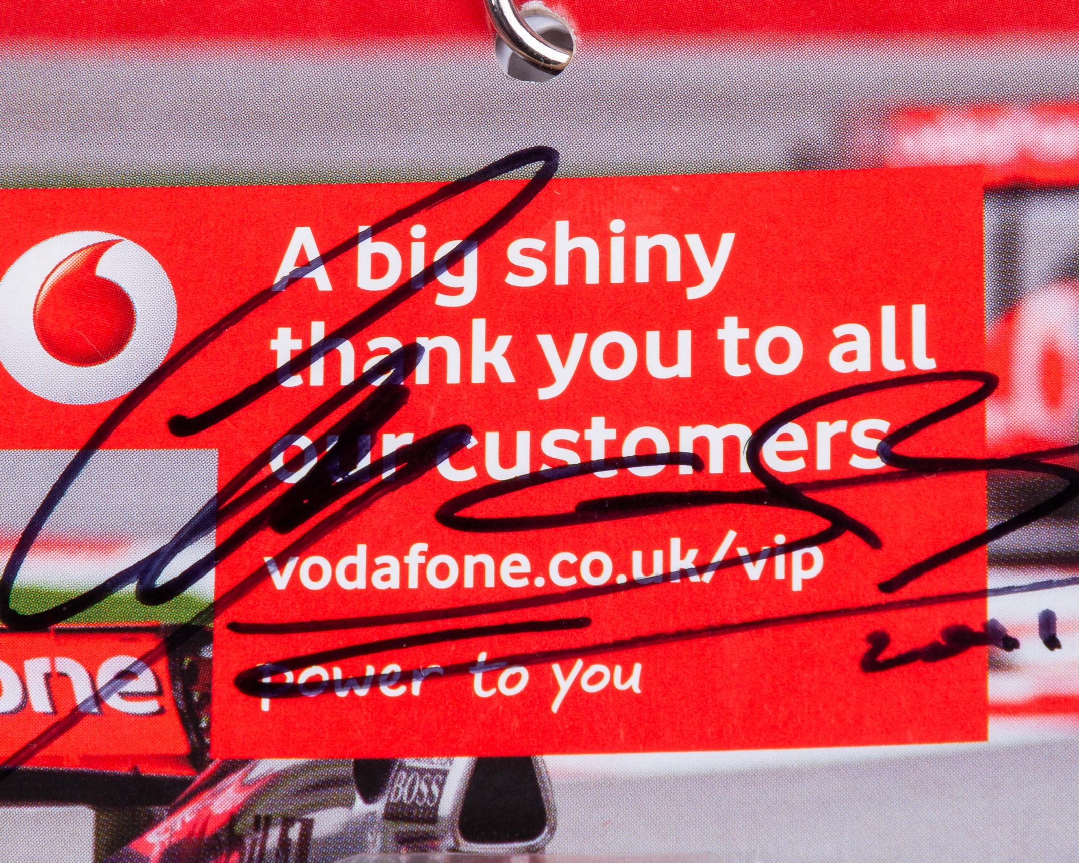 This is a McLaren factory pass personally signed by F1 World Champion, Nigel Mansell. Complete with a piece of a 2011 Vodafone McLaren Mercedes MP4-26 car, driven by Lewis Hamilton and Jenson Button.