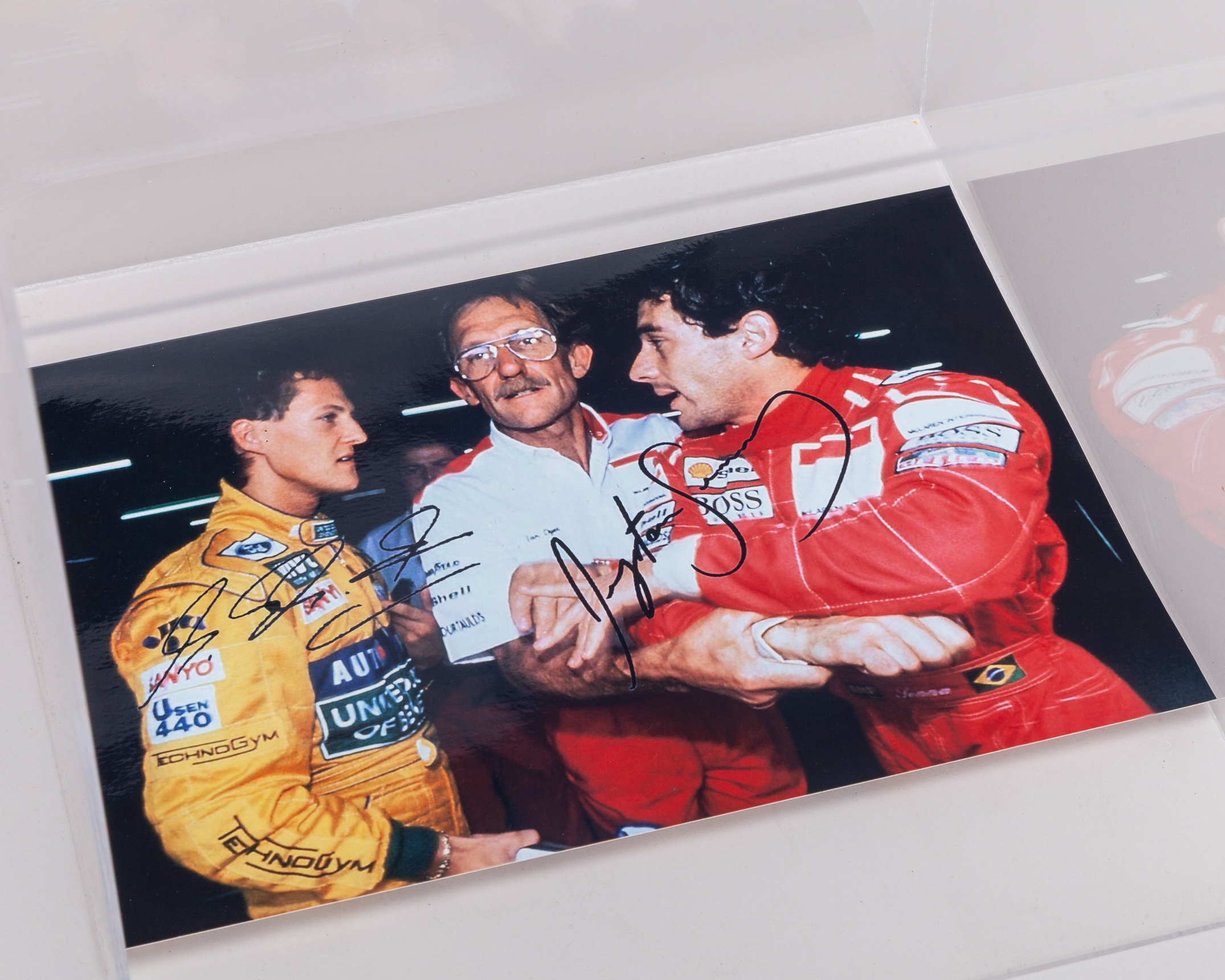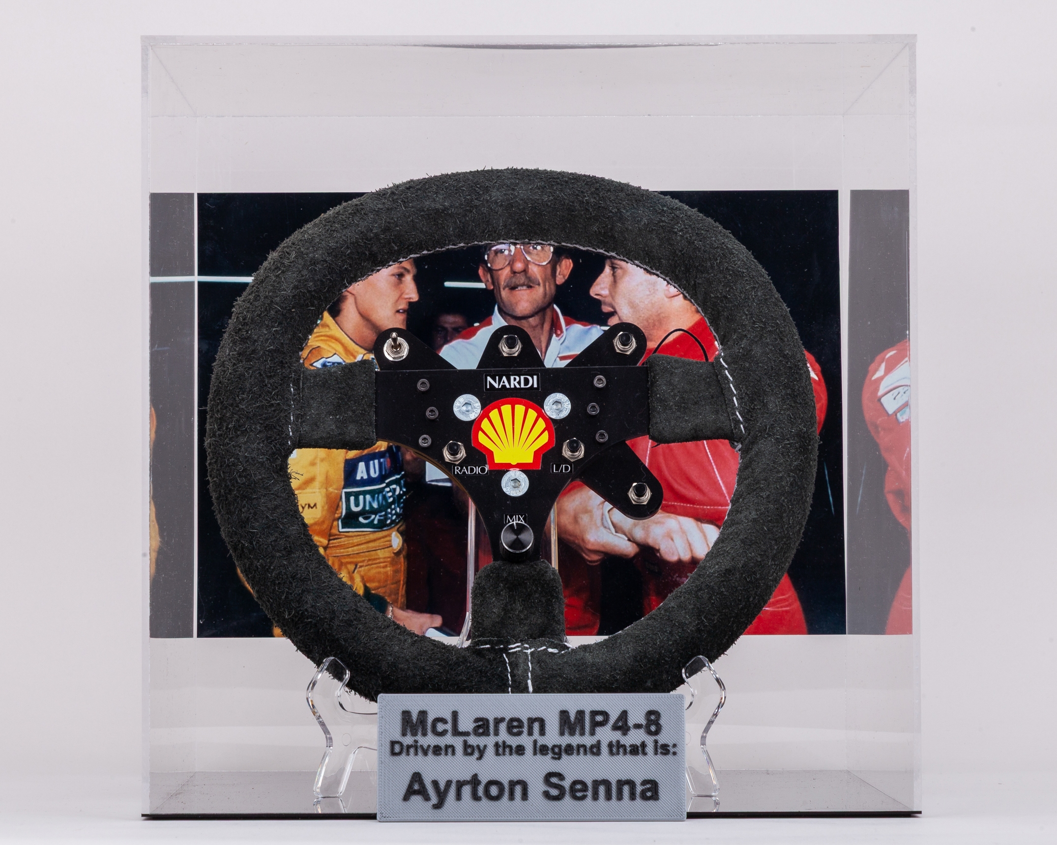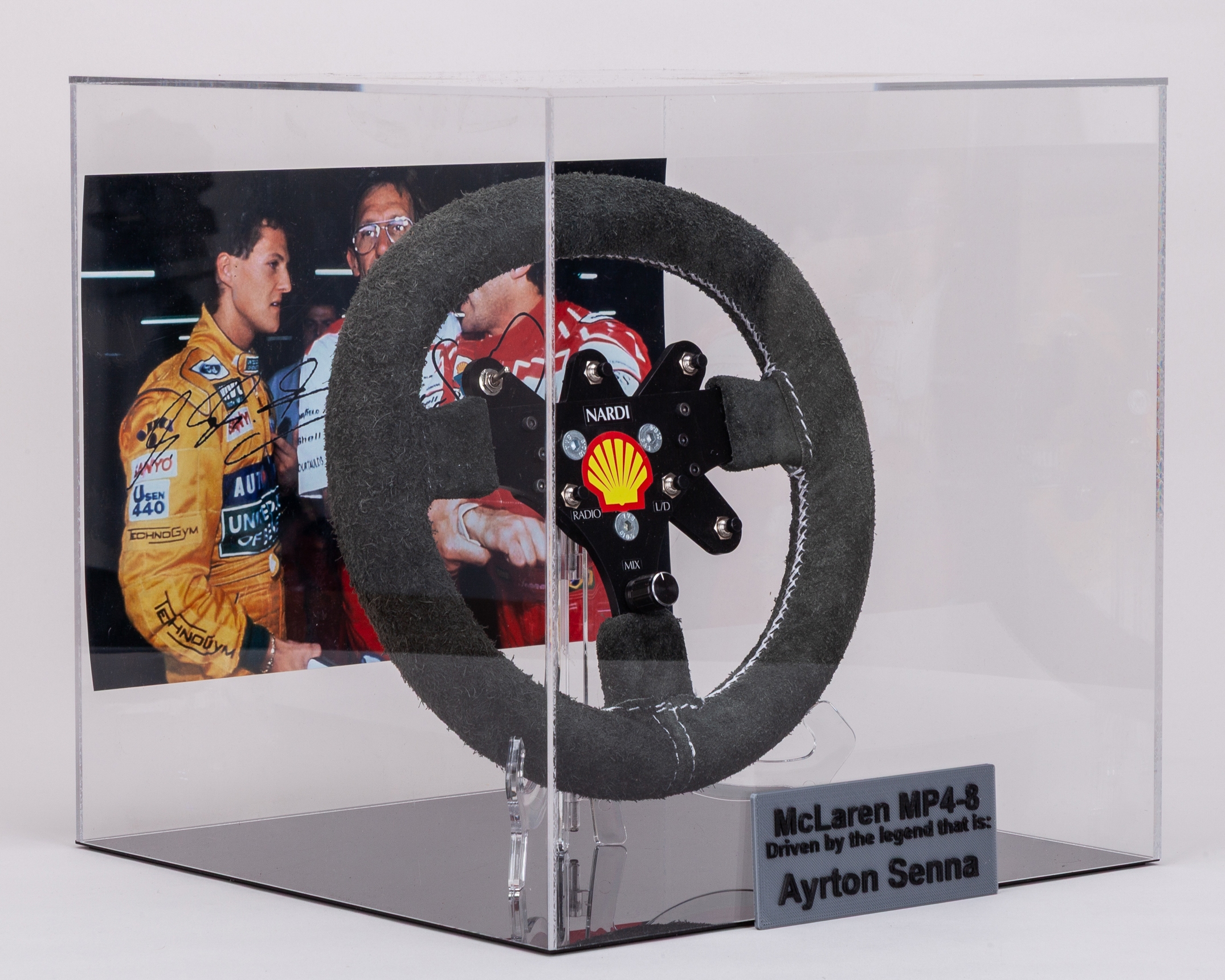 This display is complete with a steering wheel holder, printed signatures and display of Ayrton Senna and Michael Schumacher.
