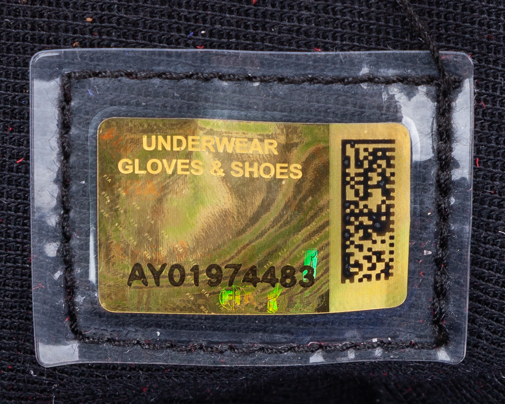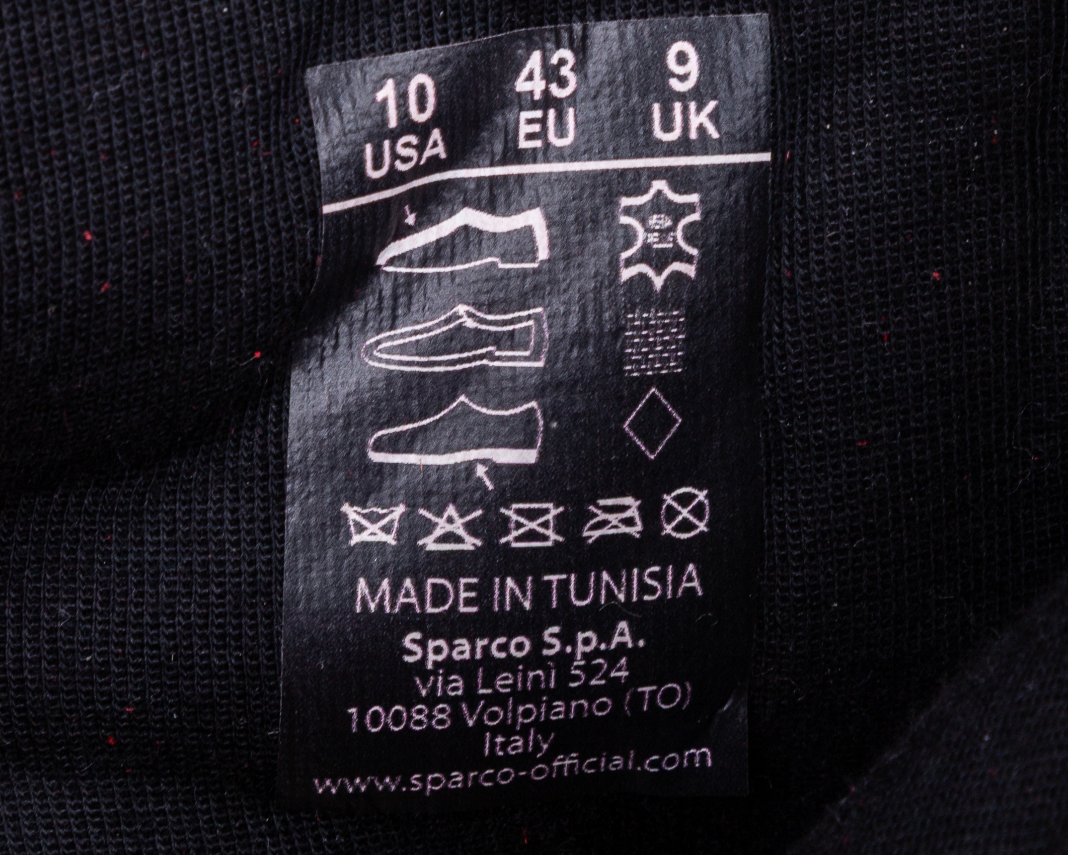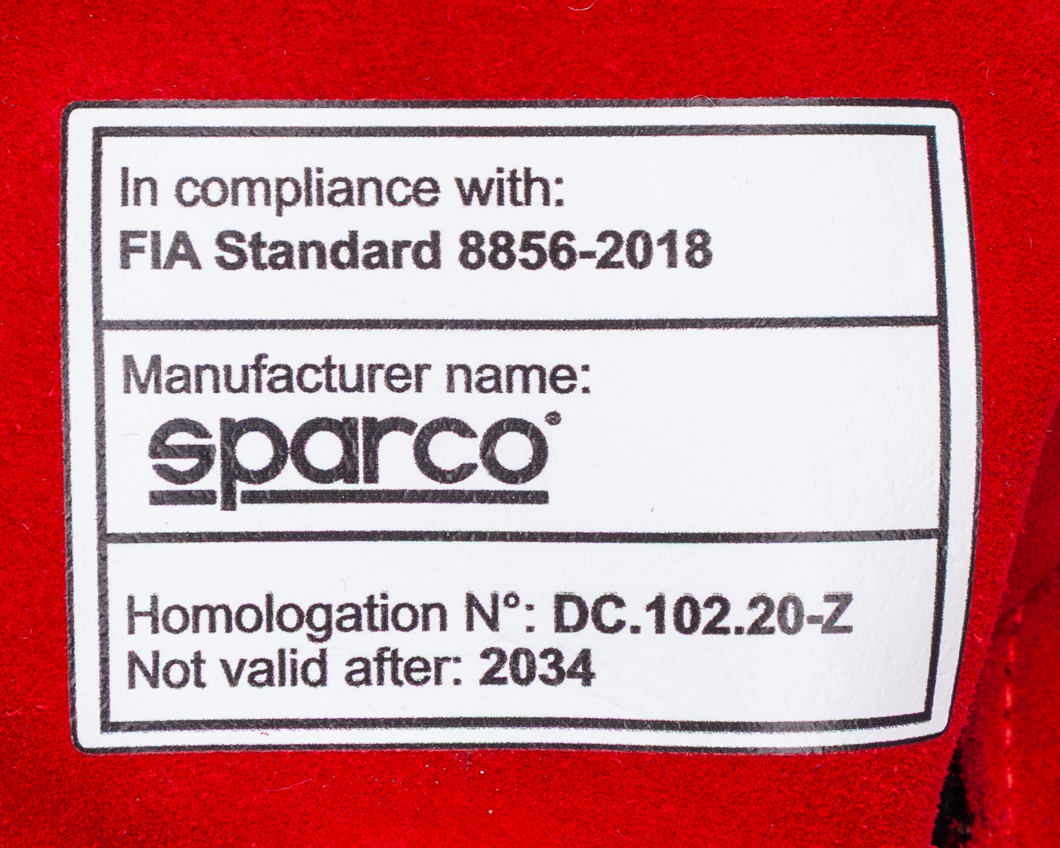 The Sparco white label on each boots reads: In compliance with: FIA Standard 8856-2018 / Manufacturer name: Sparco / Homologation No: DC.012.20-Z / Not valid after: 2034.