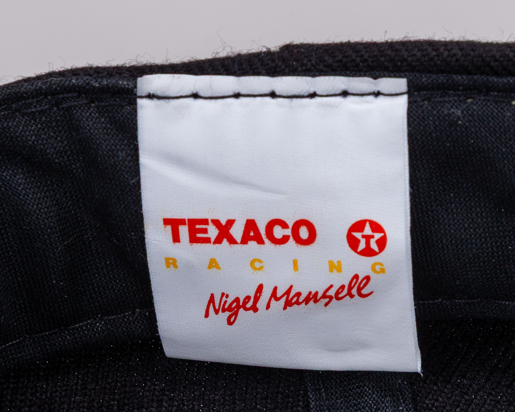 This cap features the bold Texaco branding associated with Mansell’s racing era. The cap is personally hand signed by Nigel.