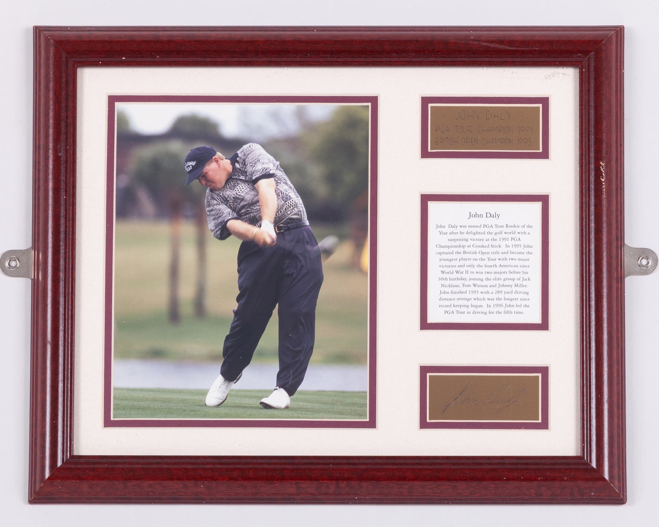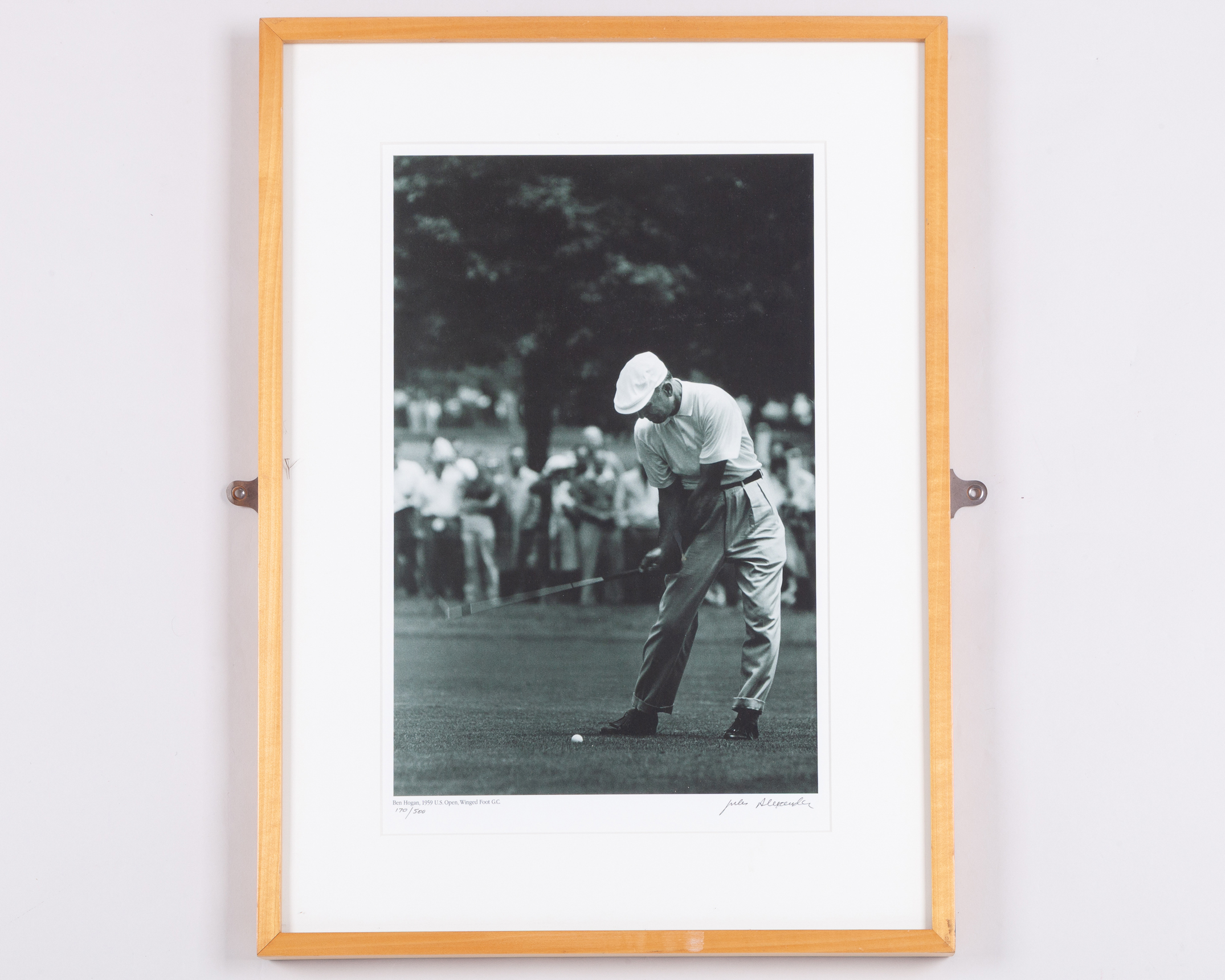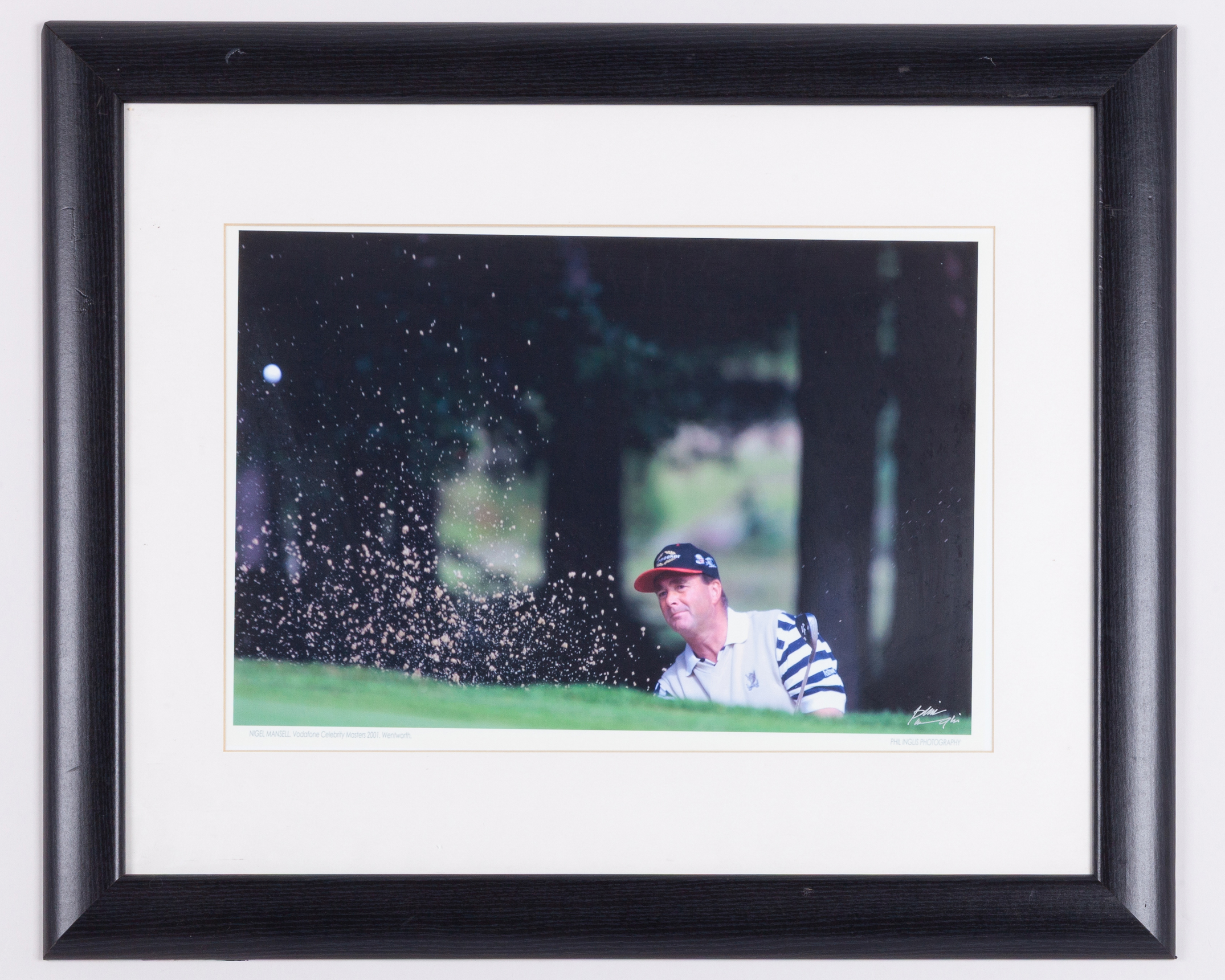 After Michael Heslop - Tiger Woods follow through colour print, 82 x 116cm, framed and glazed, Jules Alexander, A Study in Power, Ben Hogan, 1959 US Open,No.170 of an edition of 500, 58 x 43cm, two Nigel Mansell golf prints and John Daly and Jean van de Velde prints with etched autographs (6).