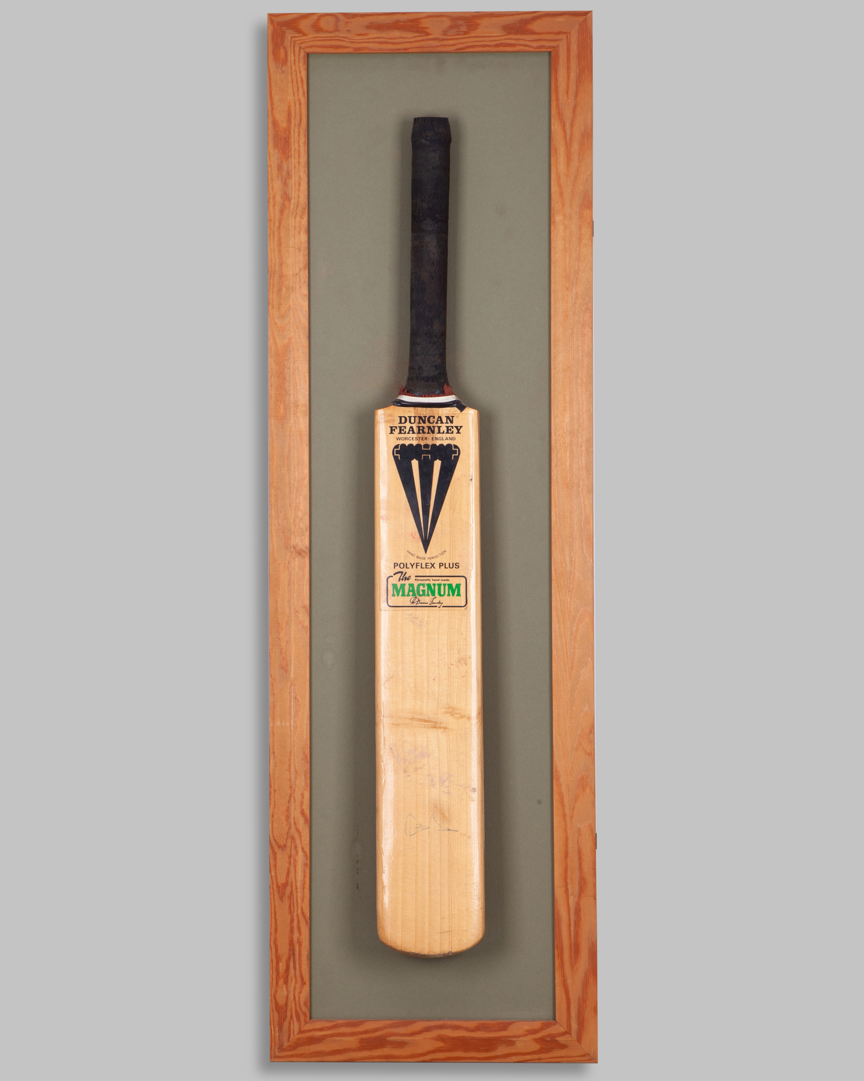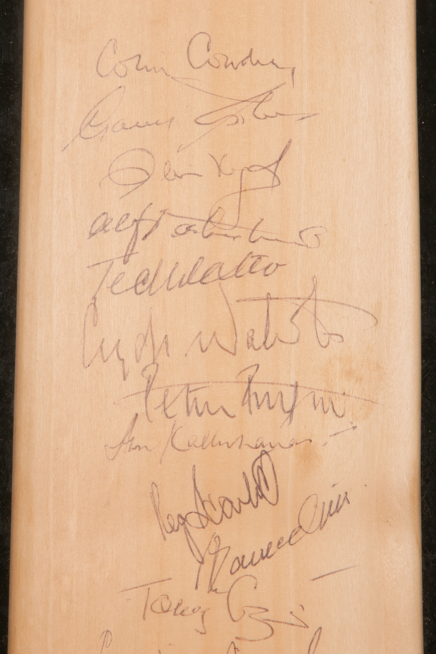A Grays-Nicolls autographed cricket bat, the bat bearing twenty-four autographs including Colin Cowdry, mounted, in presentation case, 36 x 19cm and a Duncan Fearnley Magnum autographed cricket bat, mounted (2).