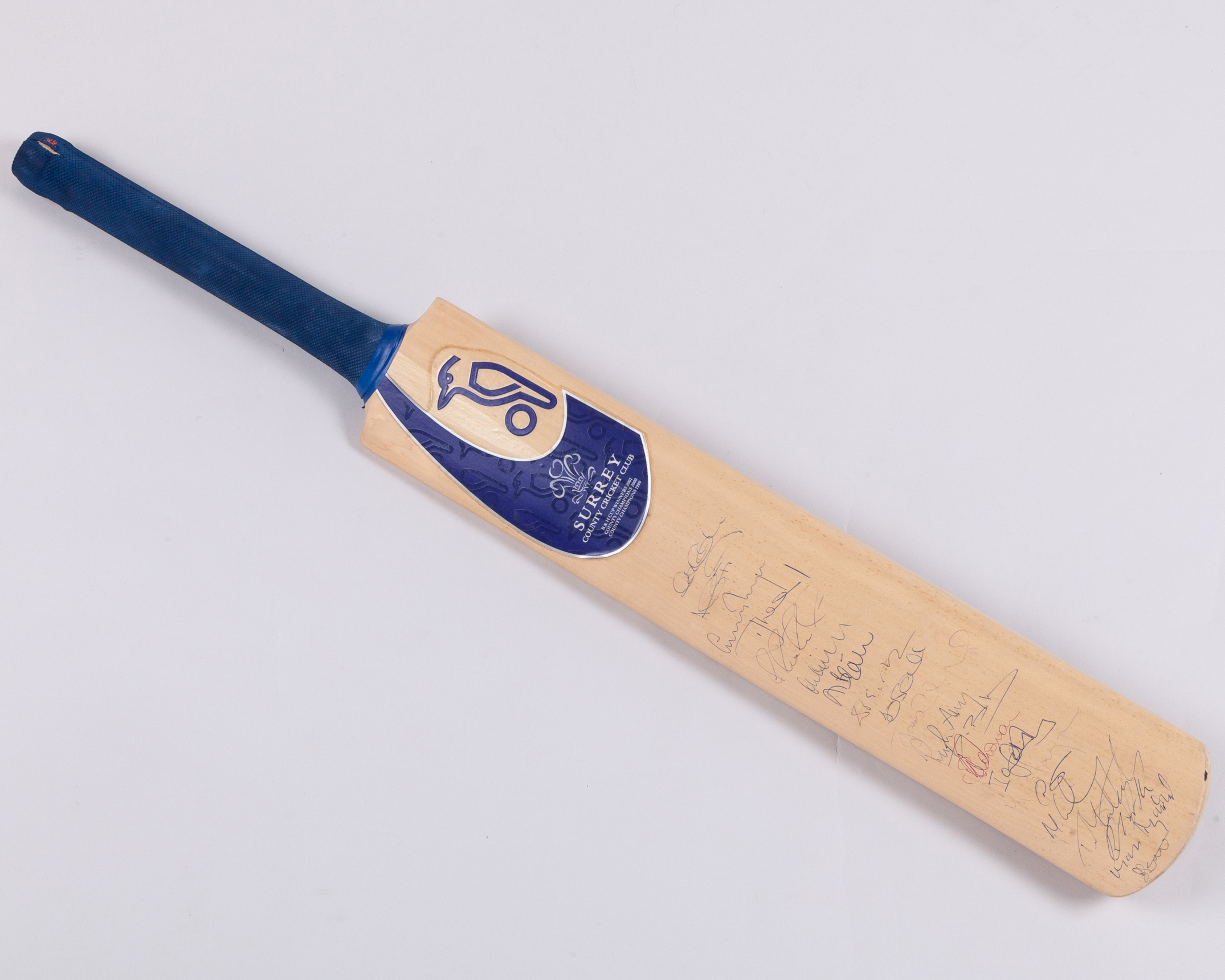 A Surrey County Cricket Club autographed cricket bat, bearing twenty autographs.
