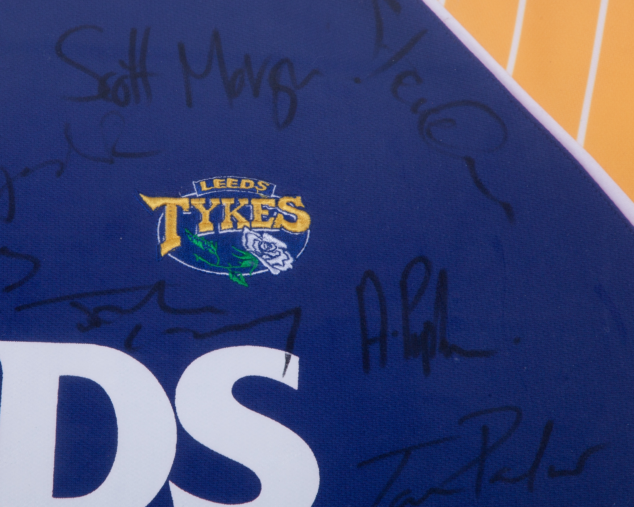 A blue and yellow Leeds Tykes autographed shirt, the front of the shirt bearing eighteen autographs, framed and glazed, 108 x 90cm.