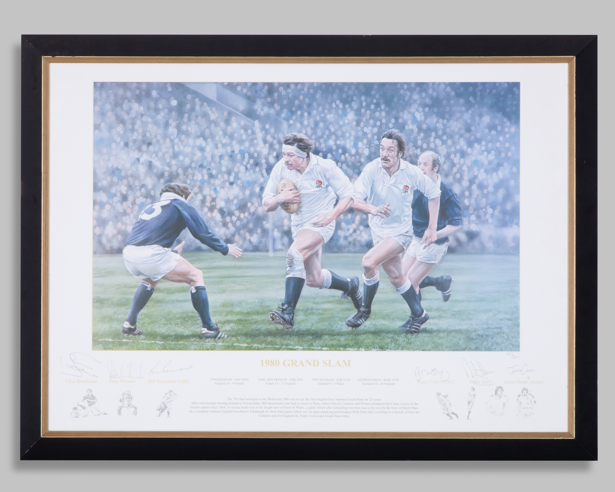 1980 Grand Slam by James Owen England Rugby Union autographed limited edition print, 161/ 360, with five autographs including Clive Woodward, Peter Wheeler, Bill Beaumont, Roger Uttley and Dusty Hare, framed and glazed, 77 x 57cm.