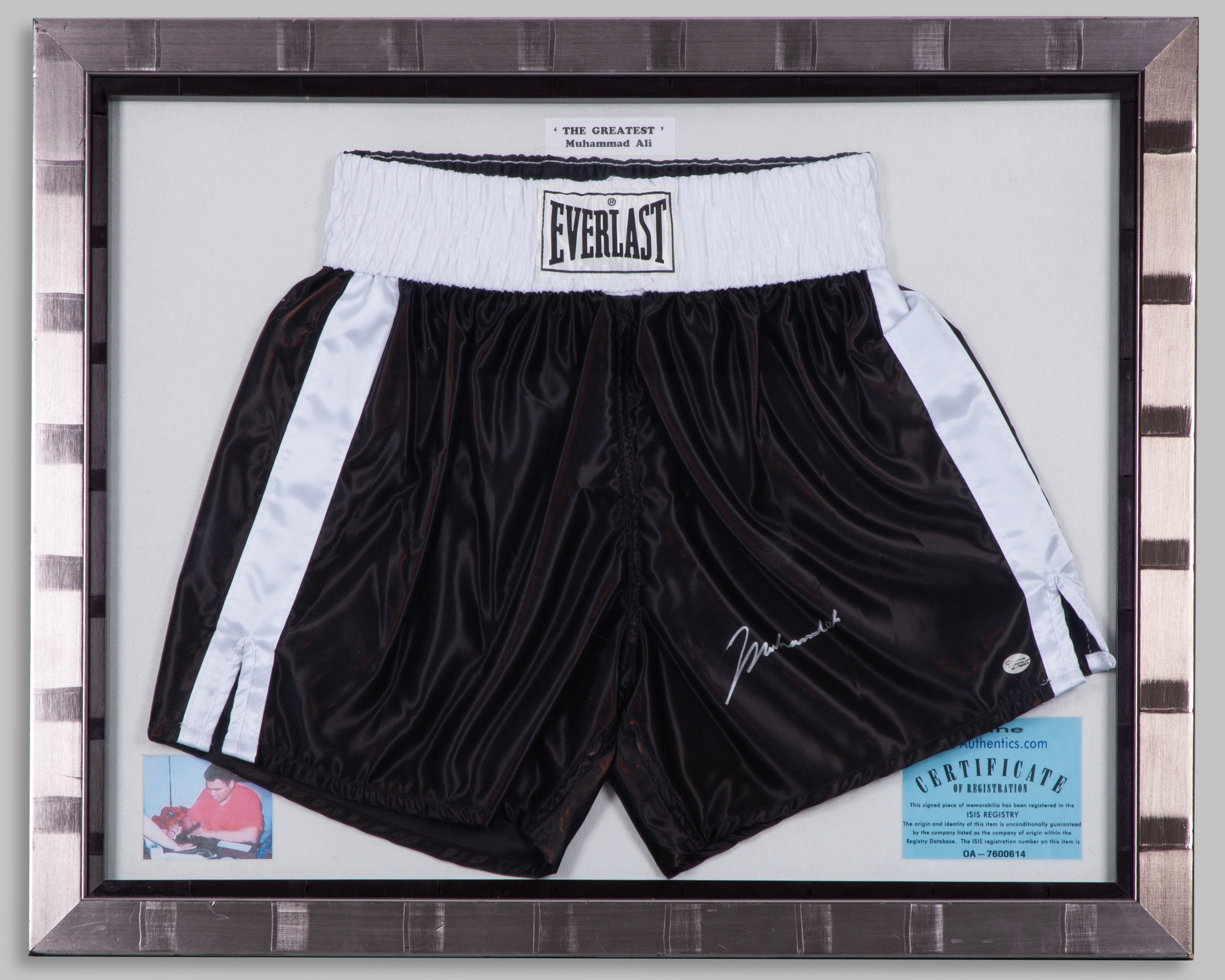 A pair of Everlast Muhammad Ali autographed boxing shorts, with COA, framed and glazed, 63 x 78cm.