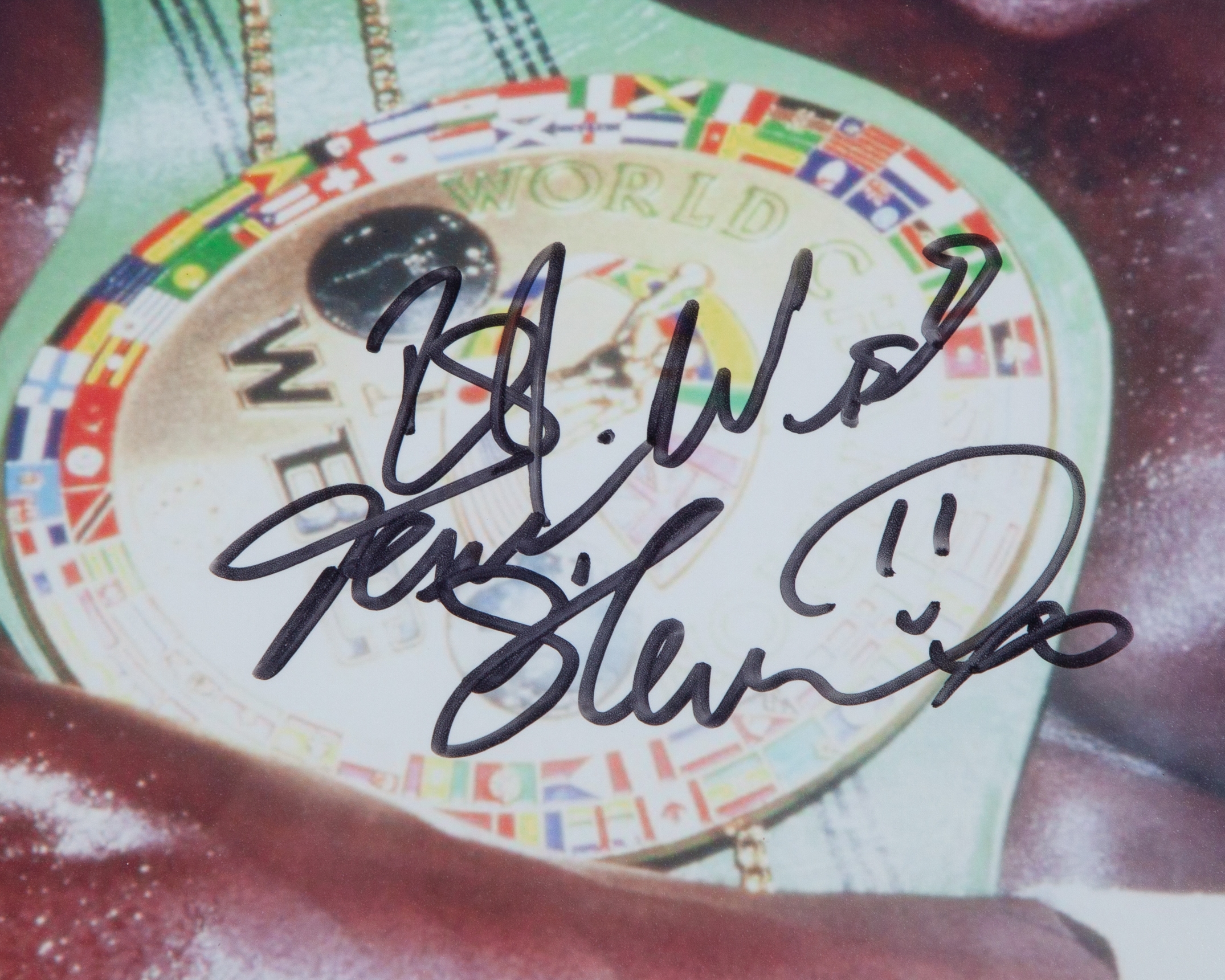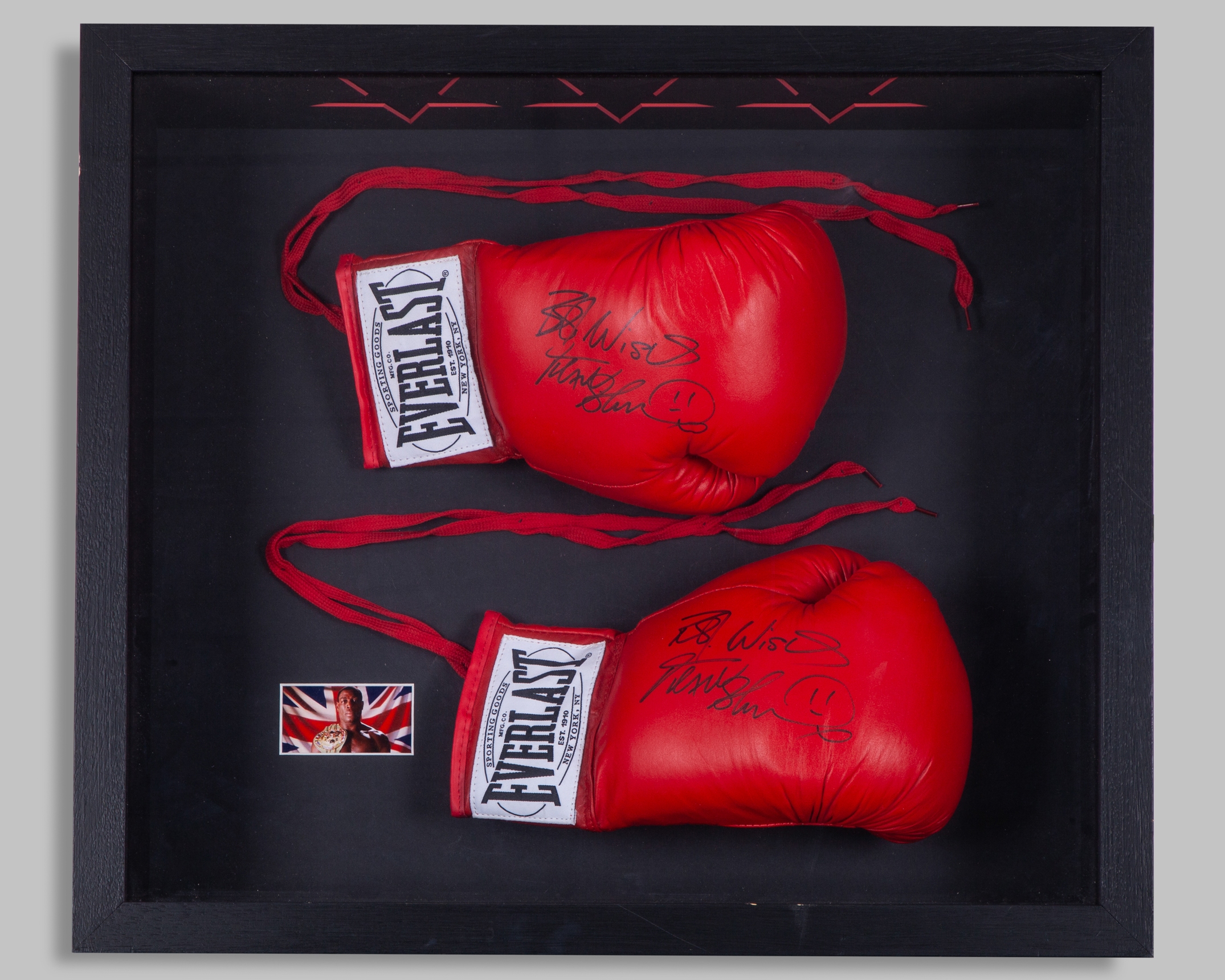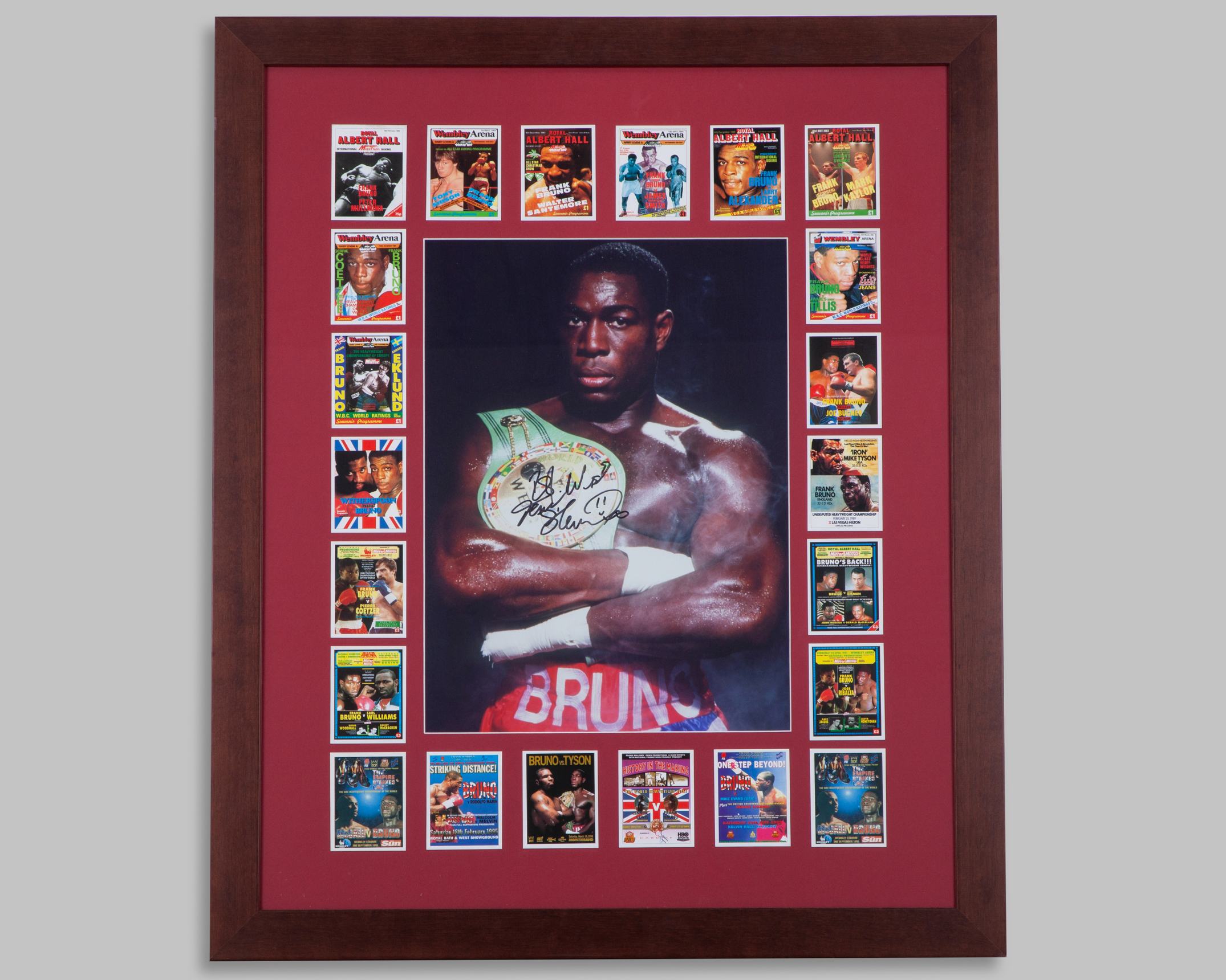 A pair of red Everlast boxing gloves autographed by Frank Bruno, framed and a signed Frank Bruno poster, framed (2).