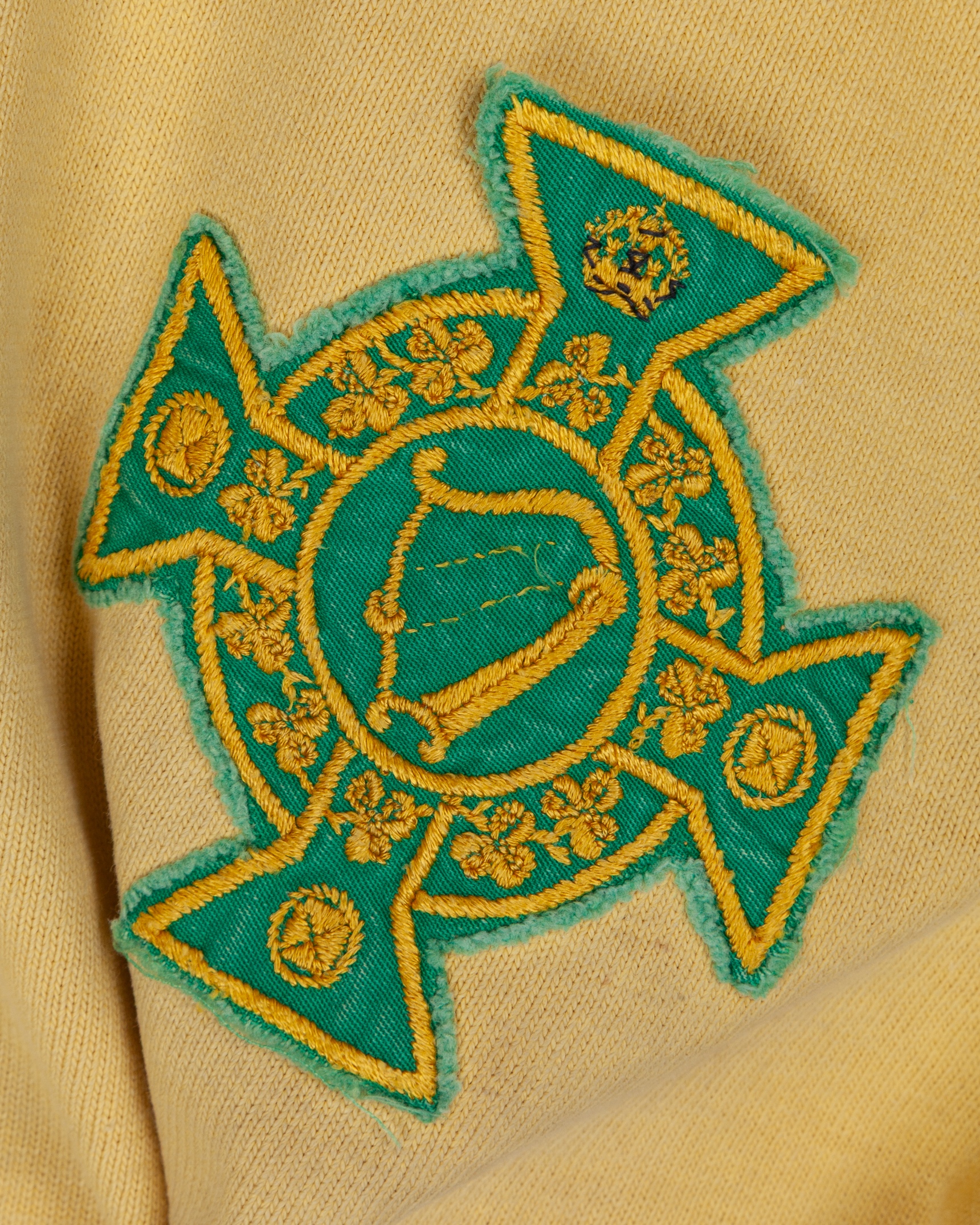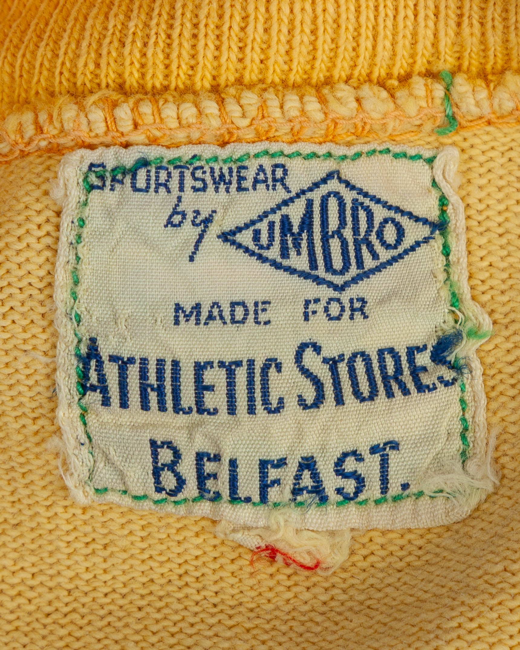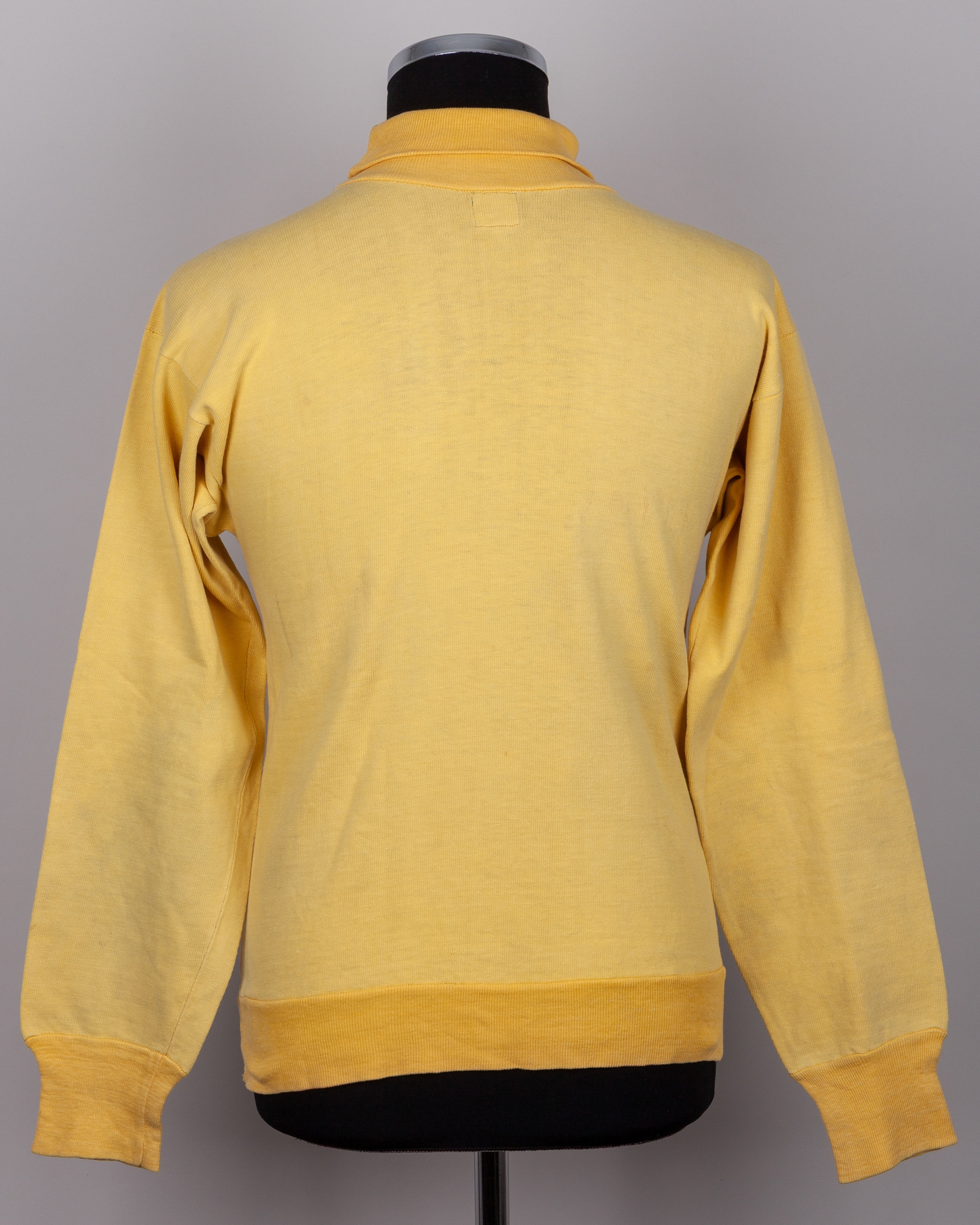 Harry Gregg yellow Northern Ireland goalkeepers shirt, early 1950s, Umbro, with roll-neck collar and embroidered cloth badge, discoloration, areas of staining front and back