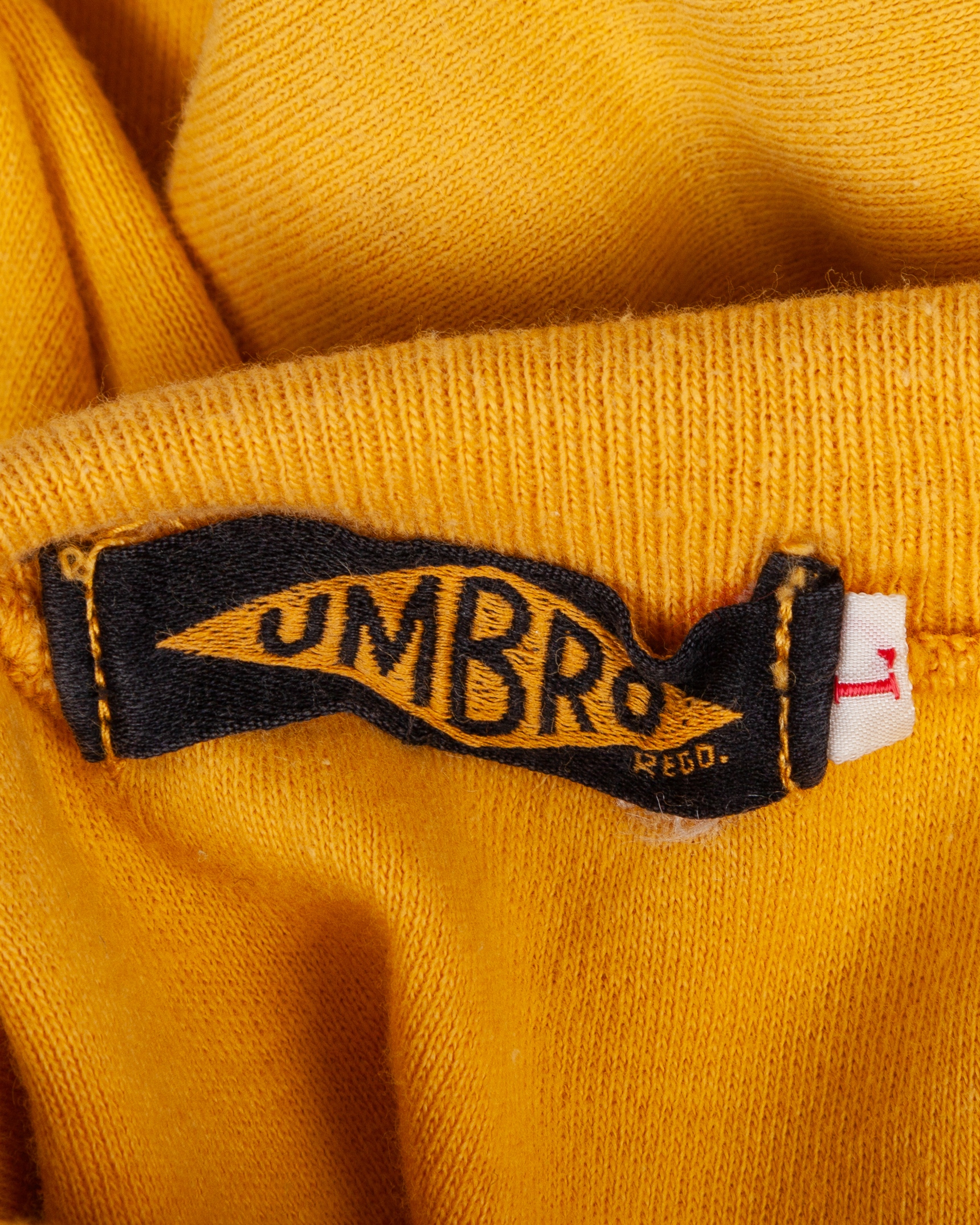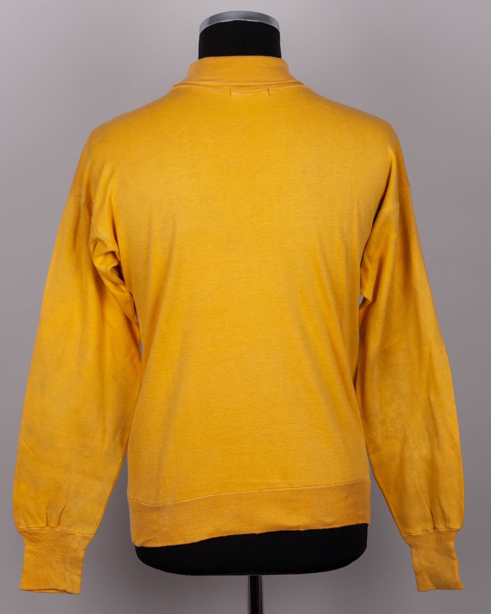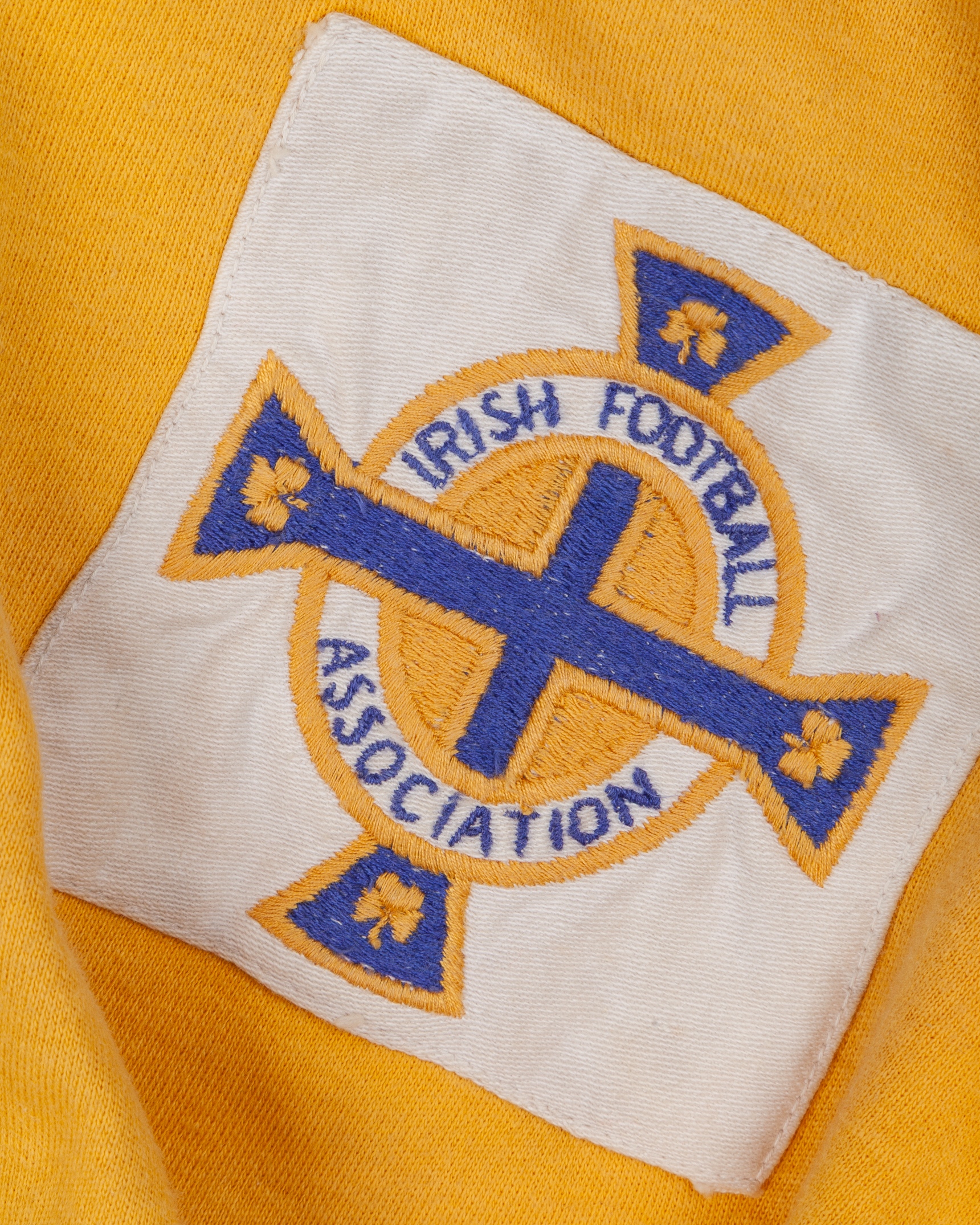 Harry Gregg yellow Northern Ireland match worn goalkeepers shirt, Umbro, L, with roll-neck collar and embroidered cloth badge inscribed IRISH FOOTBALL ASSOCIATION, discolouration and staining